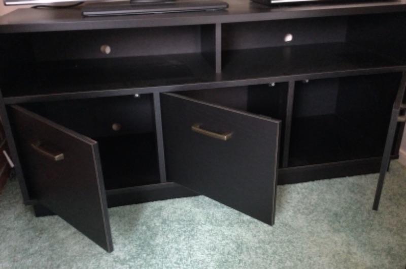 Sony Bravia 32” model KDL-32L 4000, Toshiba DVD Player model SD4000, Black TV stand has 3 doors/cabinets, 2 shelves and holes in the back for cords to pass through. TV stand measures 47.5” long 22” tall 15.5” deep