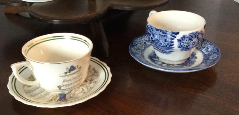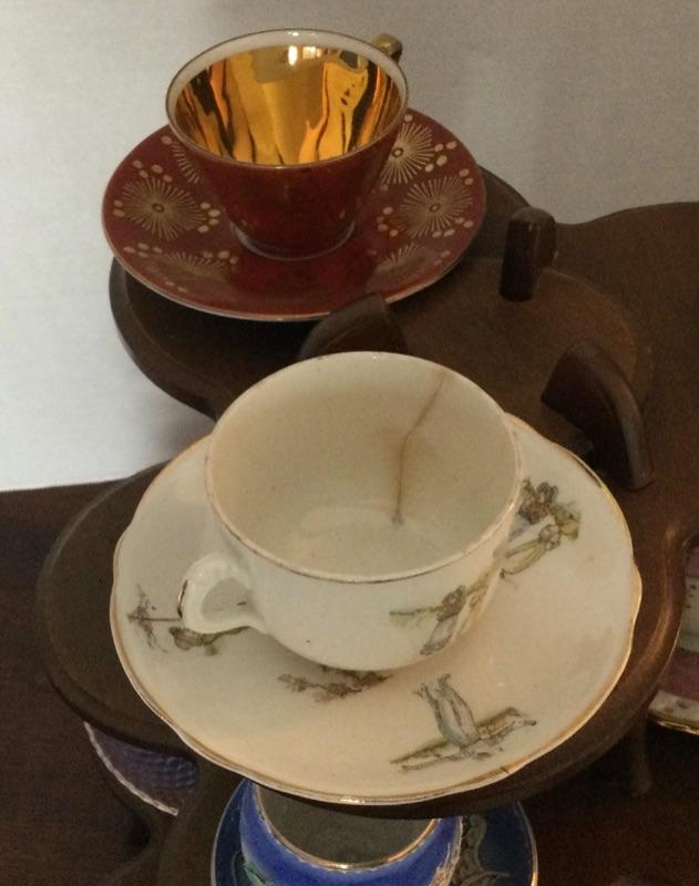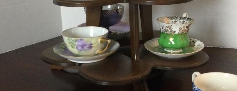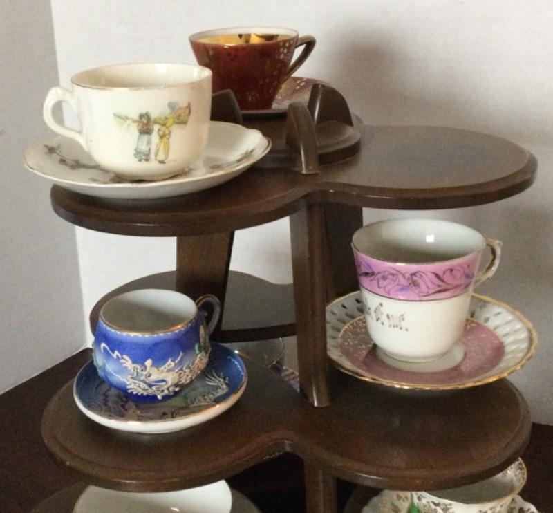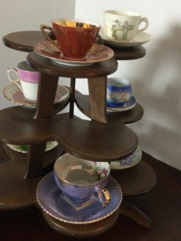 Wood three tier display stand with nine assorted teacups and saucers. One cup has a crack (see photos) 12.5” tall and 15” wide at widest point