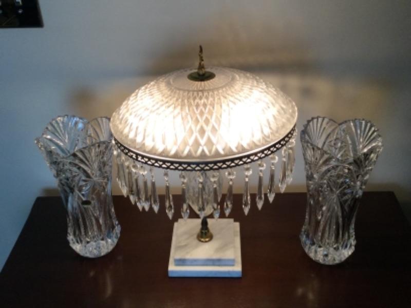 Marble base lamp with glass shade and prisms 19” tall. Pair of French Crystal Vases 11.75” tall