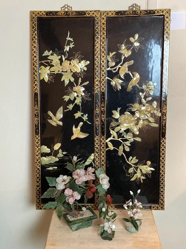 B-338 Pair of Asian Wall Hangings Two & Jade Flower Arrangements