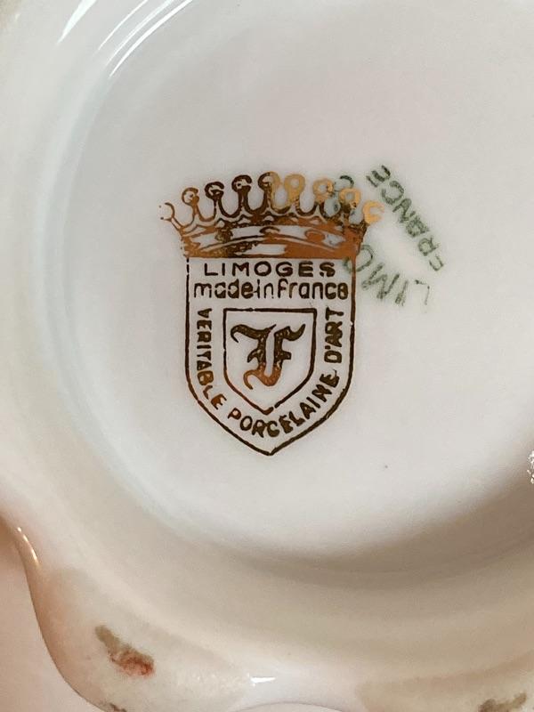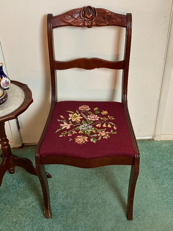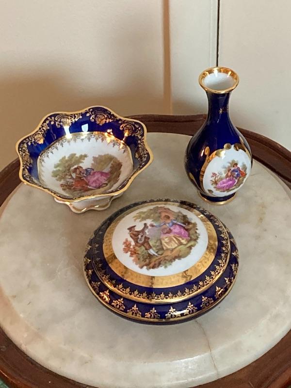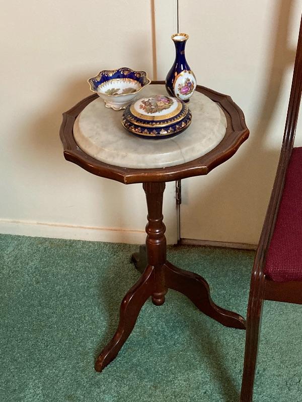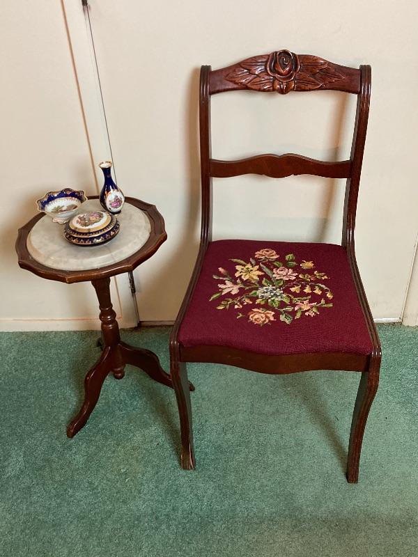 Hand Carved needlepoint chair 33.5” tall 17” wide 19” deep , marble top table 21” tall and 14” round and three piece Limoges vase, dish and bowl with lid