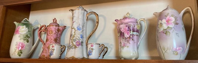 Lot of 5 vintage Chocolate Pots. Nippon pot comes with 4 matching demitasse cups. One marked Bavaria and three unmarked