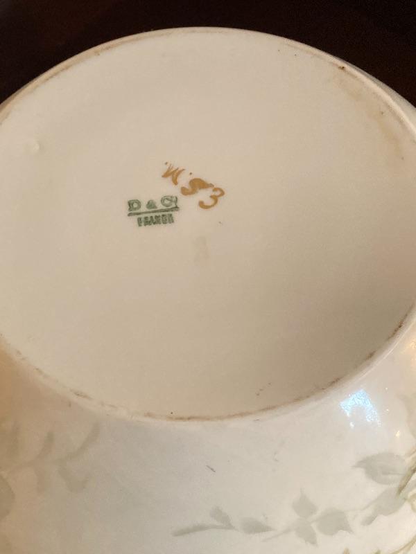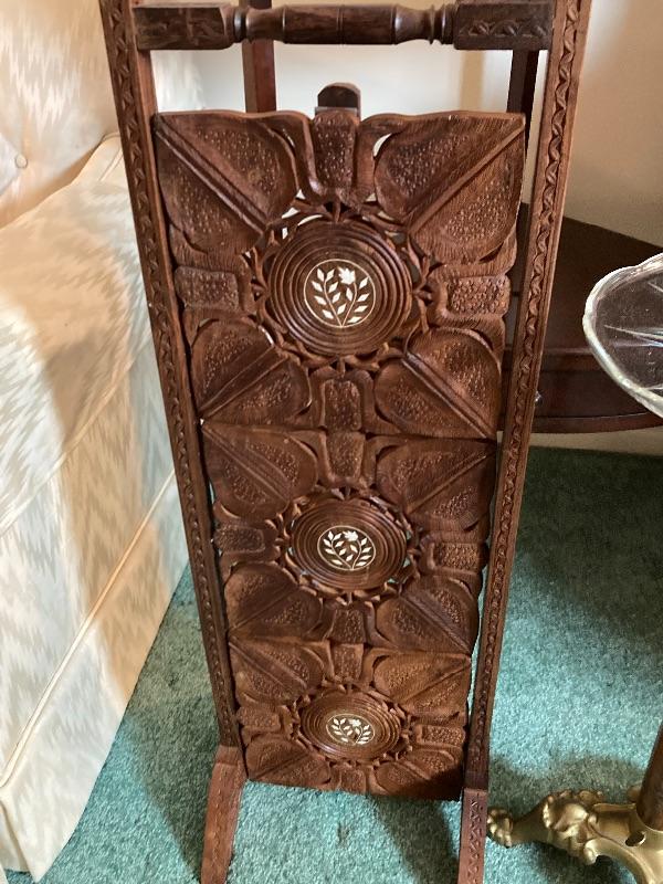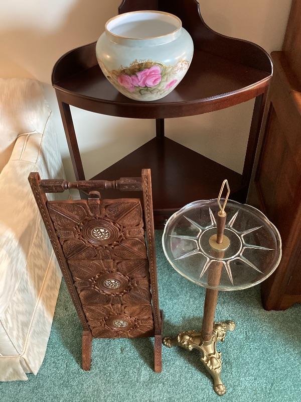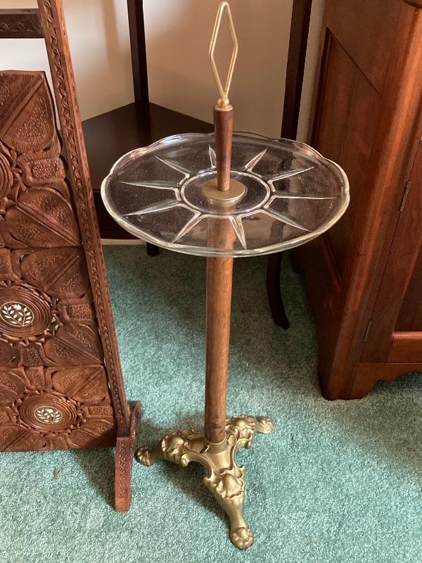 Butlers Stand is made of glass, brass and wood and measures 30.5” tall and 11” wide. Three tiered carved wood tilt top muffin stand measures 31” tall and 10.5” wide. Limoges Jardinere