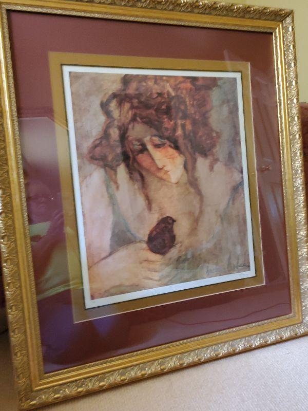 B3-6: Barbara A. Wood Signed Print Beautiful Woman w/ Bird