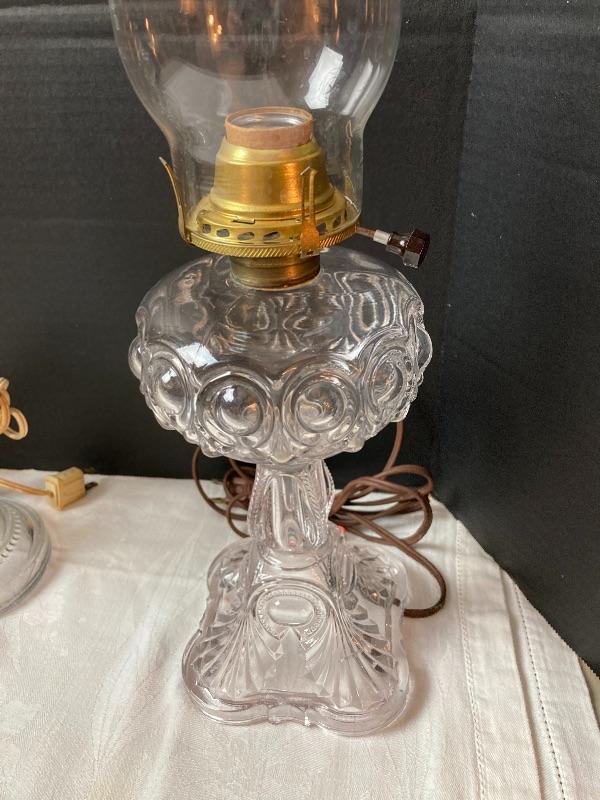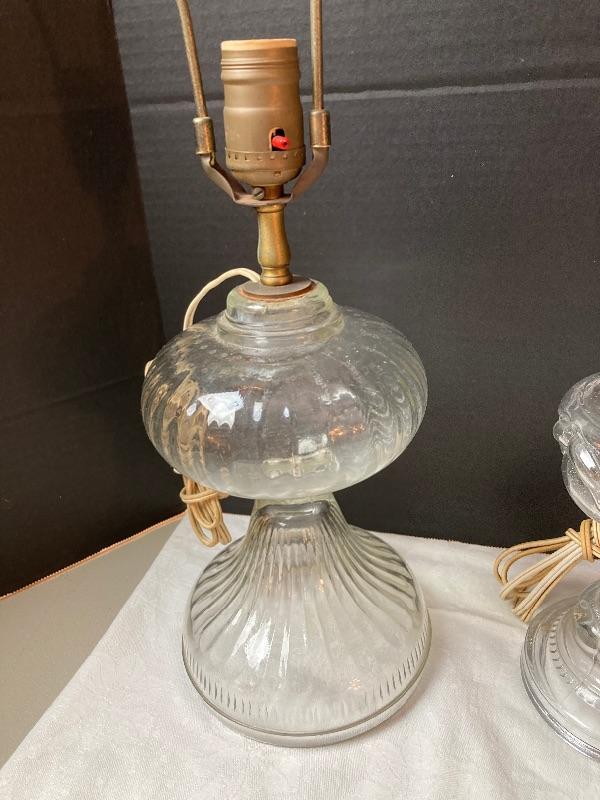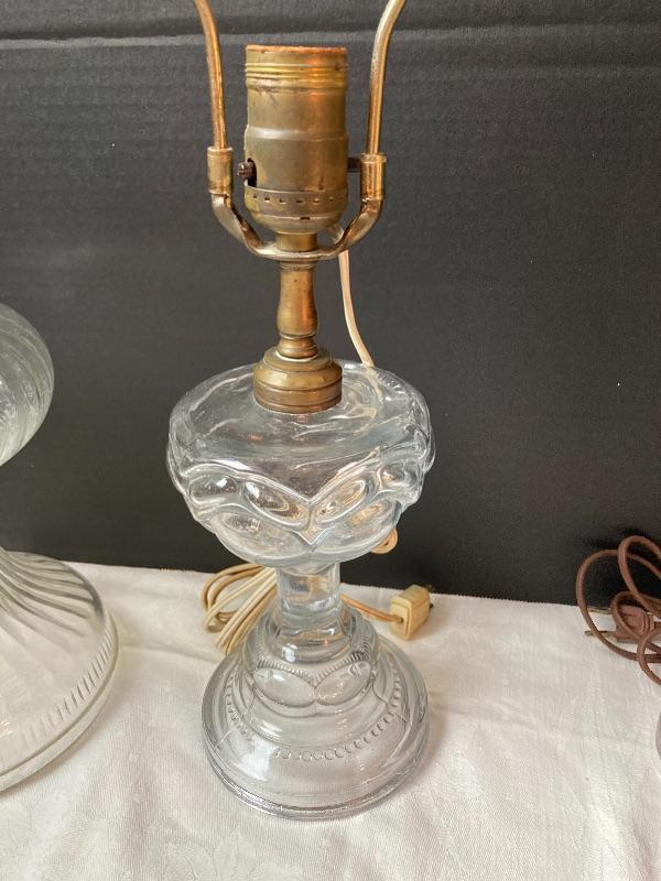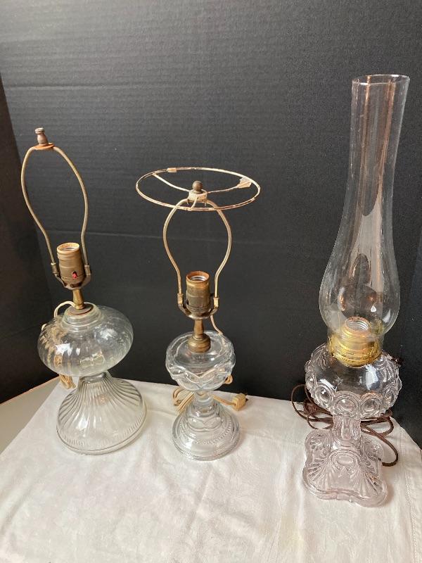 Three vintage glass oil lamps that have been converted to electric. Only one has a globe