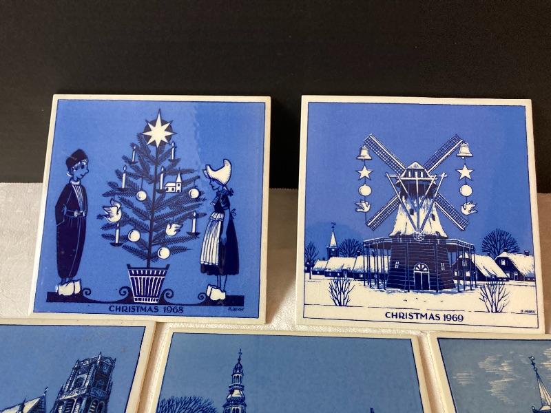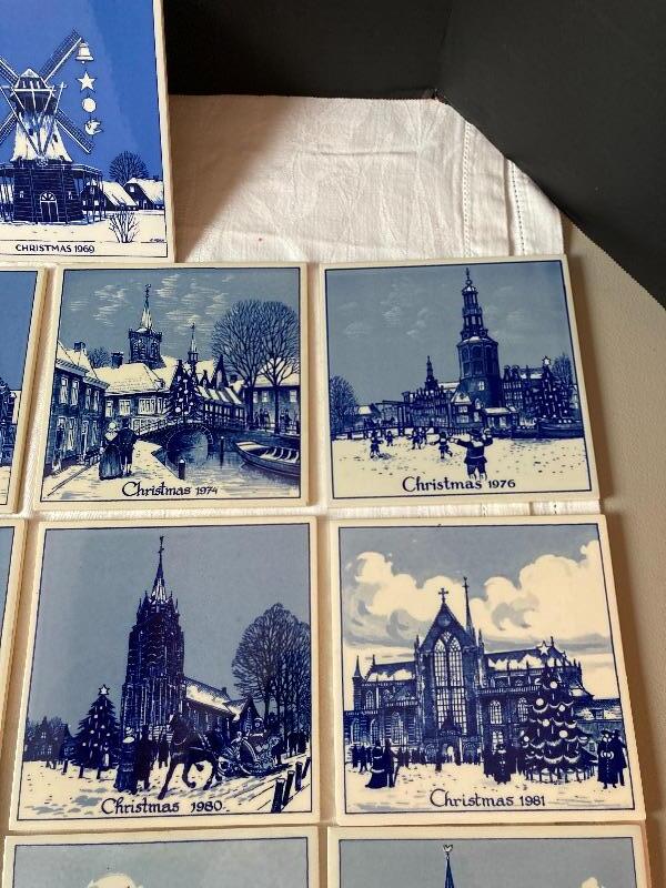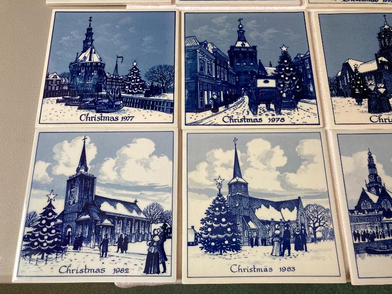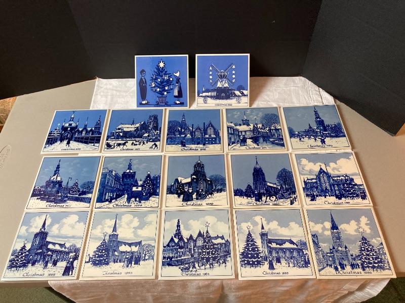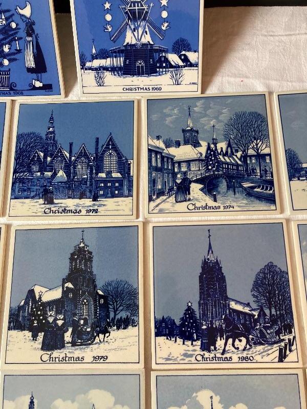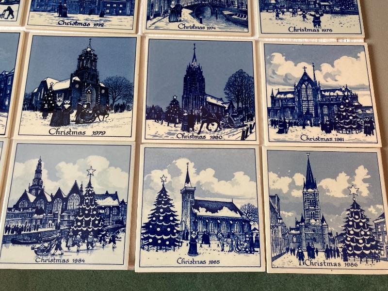 Vintage Delft Schoonhoven Holland handmade blue and white annual Christmas tiles. 17 tiles total. Years are 1968,1969,1970,1971,1972,1974,1976,1977,1978,1979,1980,1981,1982,1983,1984,1985,1986