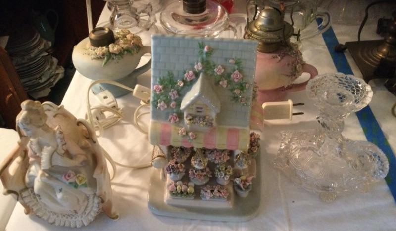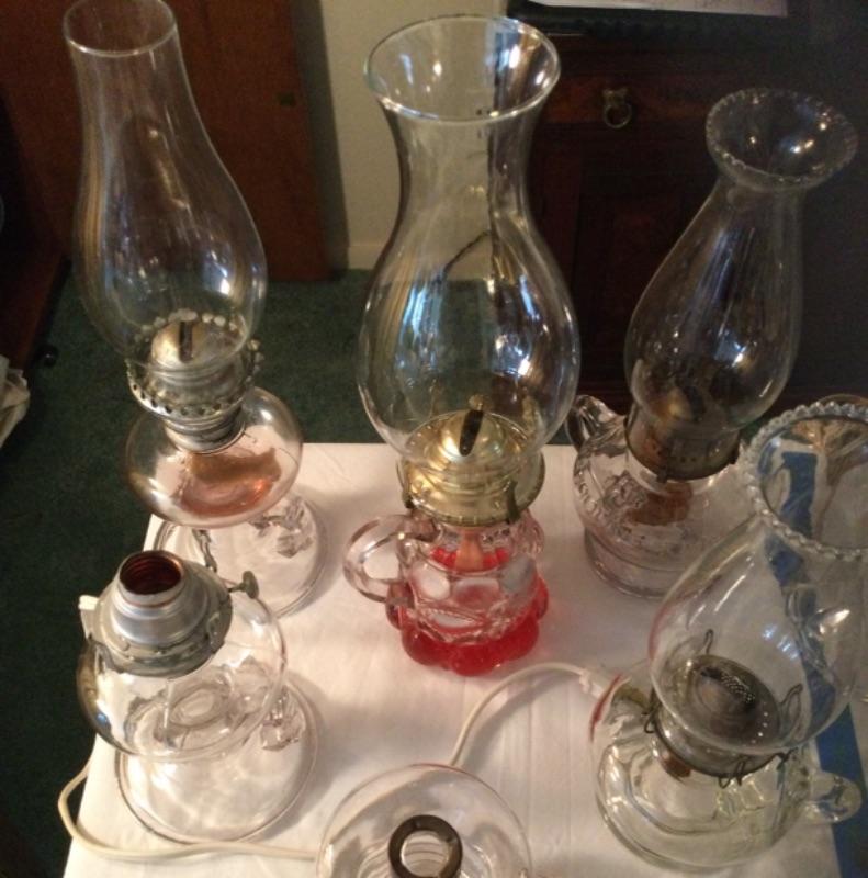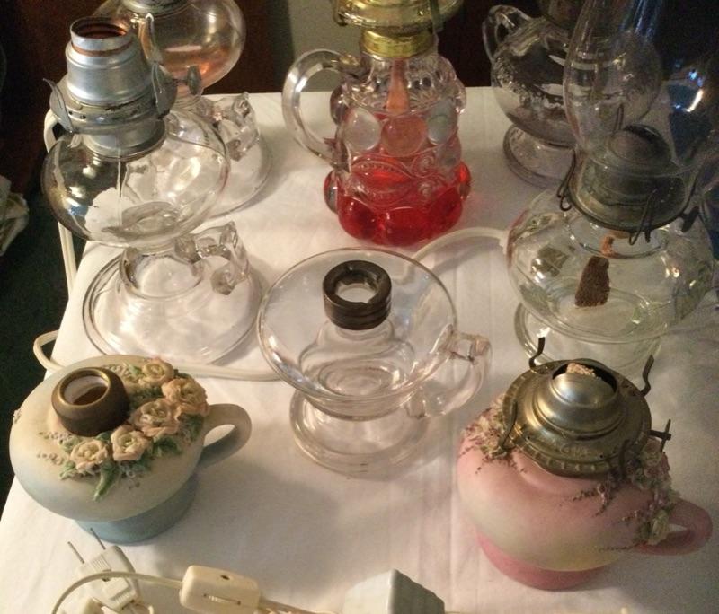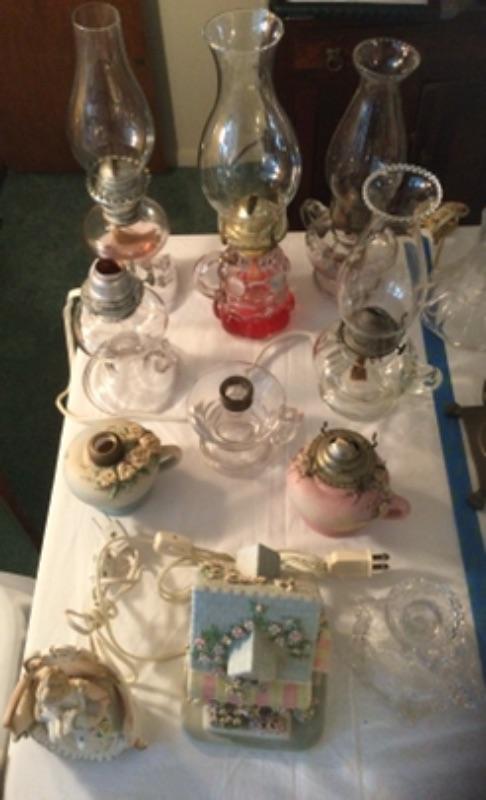 Four vintage finger oil lamps, one is just the base, two ceramic oil lamp bases,one vintage glass lamp base, two ceramic nightlights and glass candlestick