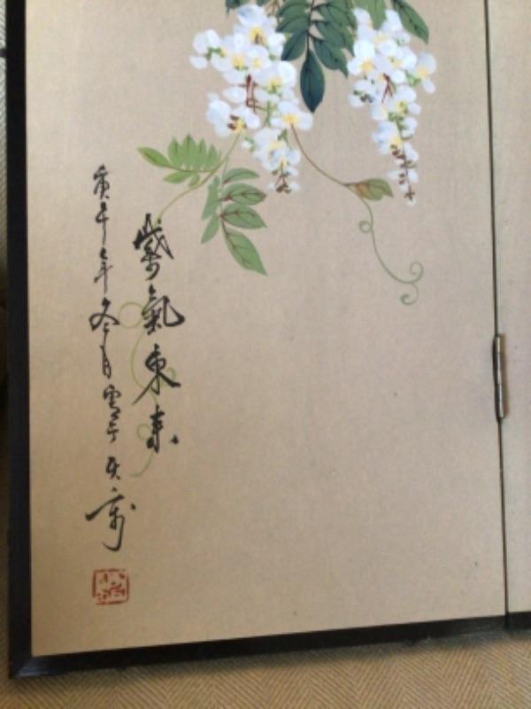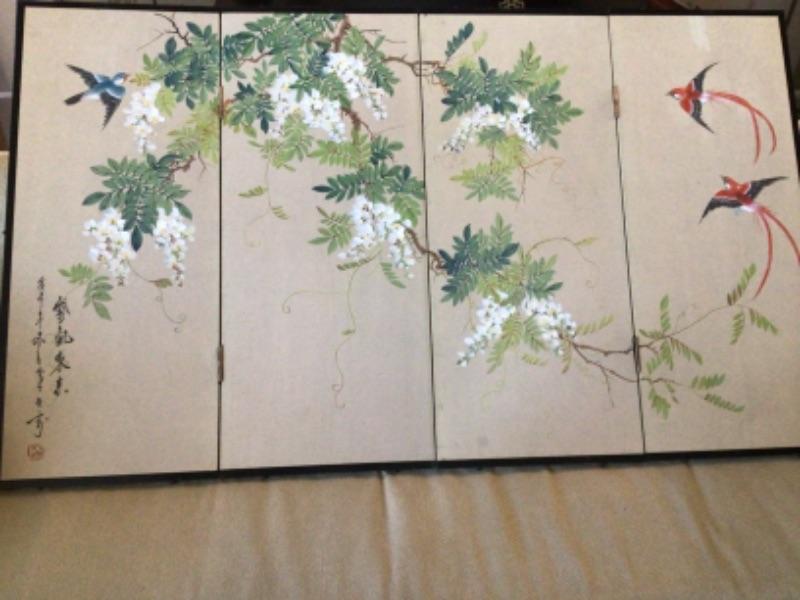 B - 413: Four Panel Hand painted Japanese Bird Decorative Screen