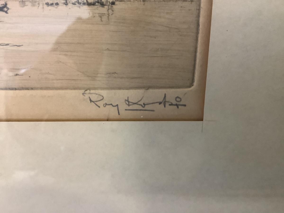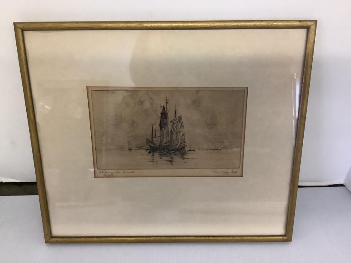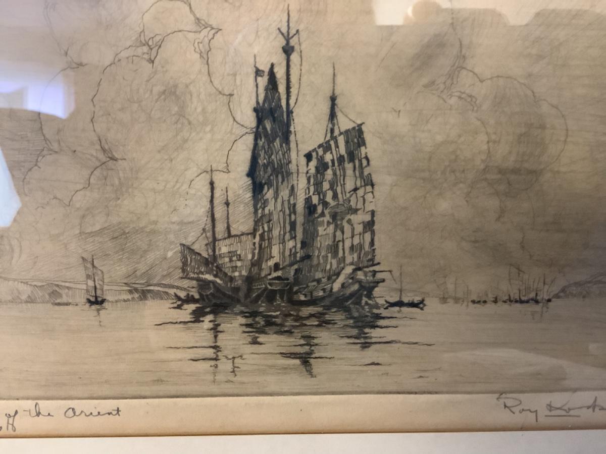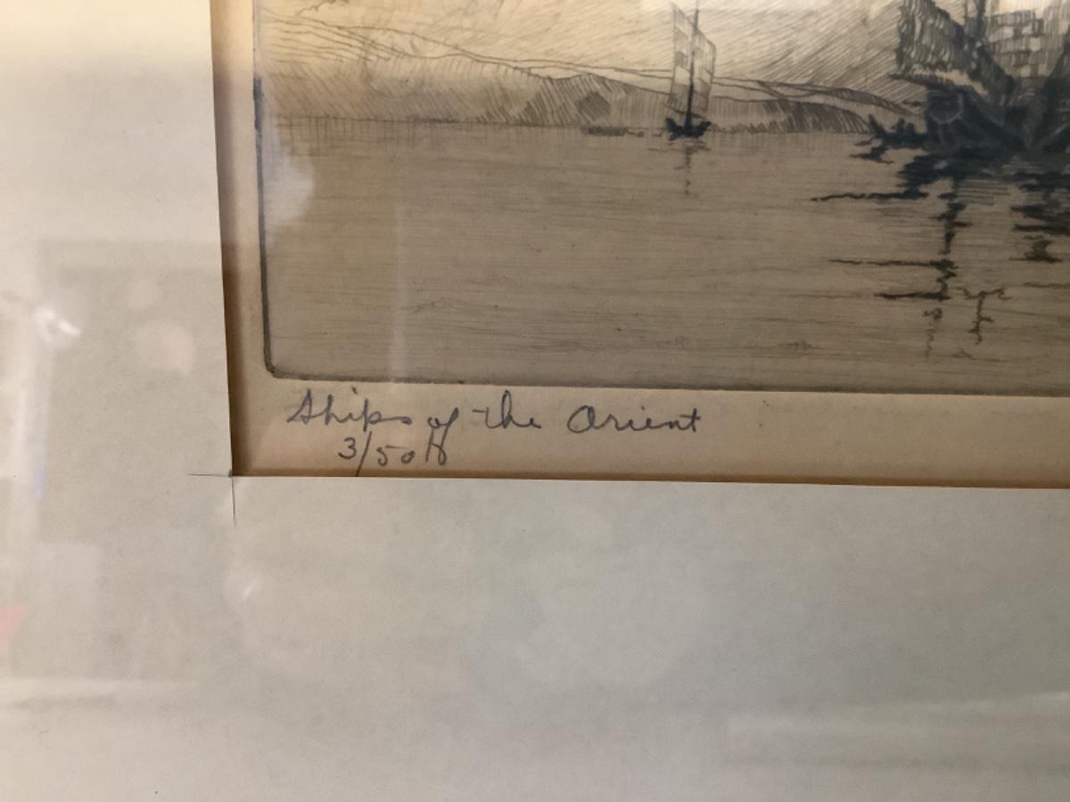 B452 Vintage Signed Etching “Ships of the Orient” by Roy Koski
