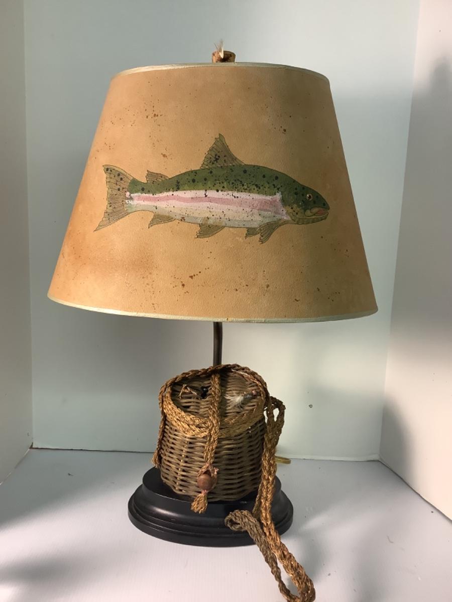 Very nice fishing creel lamp with small fishing lure accents on basket and shade finial. Hand painted fish on shade , signed on back