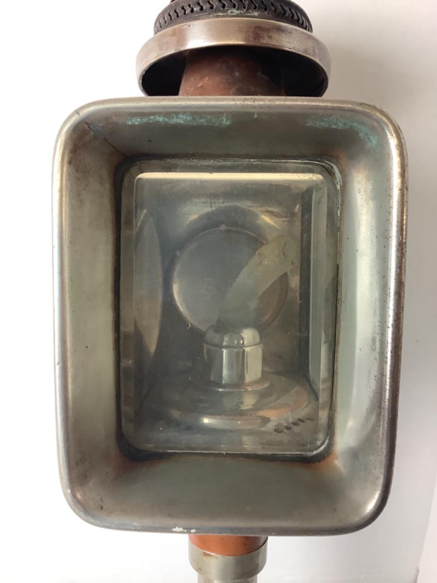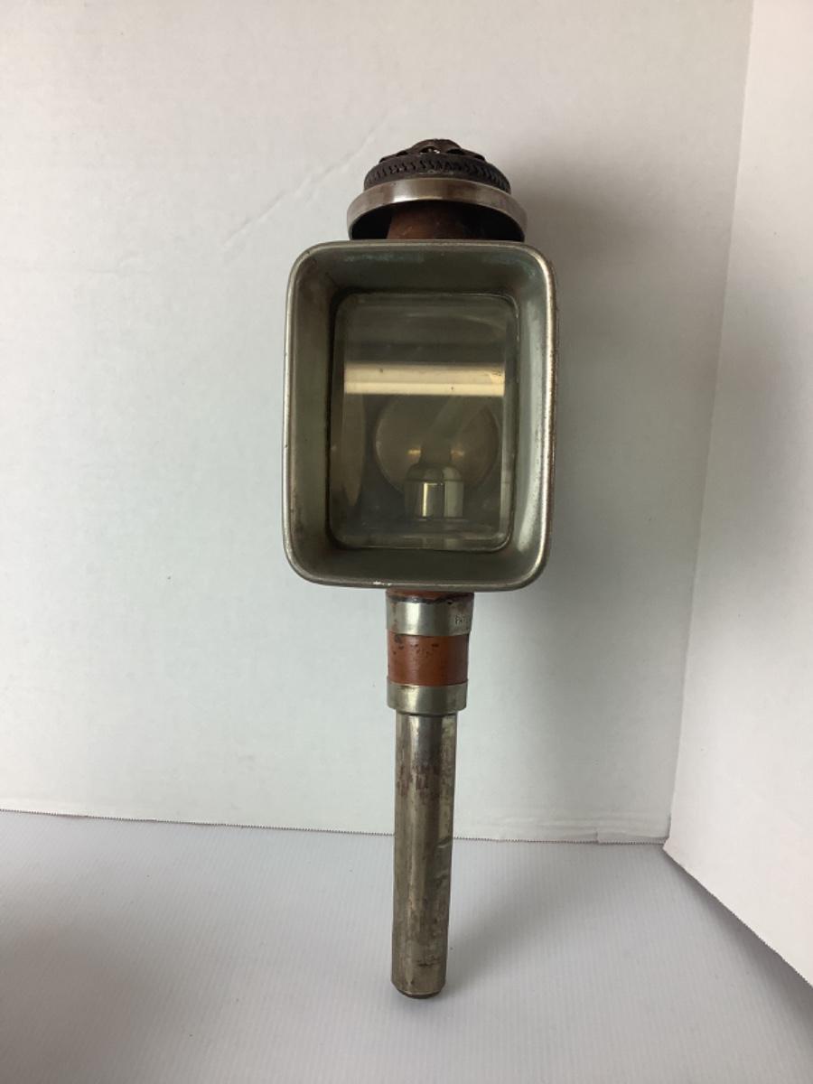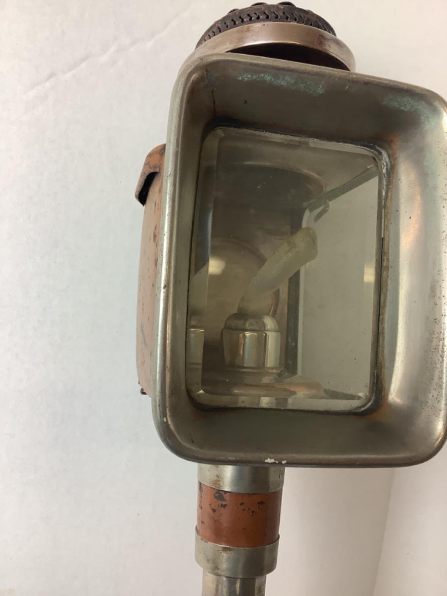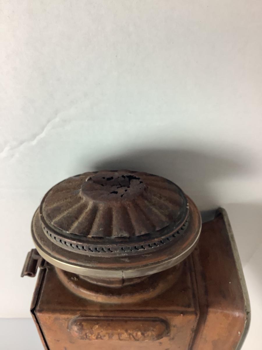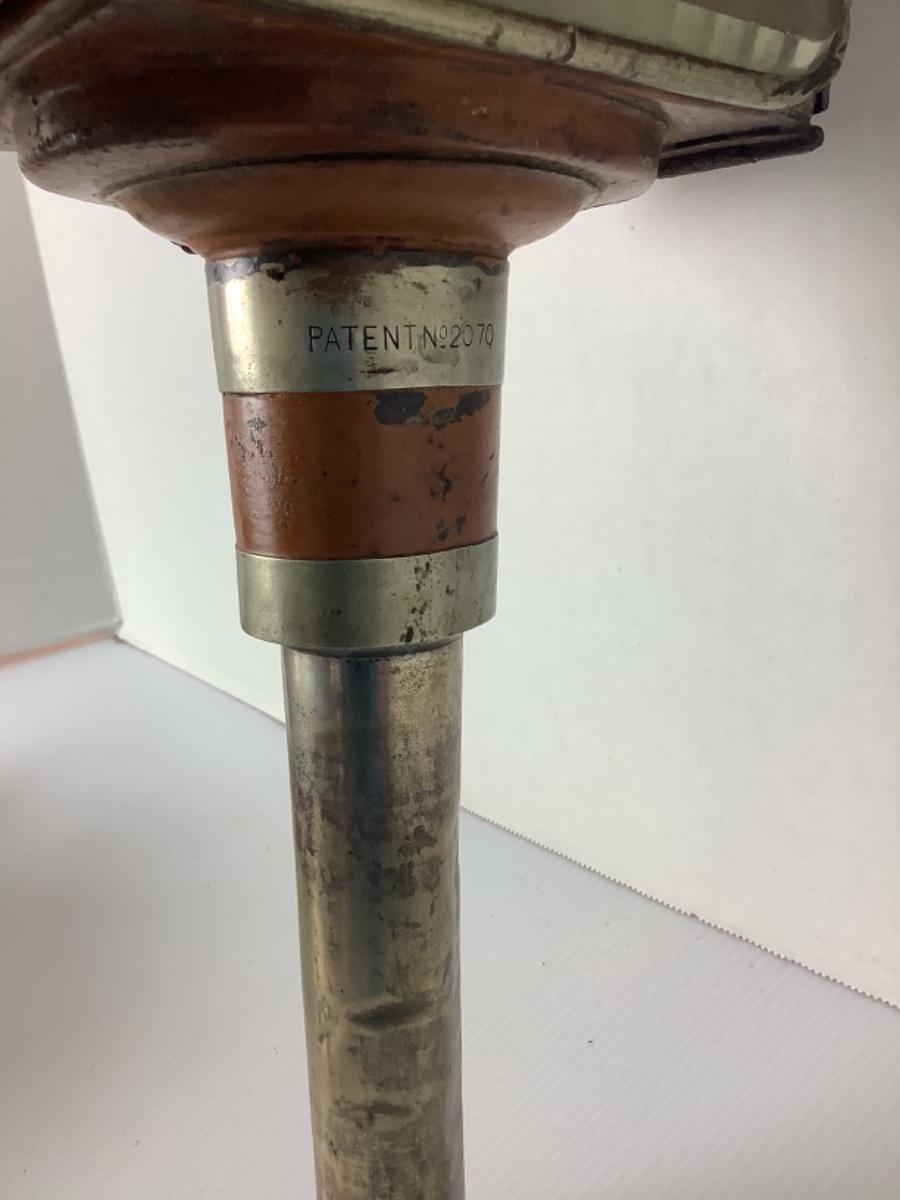 With pat # 2070 both have the original beveled glass with one being chipped, still have the half burned candles inside , tops are rusty and has a swing hinged back