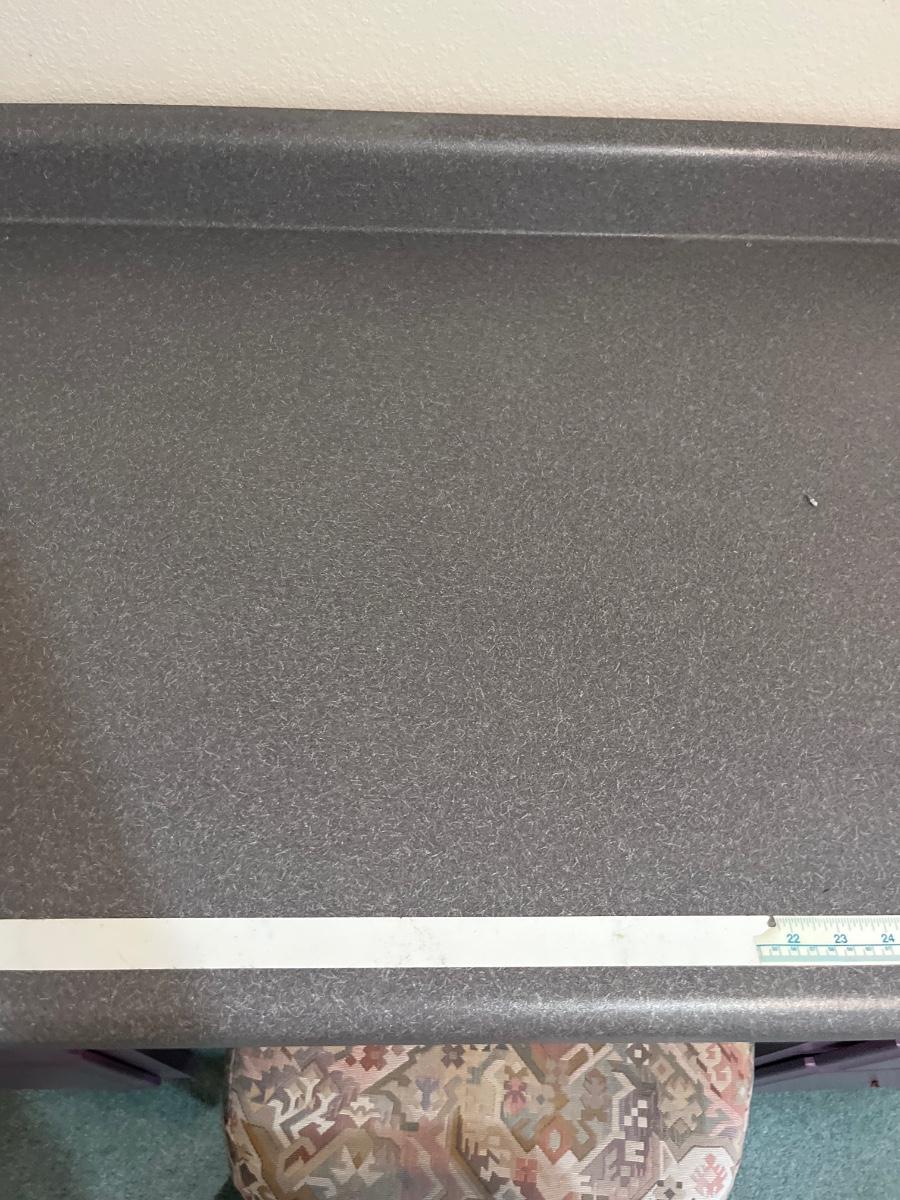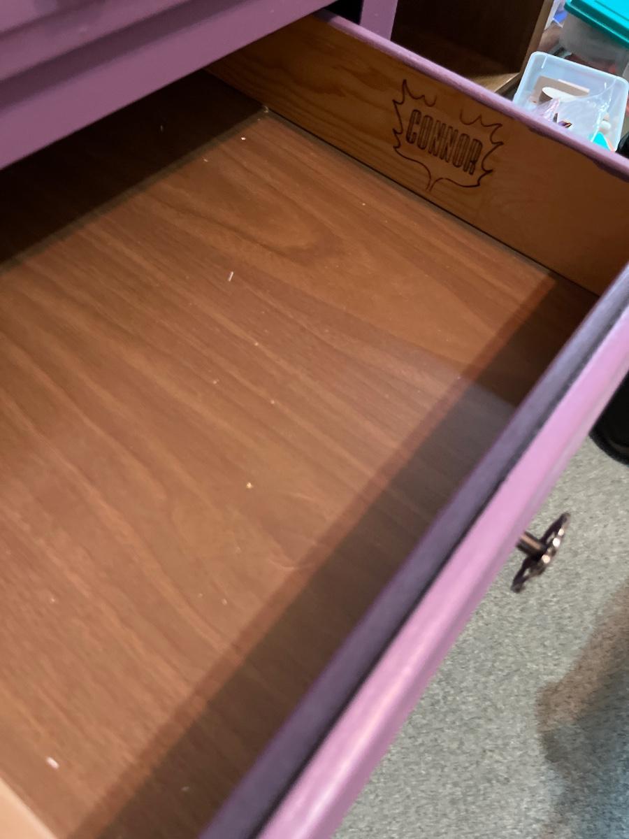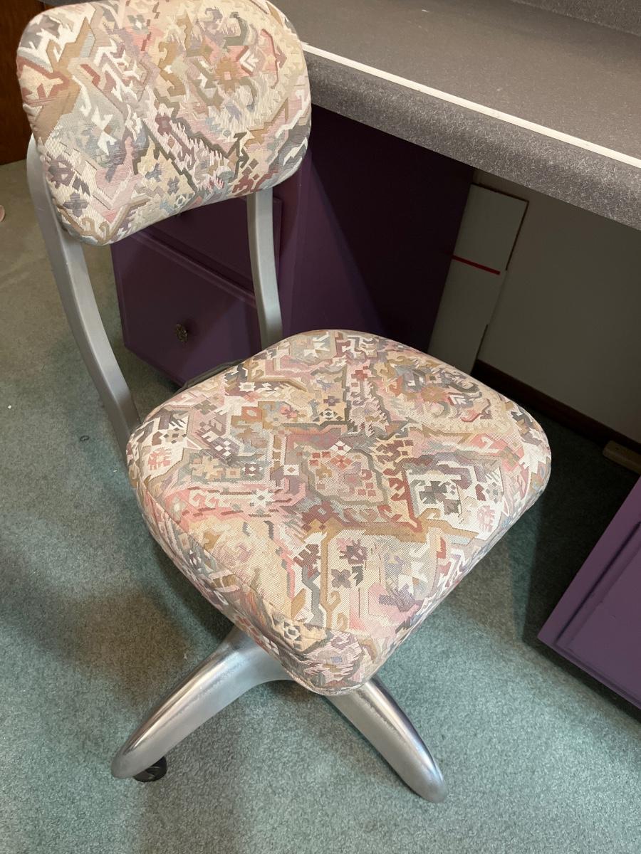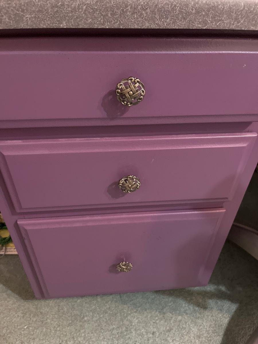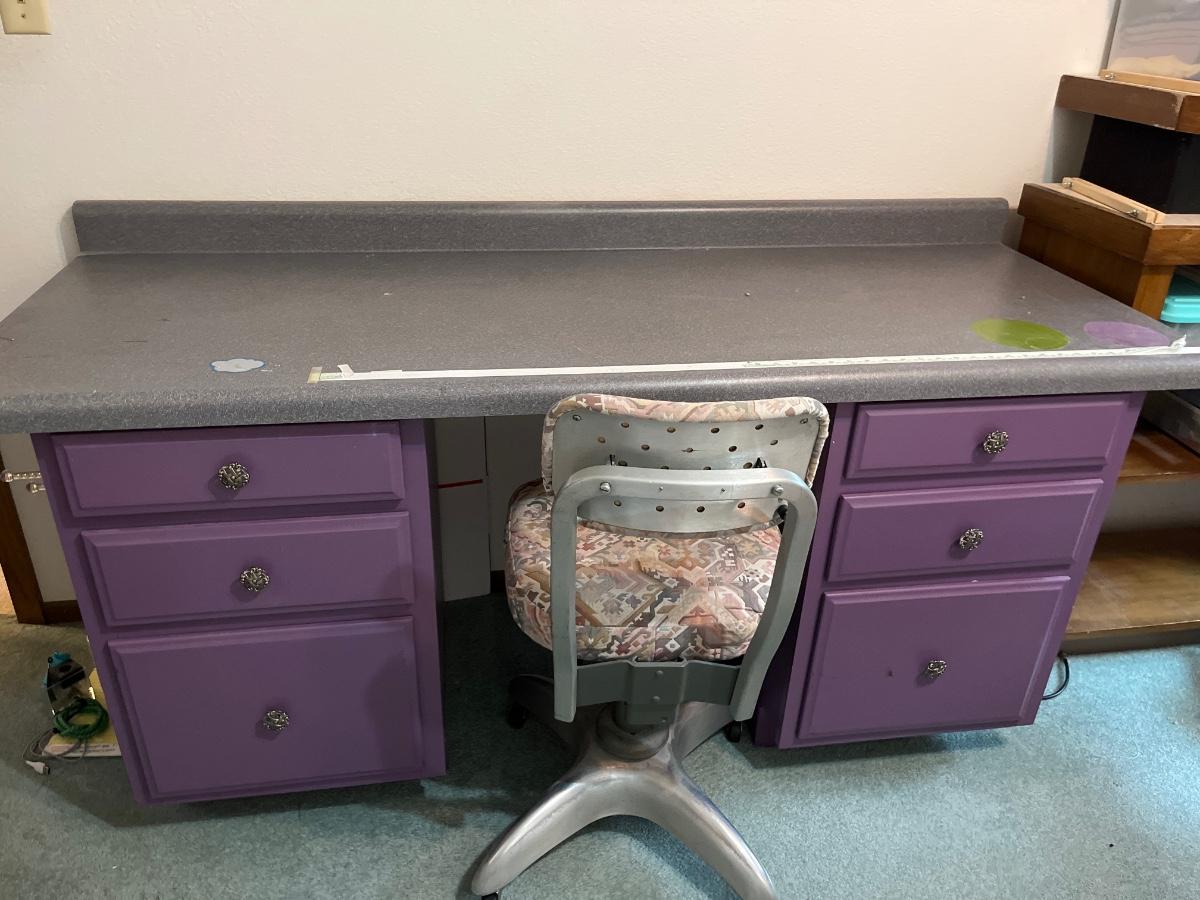 Two purple drawer units with countertop over it. Includes vintage desk chair.