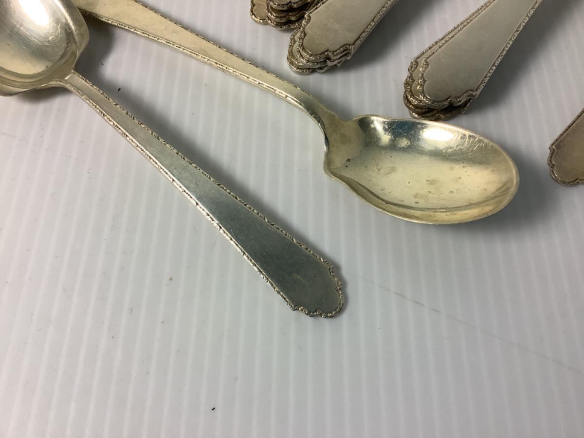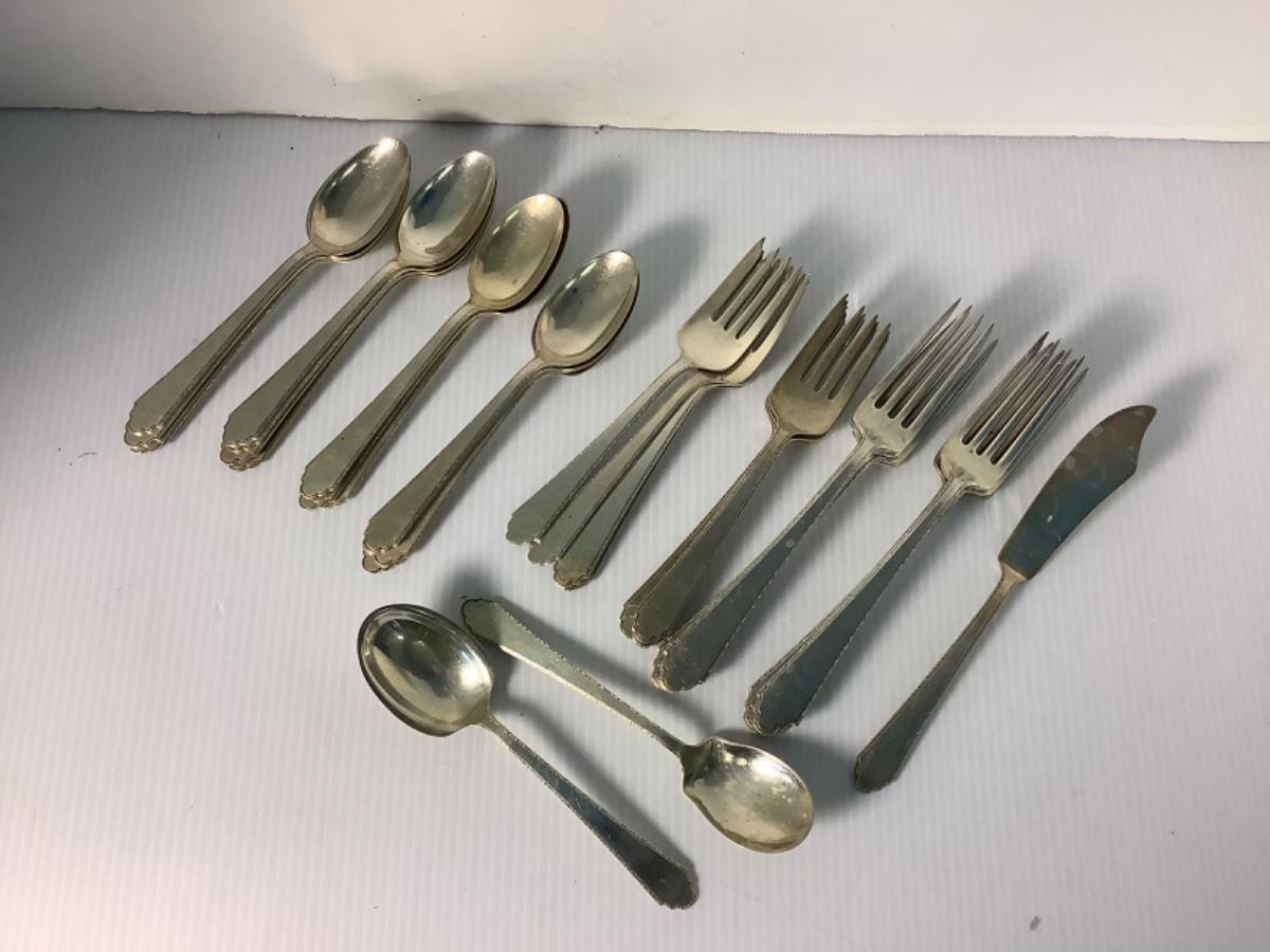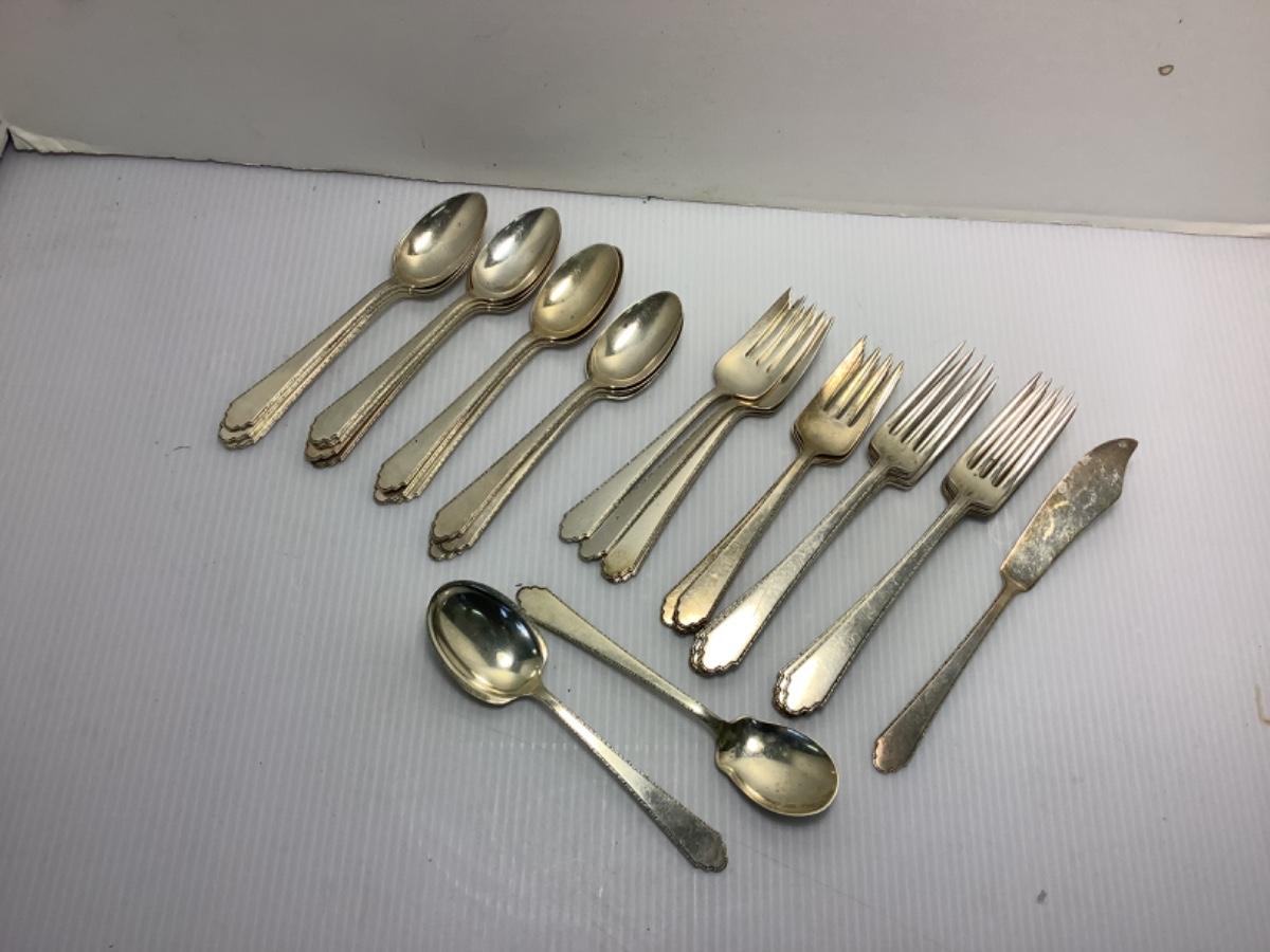 8 dinner forks, 8 salad forks, 15 teaspoons, 1 soup spoon, 1 sugar, 1 butter knife