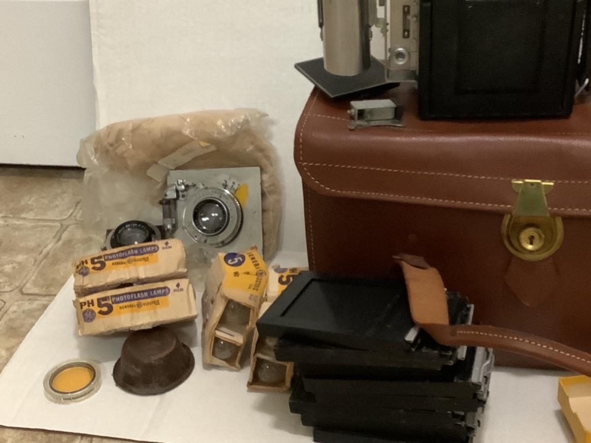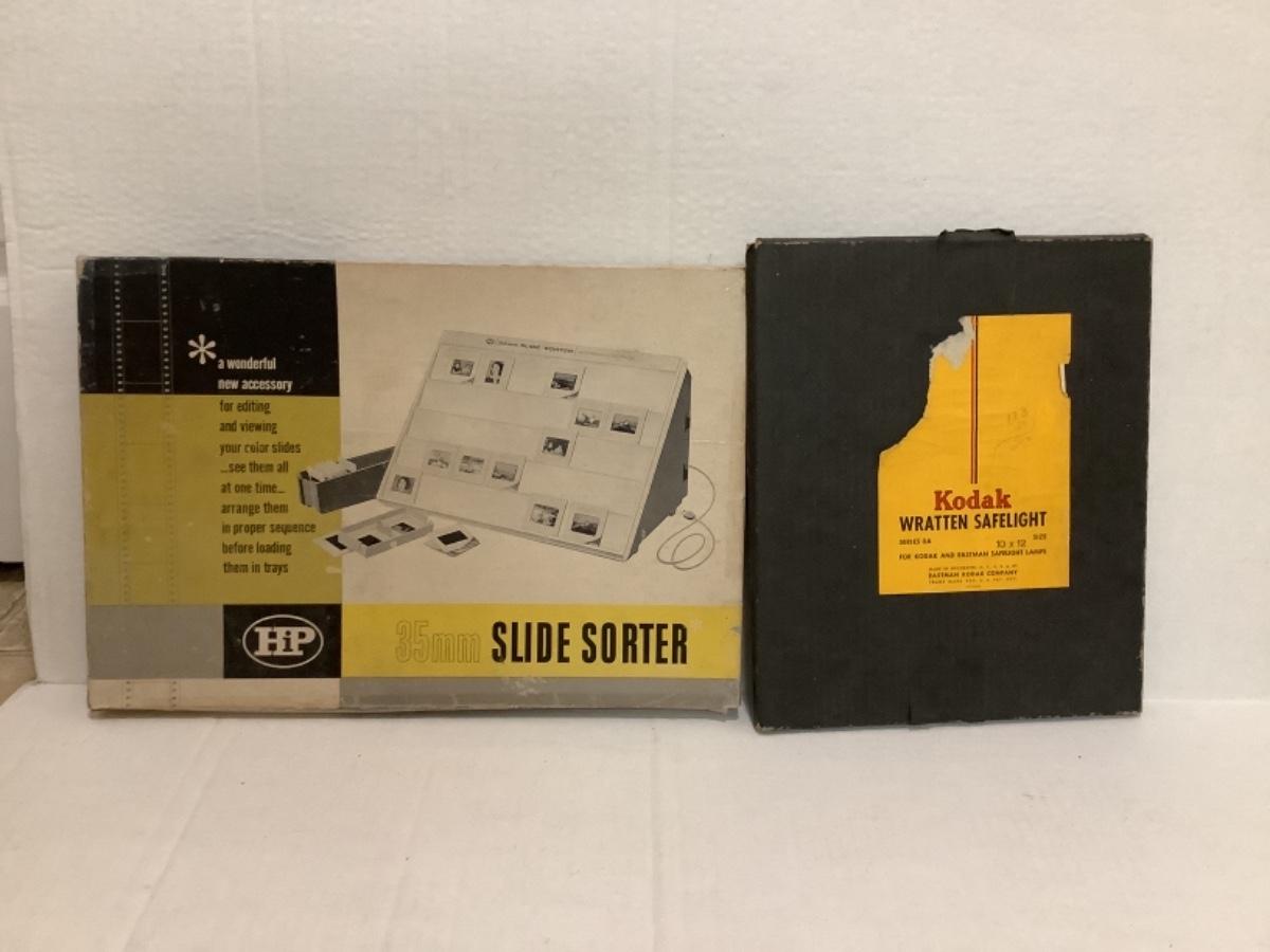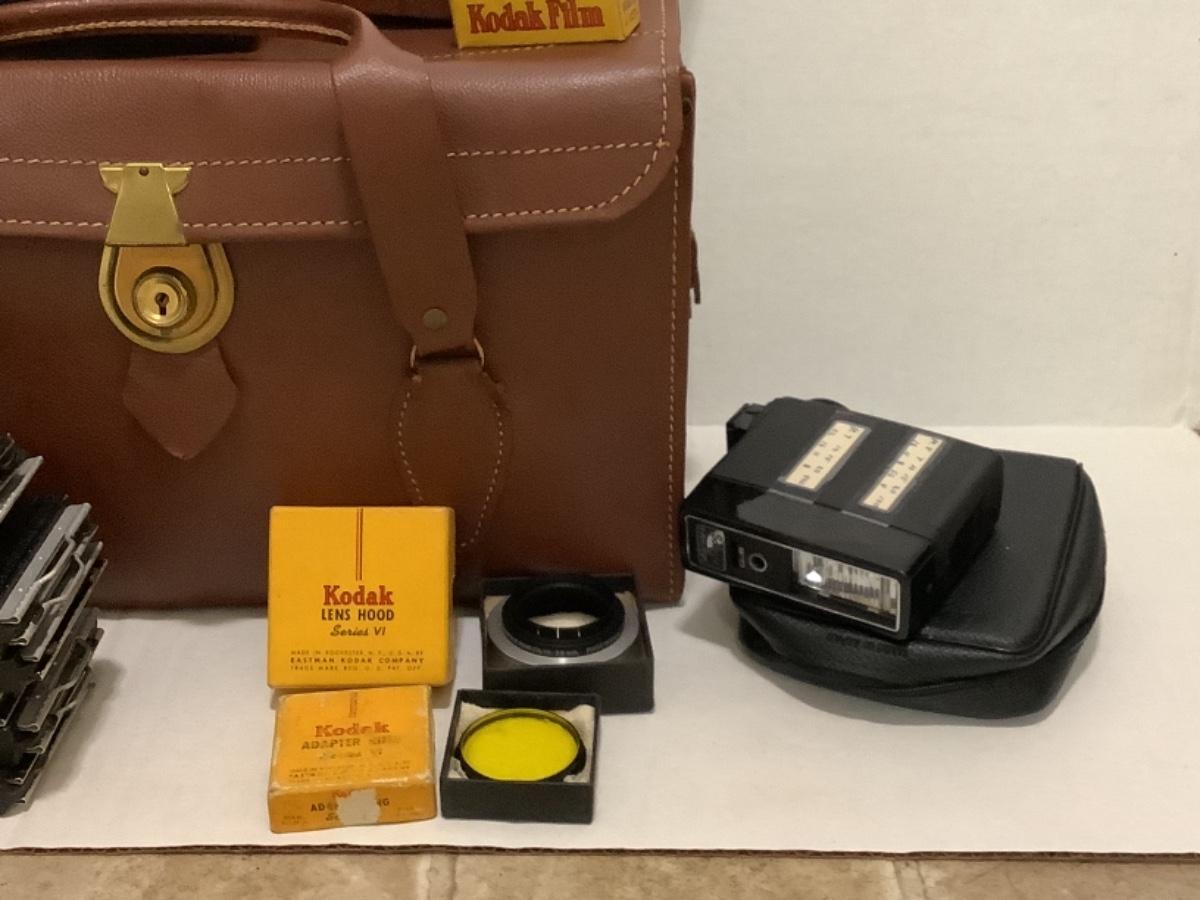 Vintage Kodak Graphic Camera, 10 flash bulbs, Soligor MK-6A Flash, Abbey Flash, HP Slide Sorter, Kodak Wratten Safelight