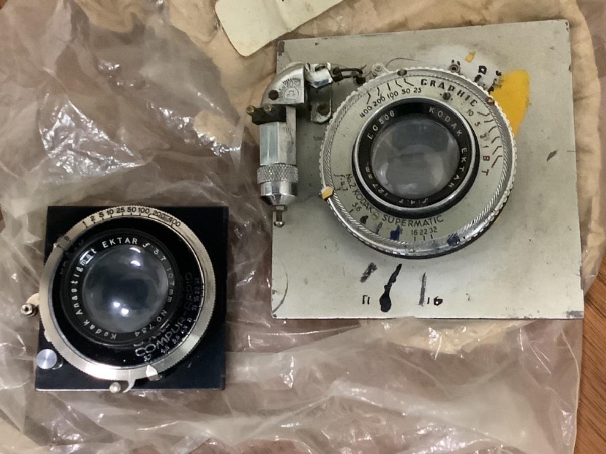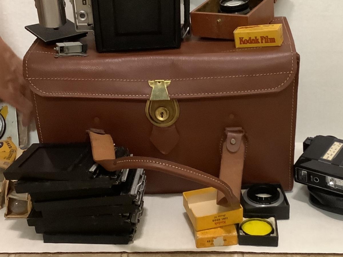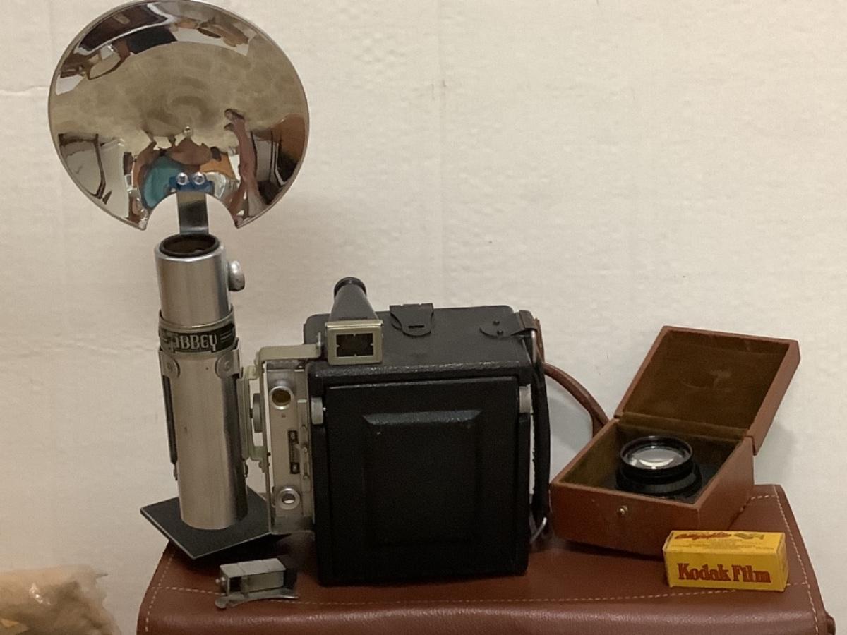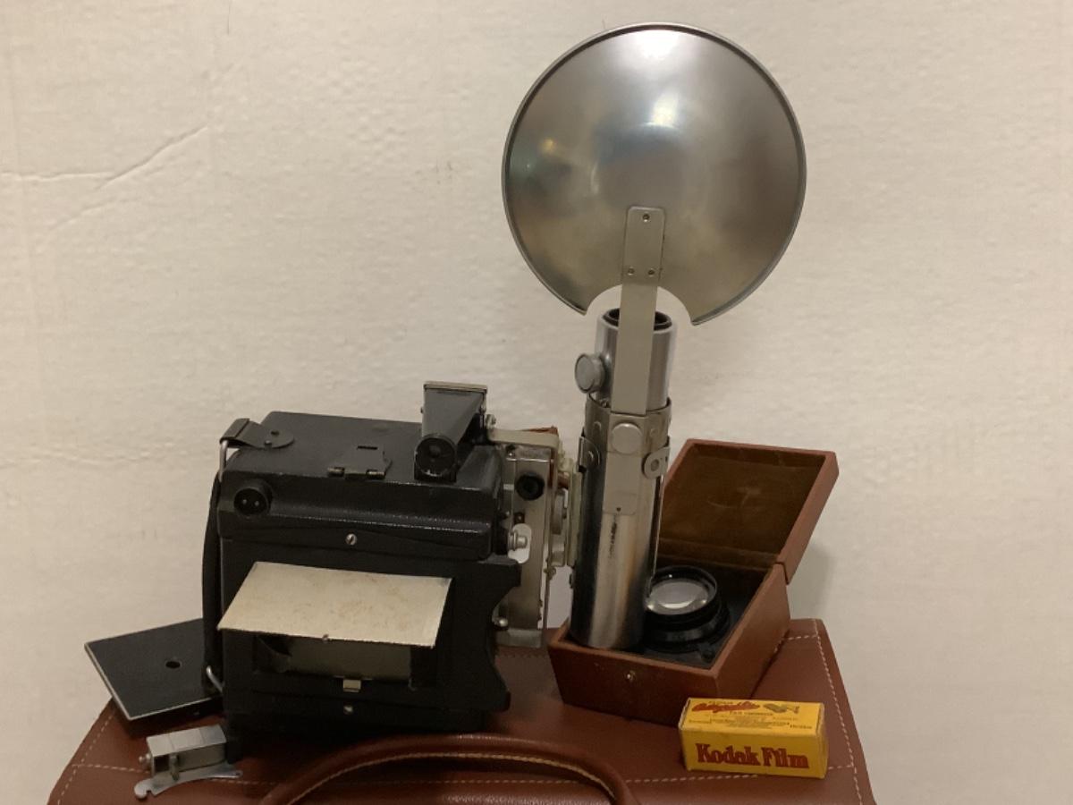 Vintage Kodak Graphic Camera, 10 flash bulbs, Soligor MK-6A Flash, Abbey Flash, HP Slide Sorter, Kodak Wratten Safelight