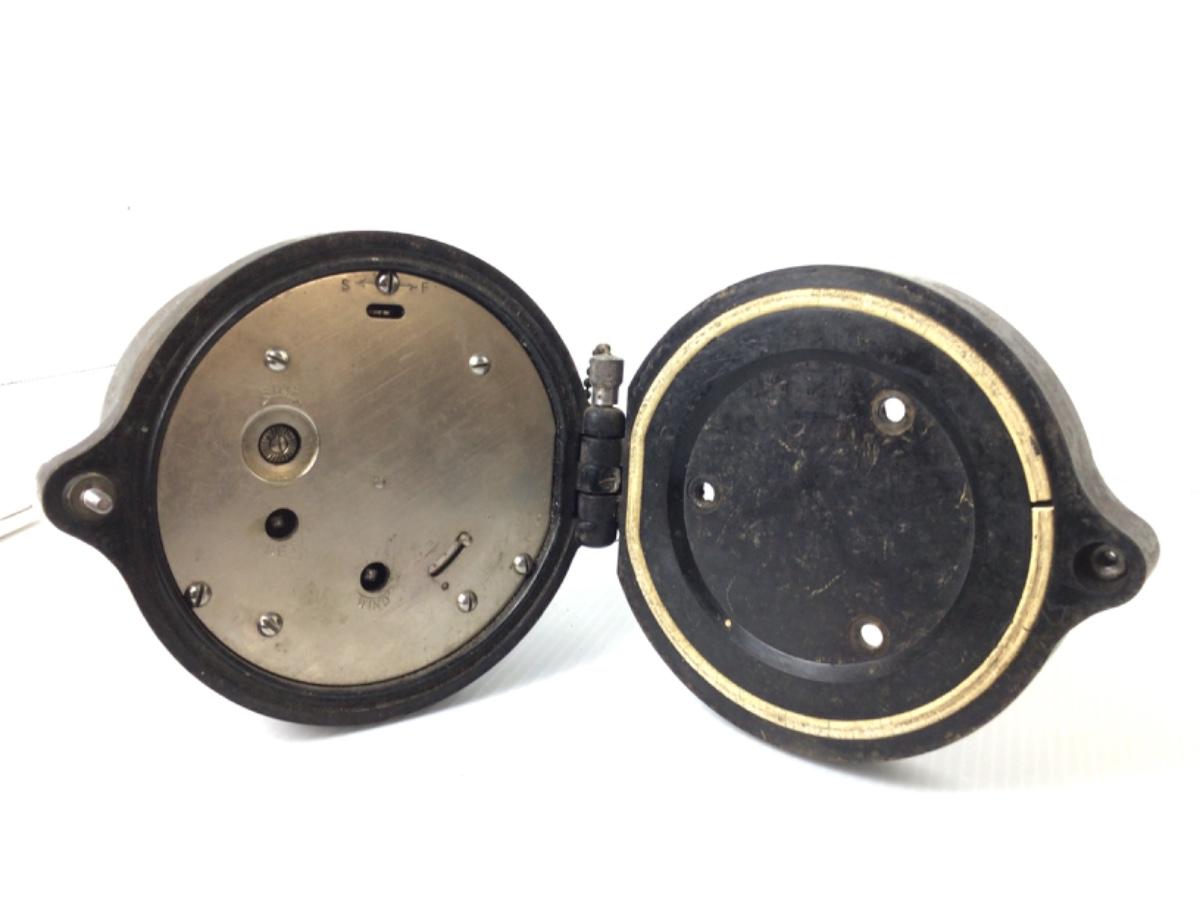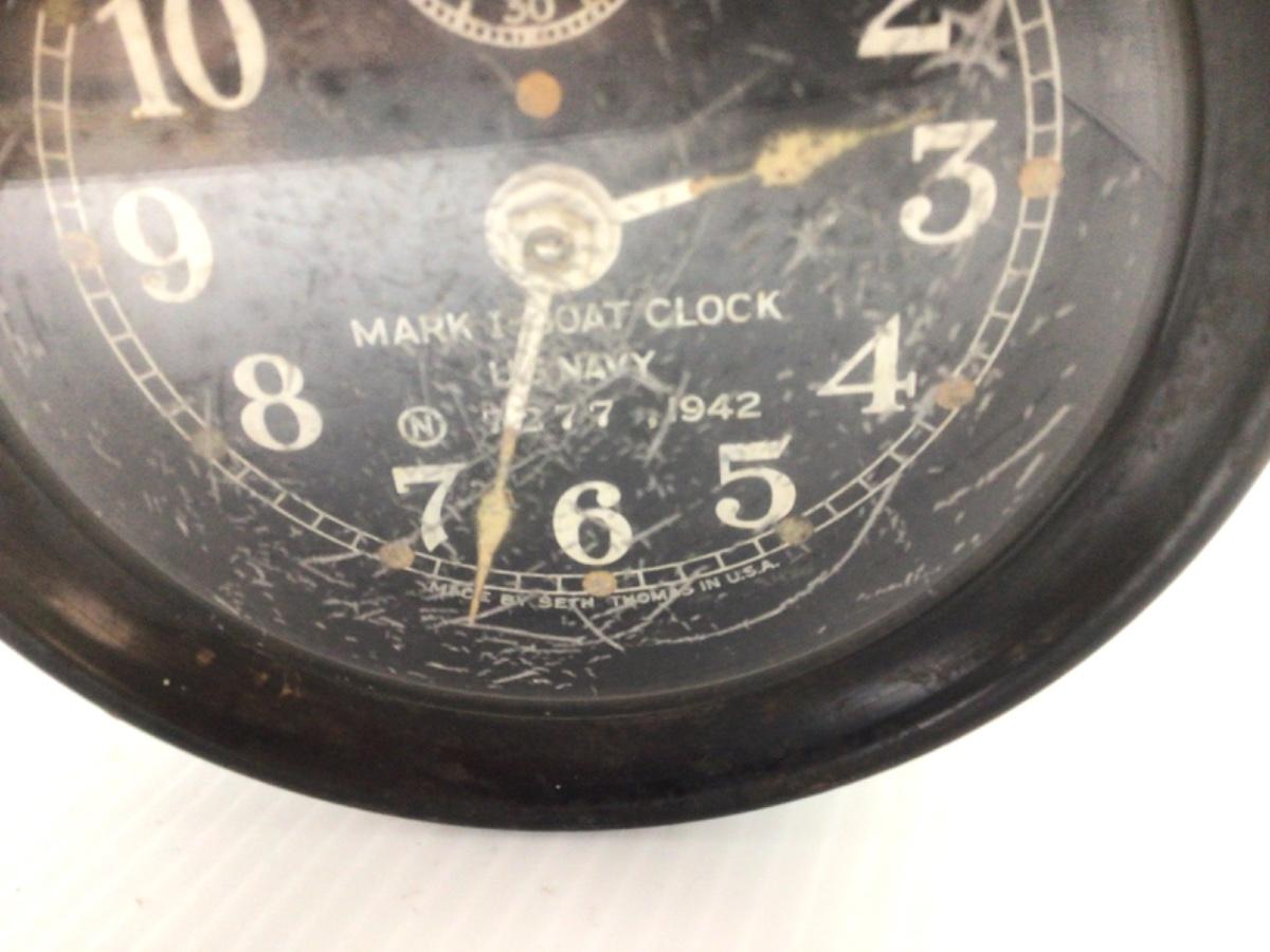Vintage 3.5” Marine Mechanical Mark-1 U.S. Navy Boat Clock. Clock is functioning. All hinging is working along with all adjustments. The front clear plastic bezel cover is scratched. The clocks body is chipped, please see pics. Manufactured by Seth Thomas.