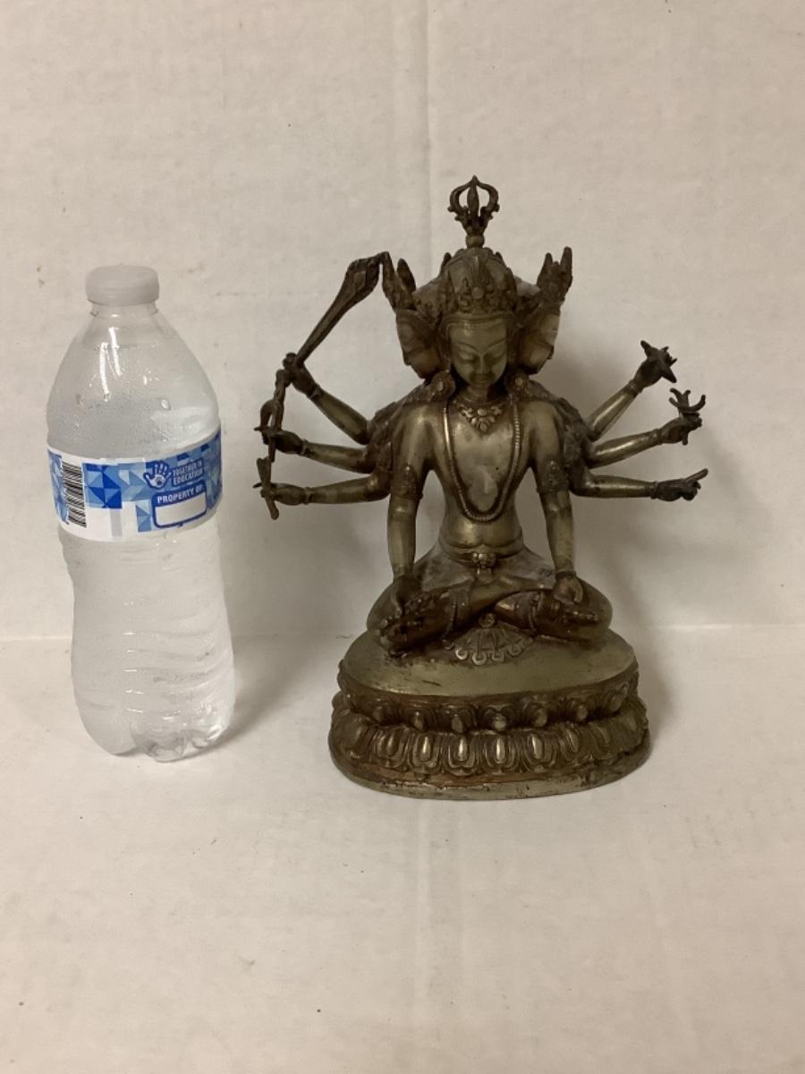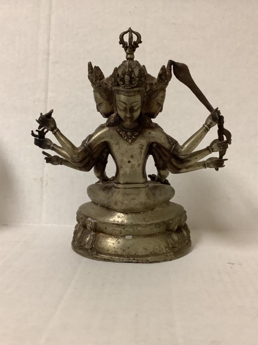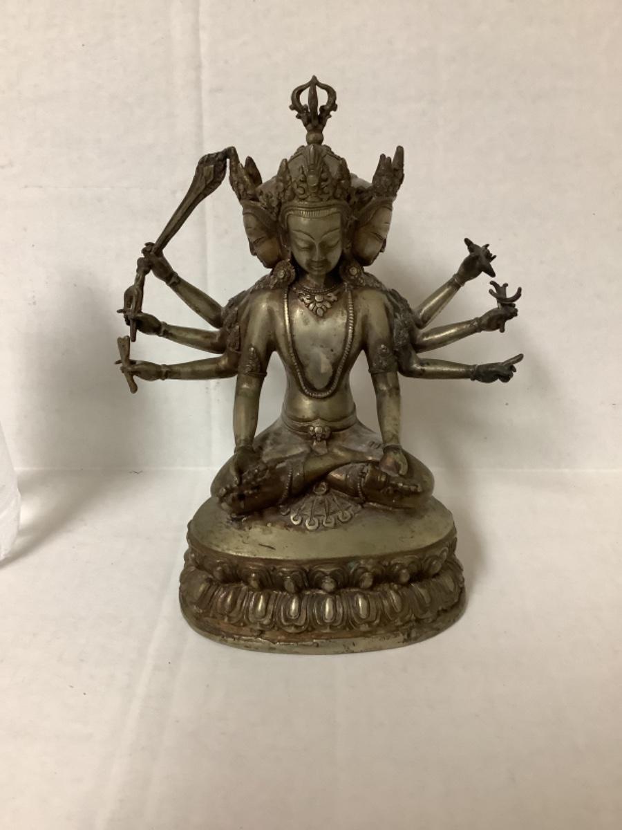 Bronze and copper Tibetan deity statue, has 8 arms and 4 faces, measures 7-1/2” wide and 9” tall