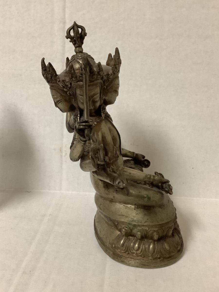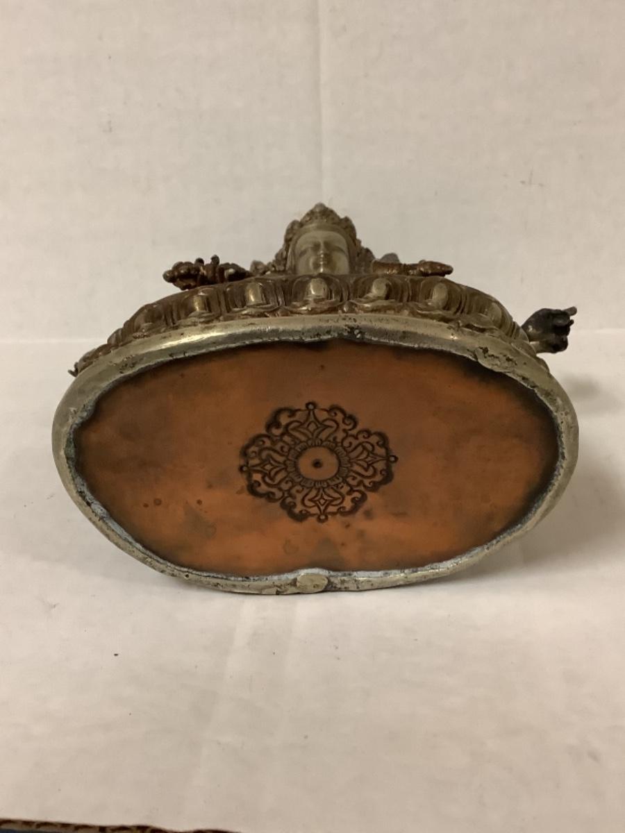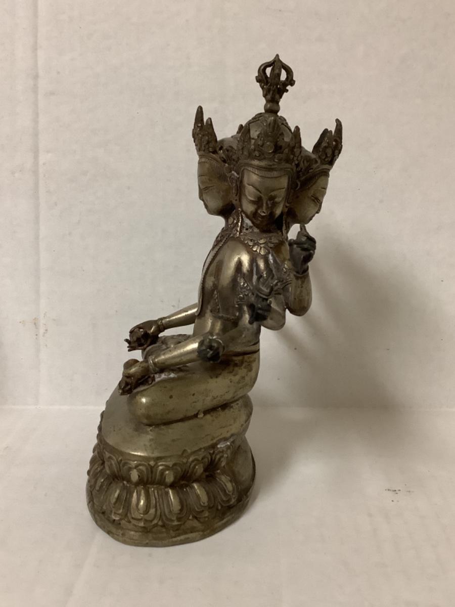 Bronze and copper Tibetan deity statue, has 8 arms and 4 faces, measures 7-1/2” wide and 9” tall