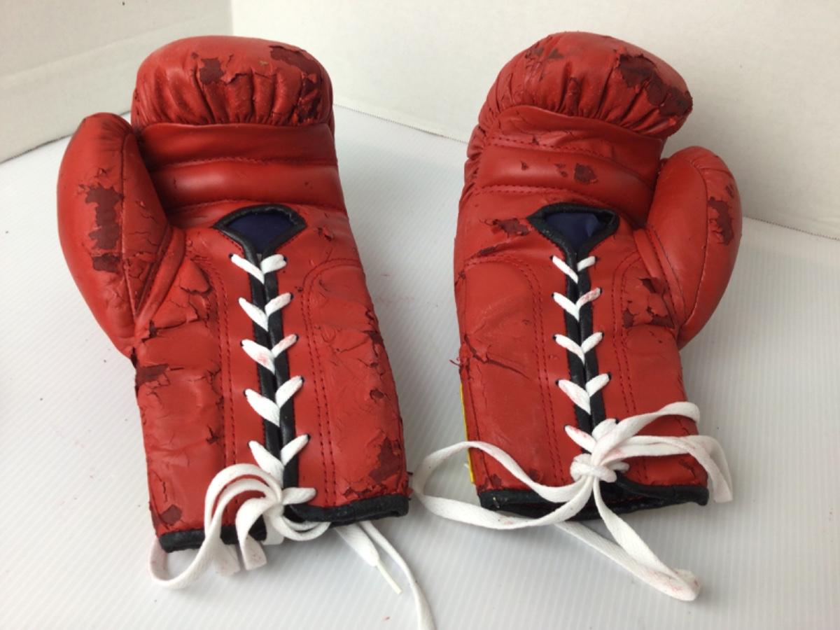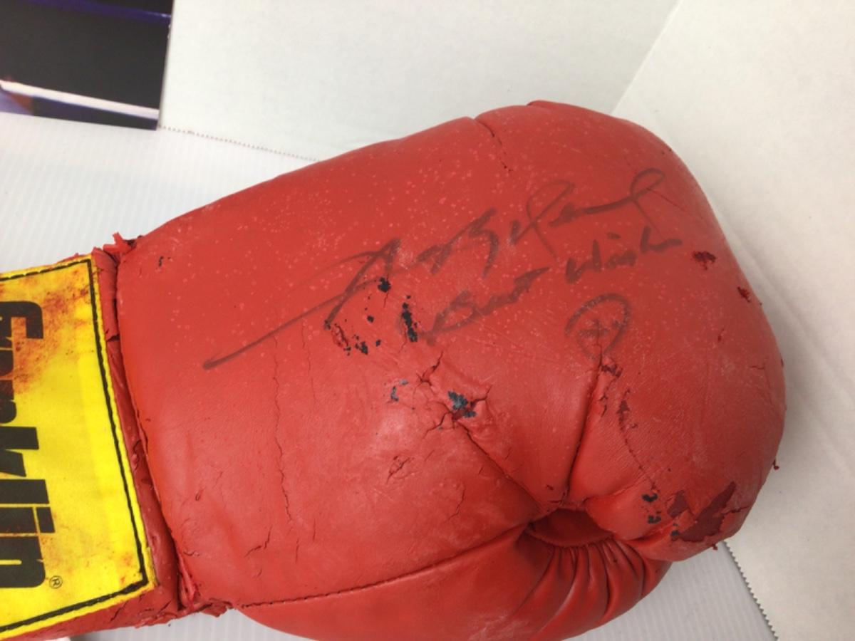 NOTE: Outer coating on boxing gloves starting to come off. Gloves need to be handled with care. Gloves and photo signatures have not be authenticated.
