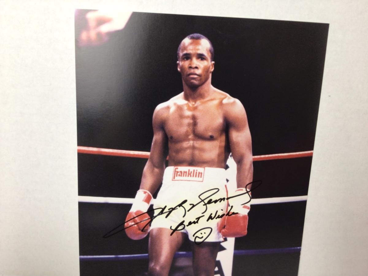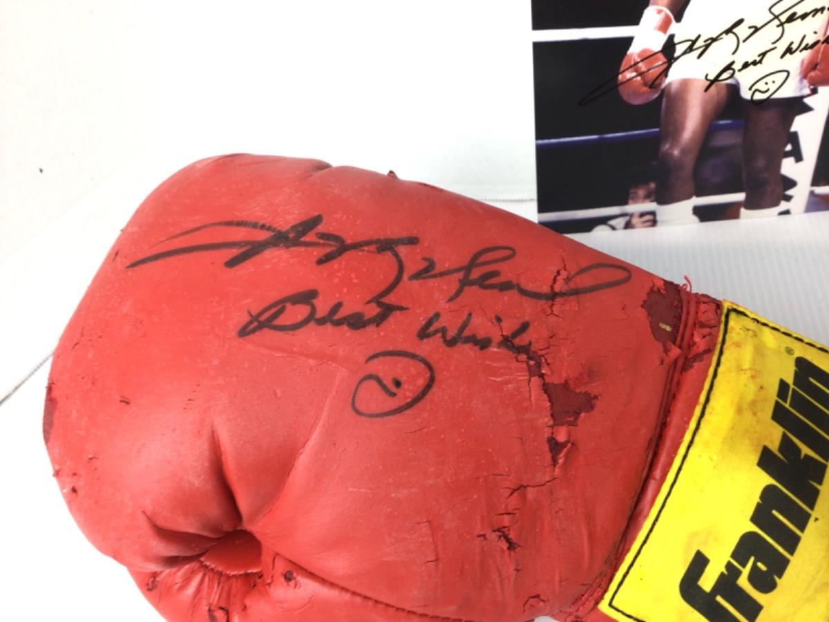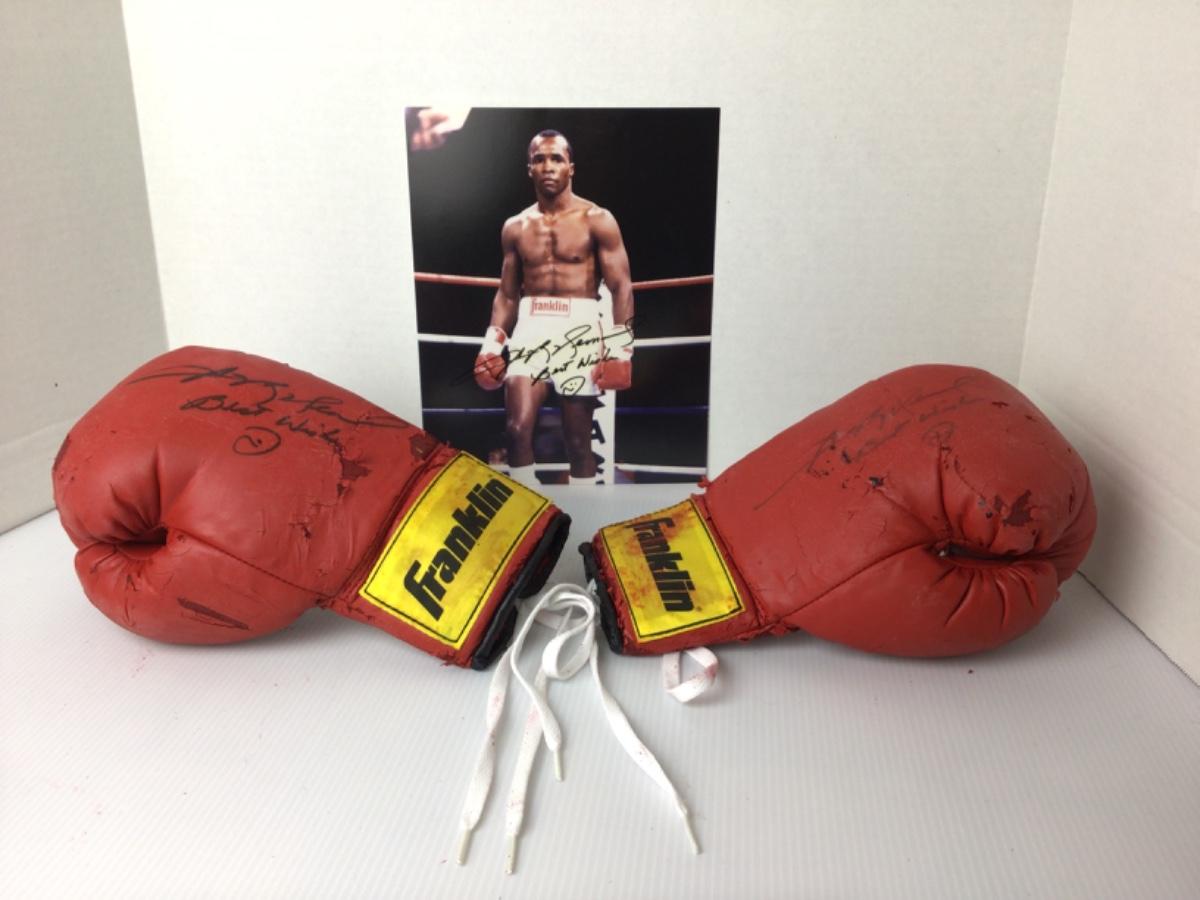 One pair of Franklin boxing gloves signed by Sugar Ray Leonard, Qty (1) 8” x 10” color photograph signed by Sugar Ray Leonard.