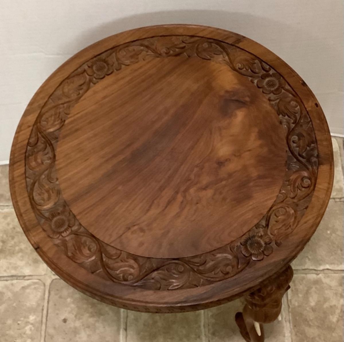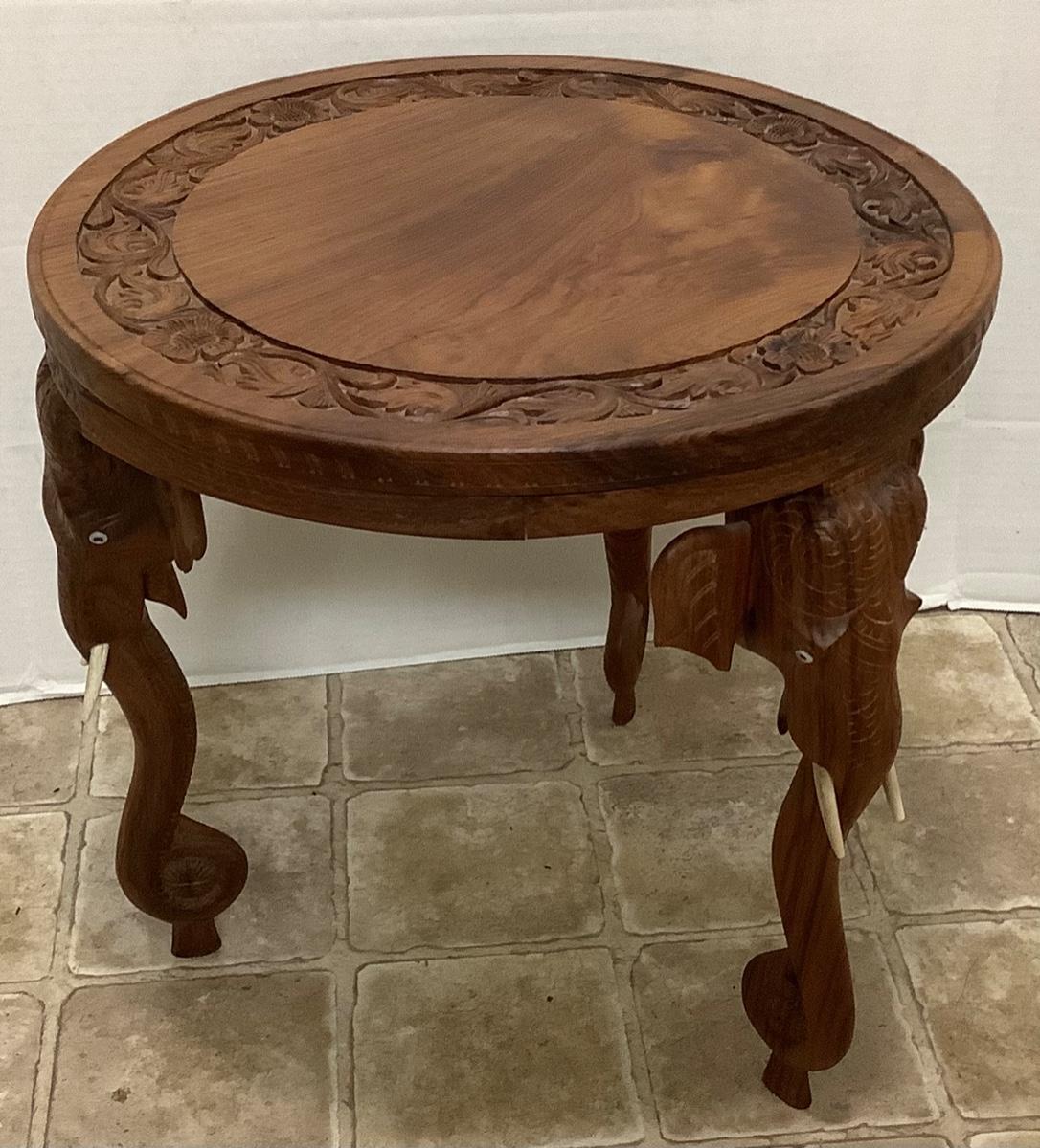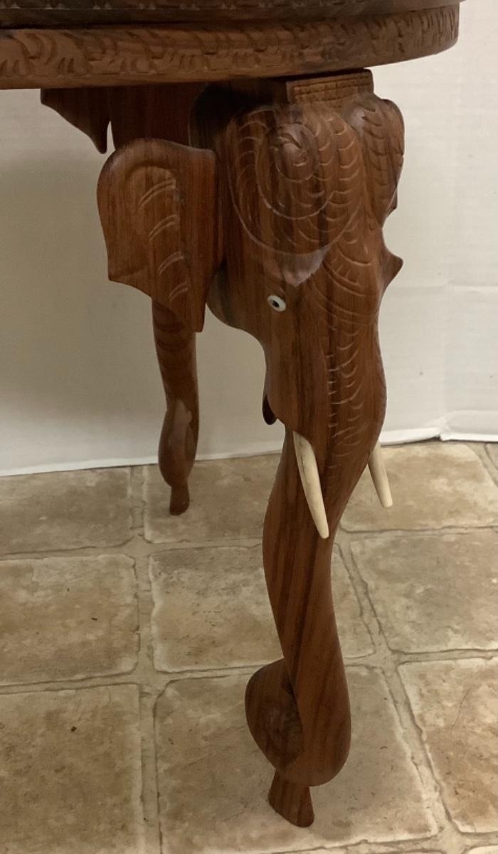 Three legs are carved elephant heads with tusks, measures 16-1/4” tall and 17-1/2” round