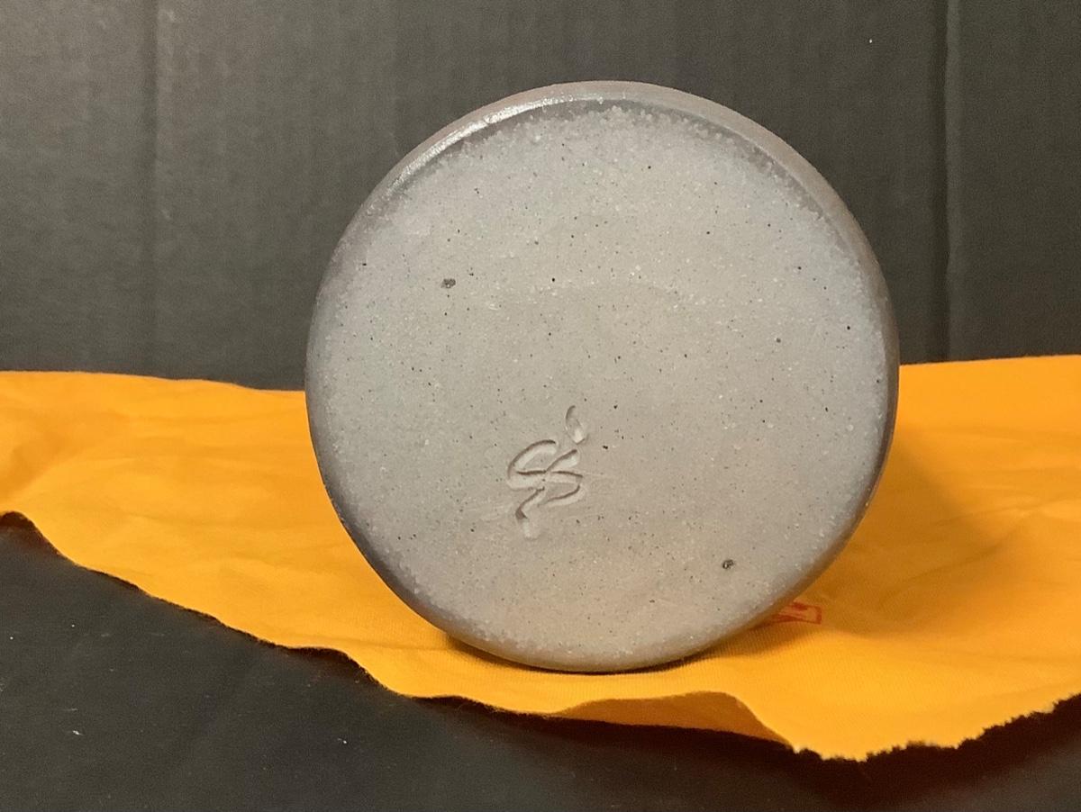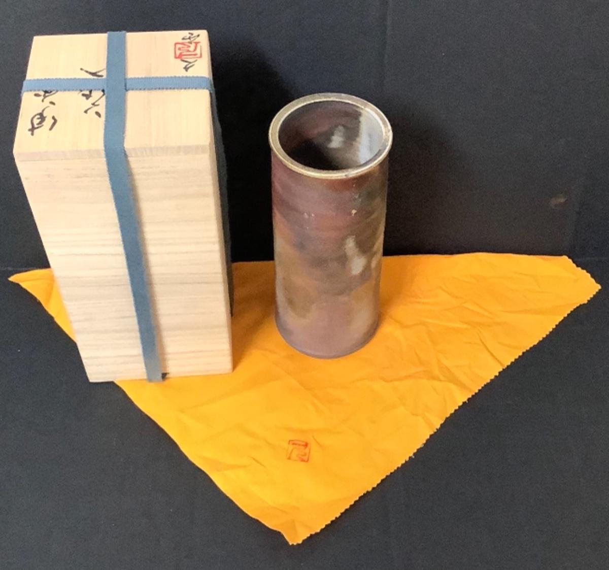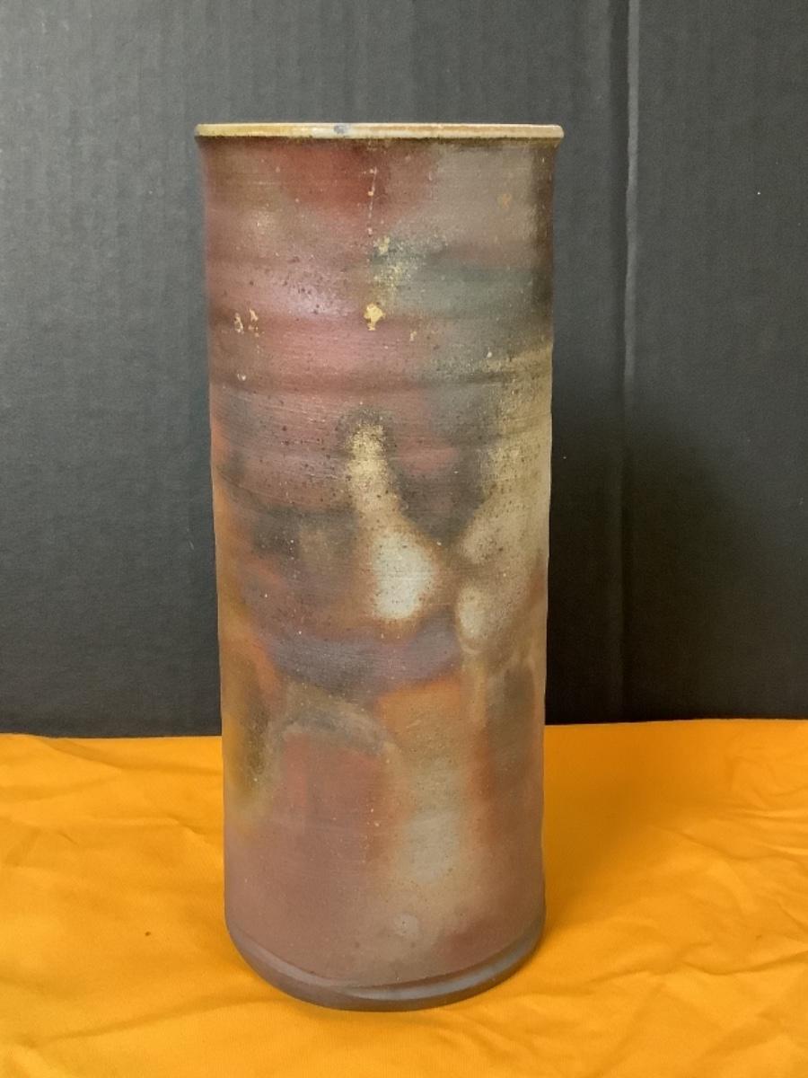 Artist signed Raku pottery vase with wooden box, see photos for signature, vase measures 8-1/2” tall and 3-1/2” round, Box measures approximately 10-1/2” tall and 5” x 5”