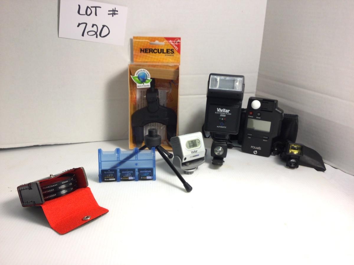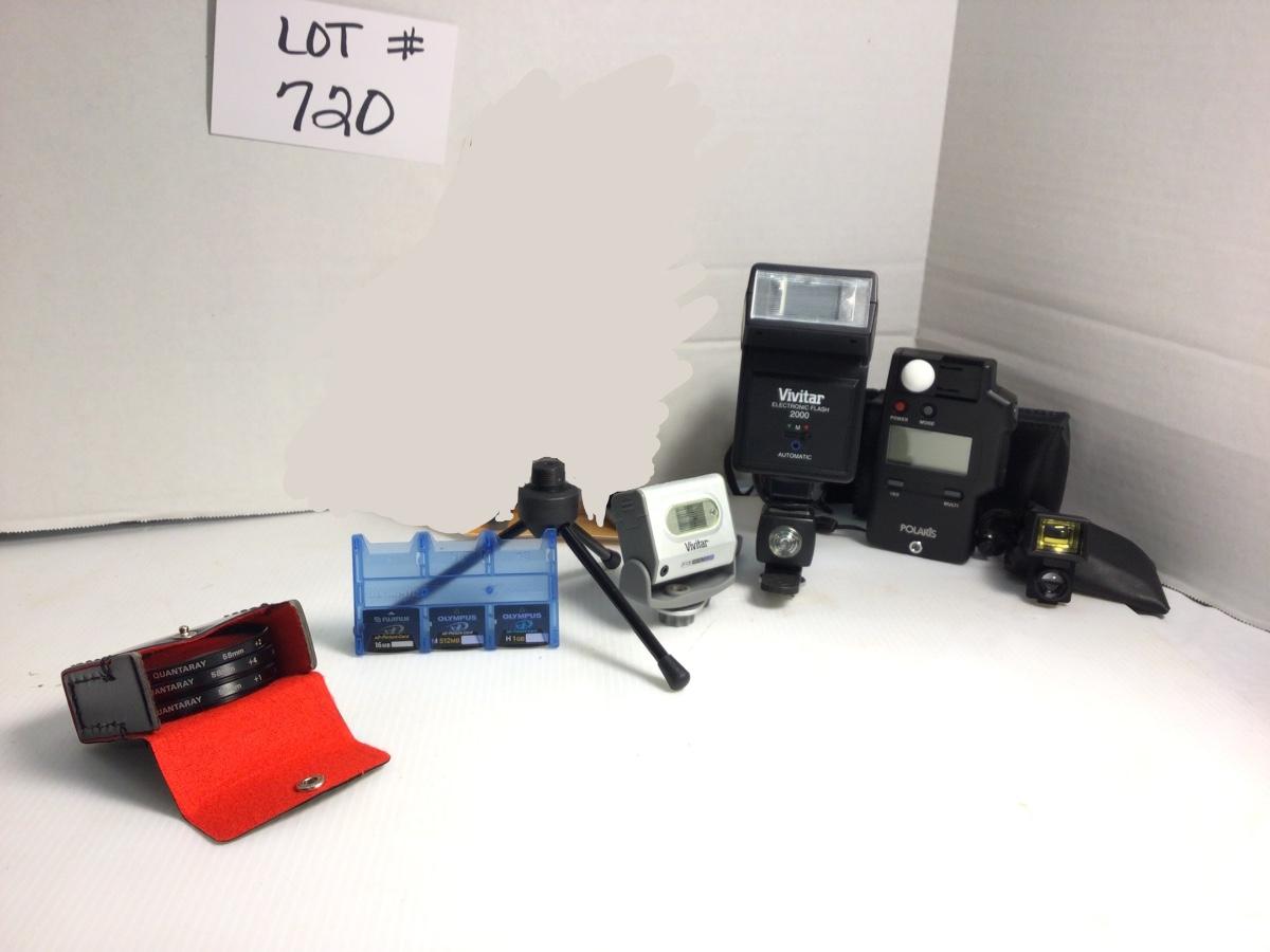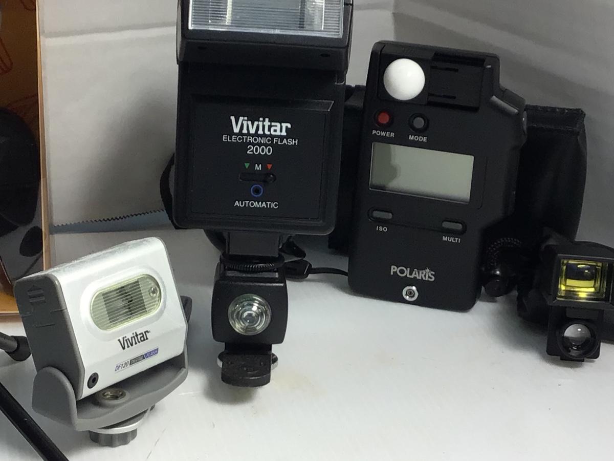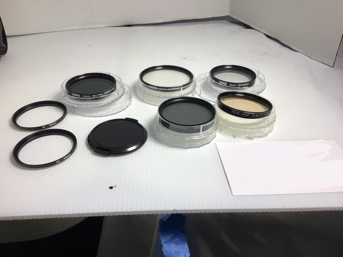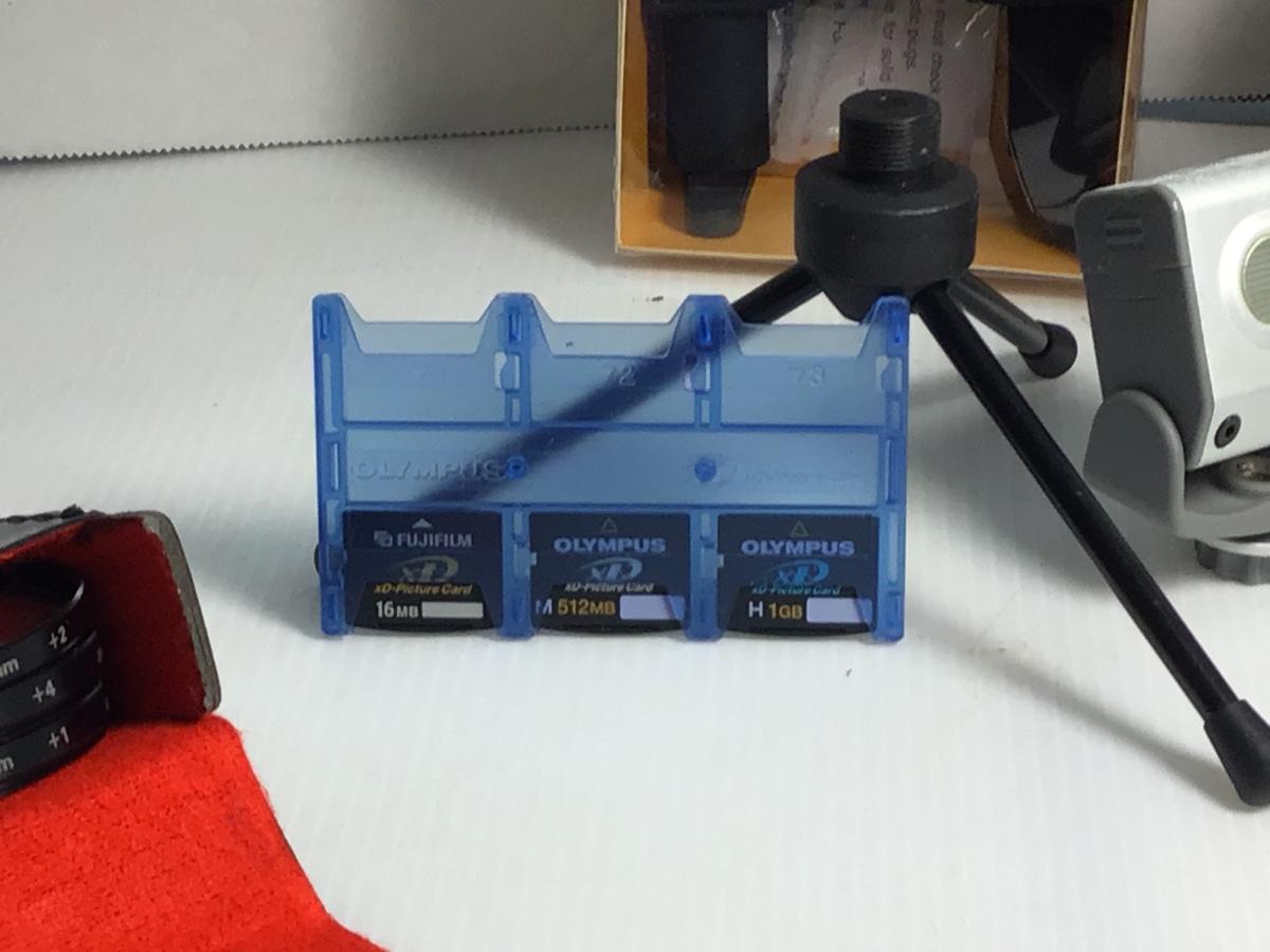 Comes with a 3 pack of quanta rays 58 millimeter 1x zoom, 2x zoom, and 4x zoom lens. Comes with 3 SD memory storage cards, (1) 16MB FujiFilm, (1) 512MB Olympus, and (1) 1GB Olympus memory card. Also comes with 2 Vivitar Flash camera attachments, (1) electronic flash 2000 & (1) DF120 Digital Flash. Lastly, comes with a PolarFlash Flash meter, and PolarFlash Spotview 1.0 Comes with a total of 5 camera lens, (4) 58 millimeter, (1) 67 millimeter lens. Also comes with camera lens cleaning kit.