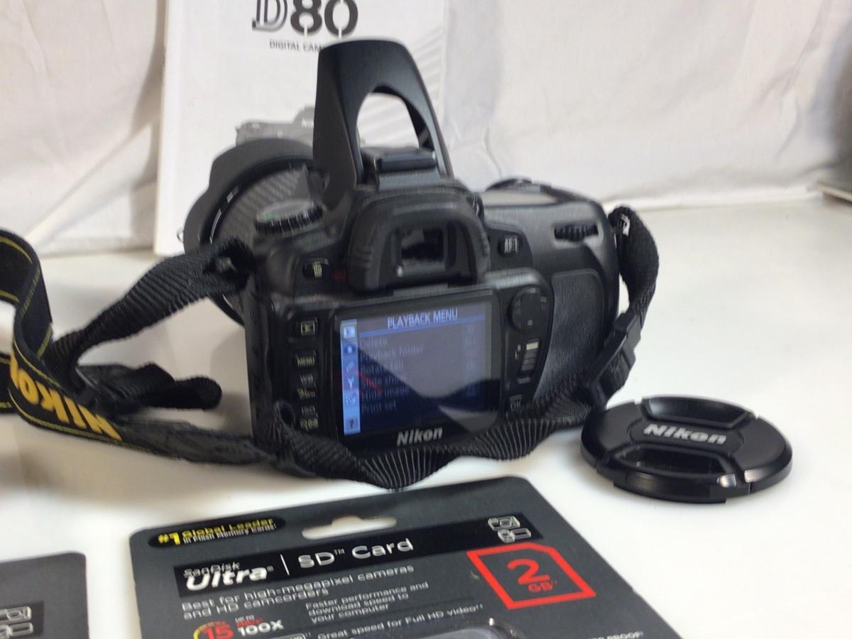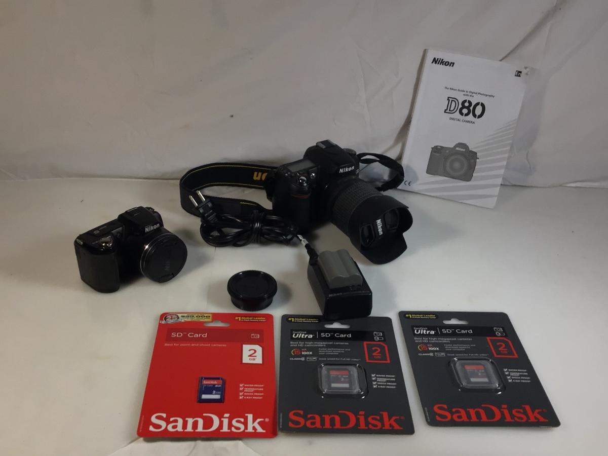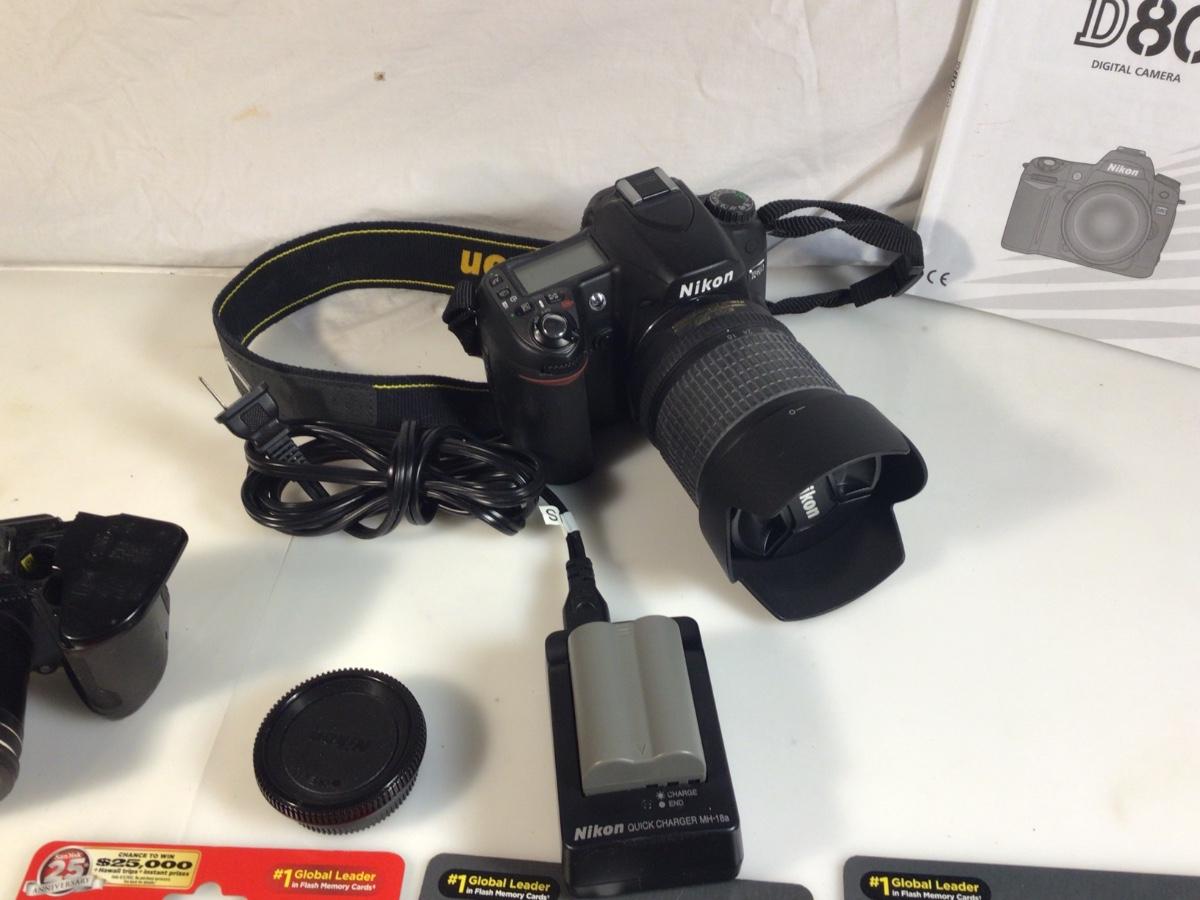 Comes with one Nikon D80 Camera, has included 2 internal batteries, one battery charger for the D80 batteries, 3 individual 2GB SanDisk SD cards, one D80 Manuel, and lastly comes with a Nikon CoolPix L110 Camera. CoolPix L110 DOES NOT work, bottom battery cover/connector snapped in picture listed. Being sold as is for parts. Nikon D80 in working condition