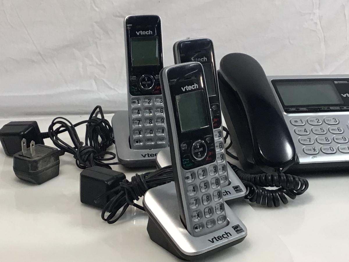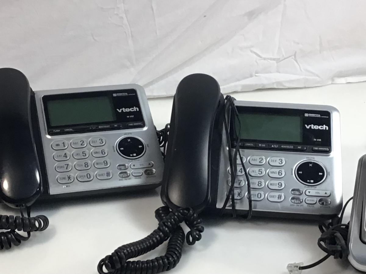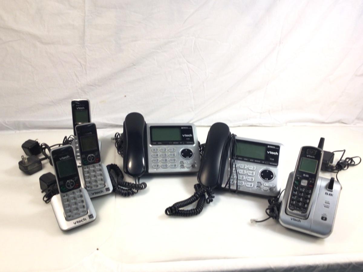 This lot comes included with 4 regular vtech hour phones, 3 come with regular phone docks, with one having an antenna with a voice messaging dock. Also includes 2 curly cord multi-purpose voice message docks. All phones are in working condition.