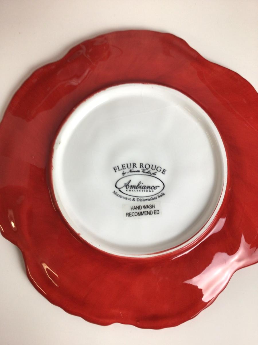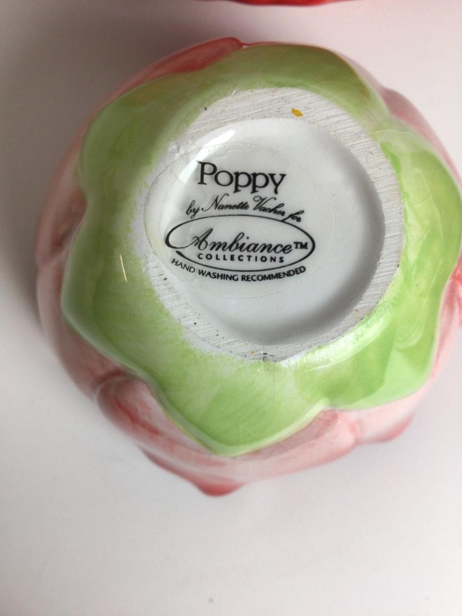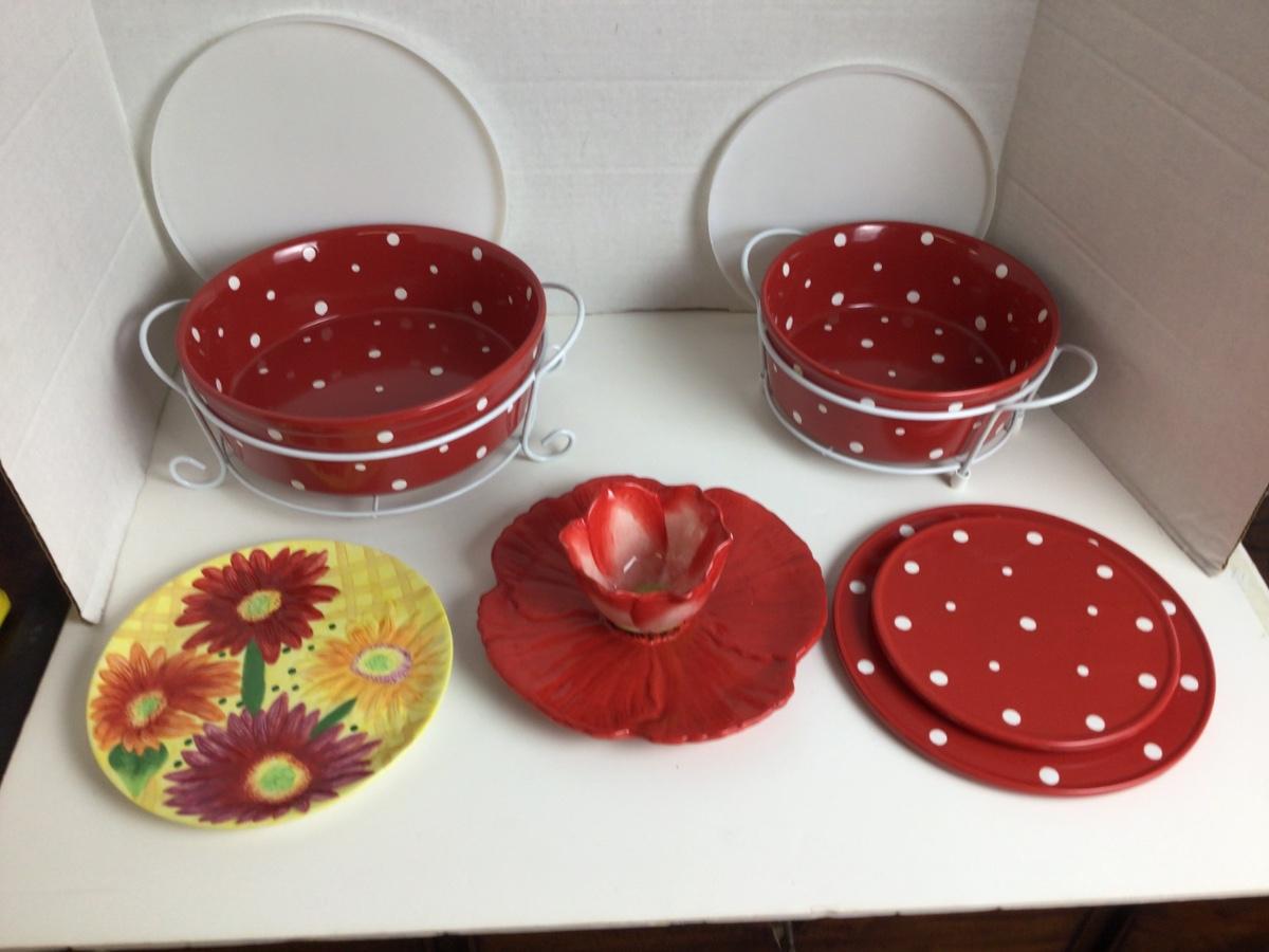Poppy flower with flower plates and red and white serving bowls with white metal stands with covers