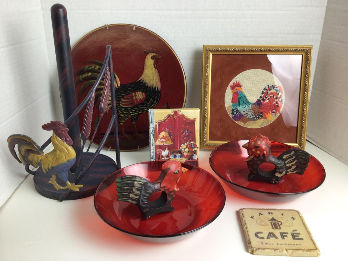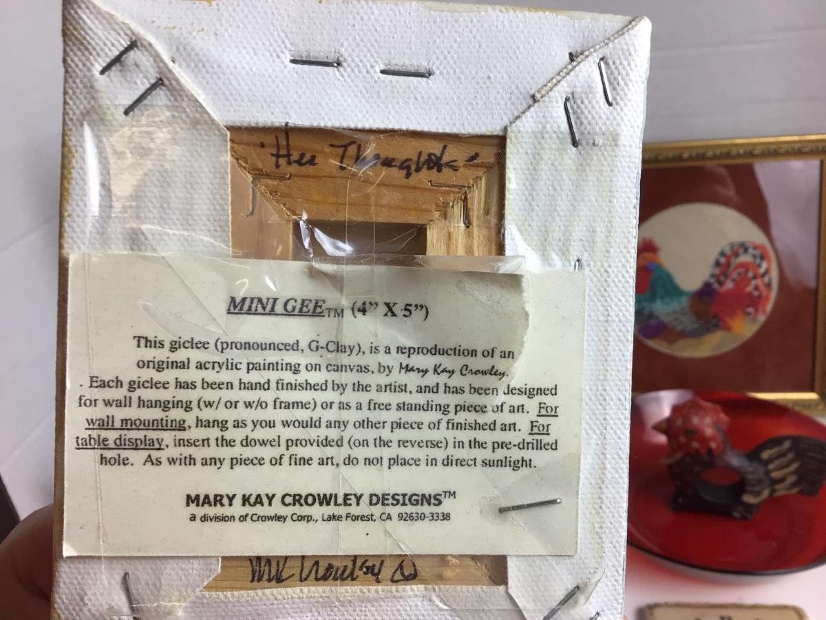 Needlepoint 9" x 9" , Rooster wall plate - 11" round, giclee reproduction by Mary Kay Crowley measures 4" x 5"