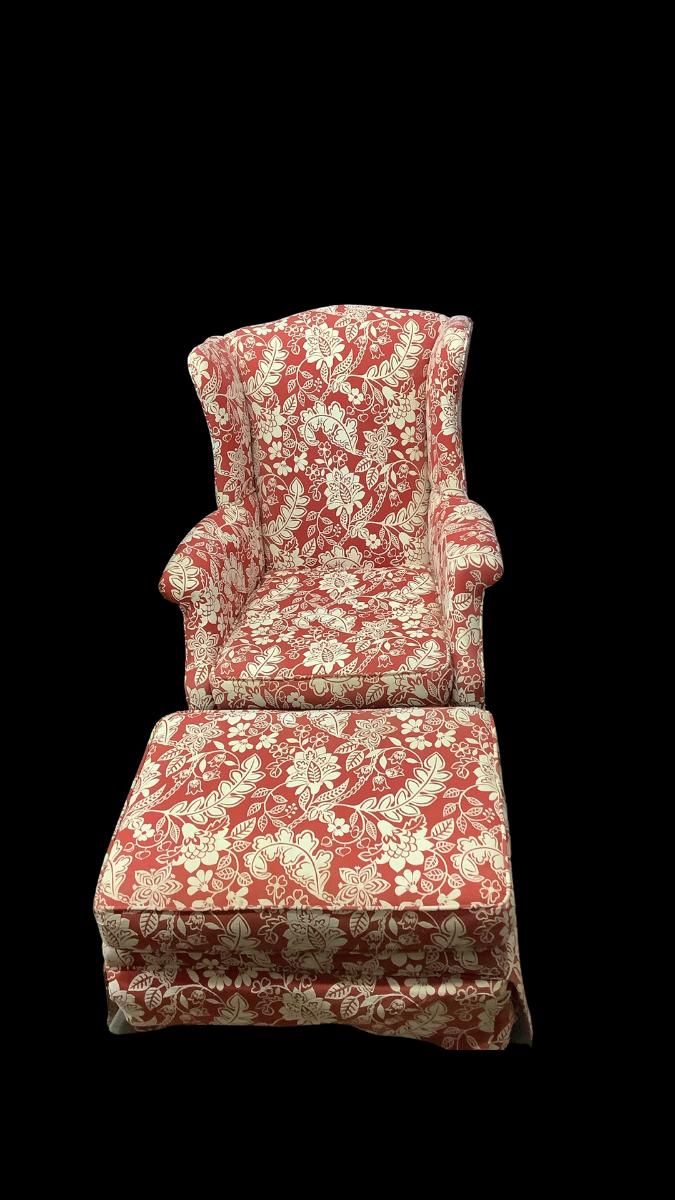 Chair and foot ottoman have been reupholstered no maker