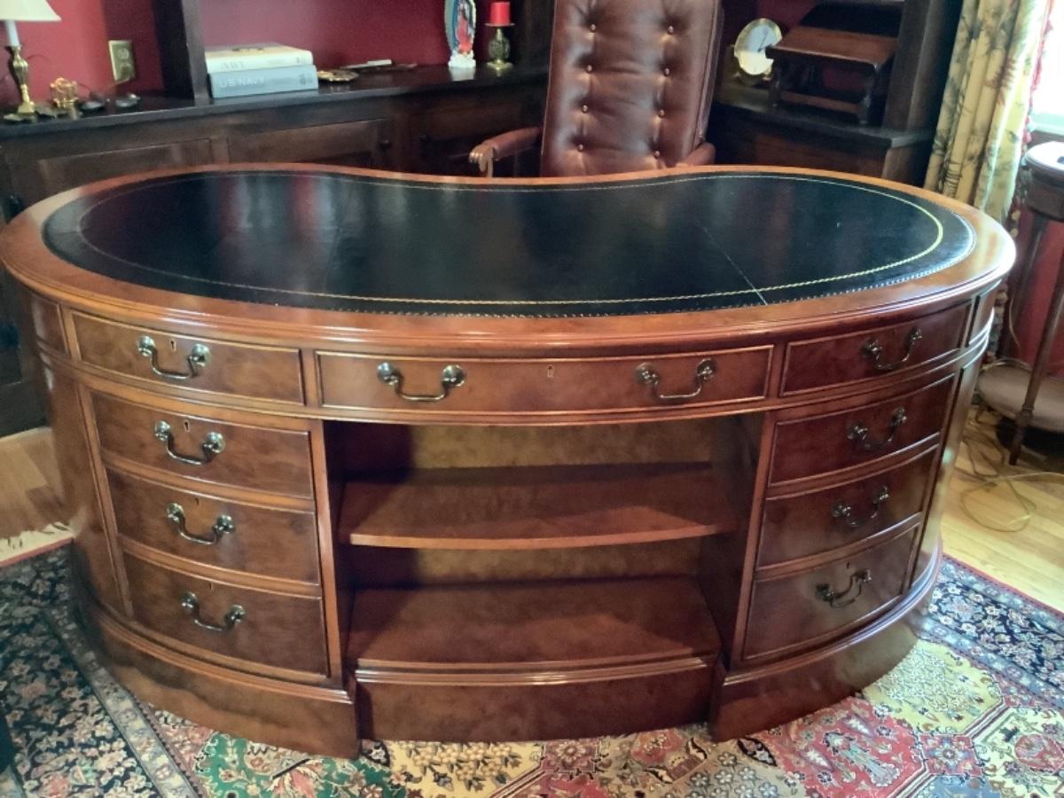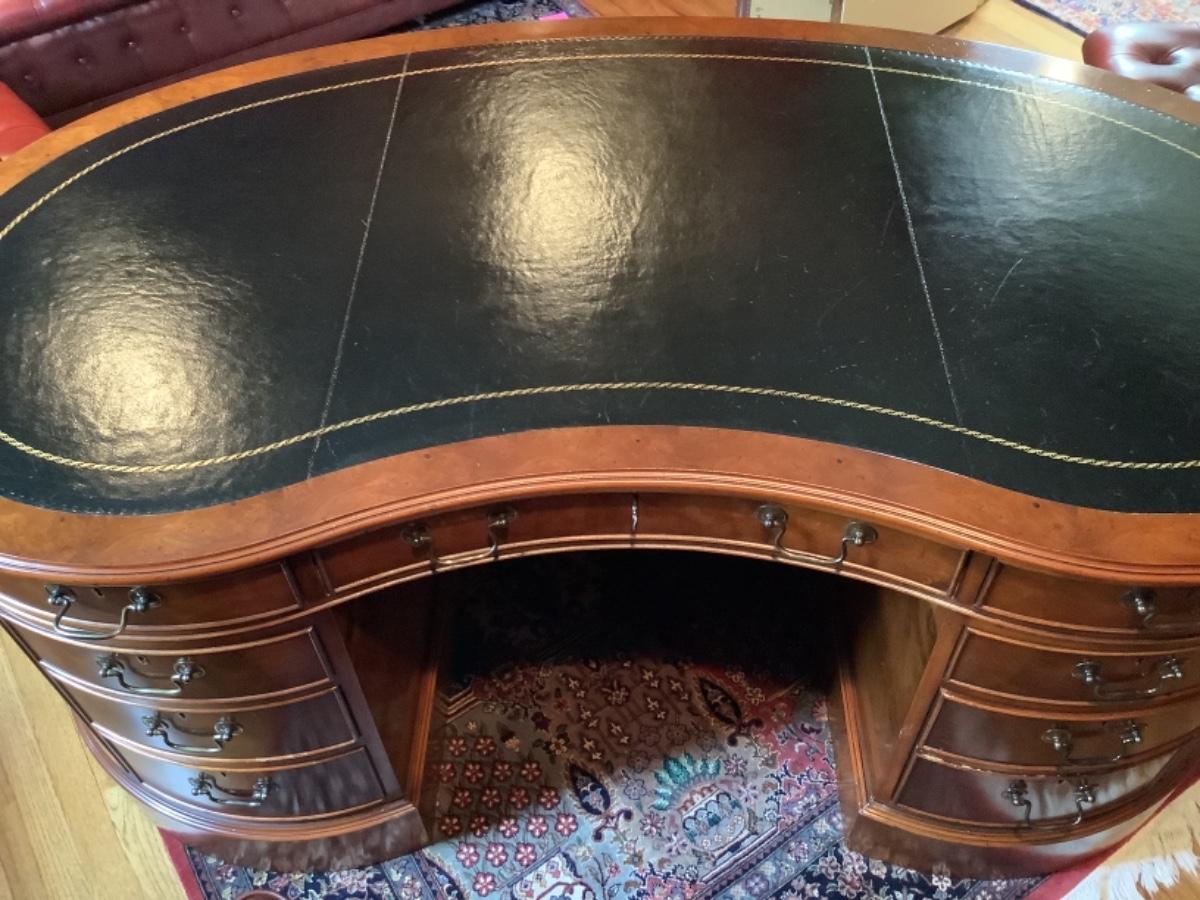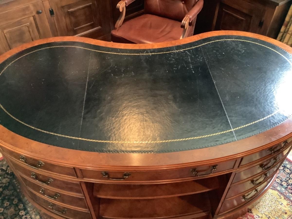 Large Myrtle Burl Yorkshire House Kidney Shaped Desk with Hand tooled Black Leather Top ( small areas of wear )