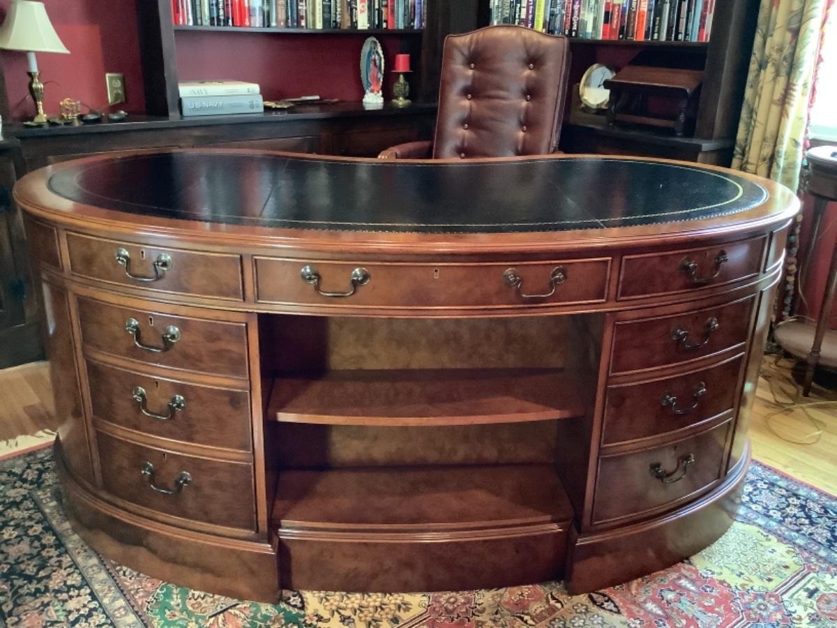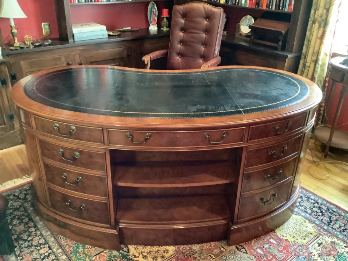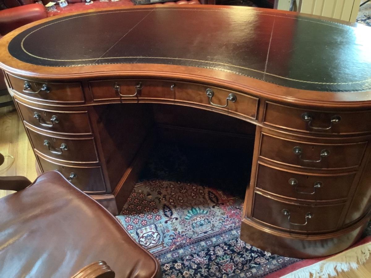 Large Myrtle Burl Yorkshire House Kidney Shaped Desk with Hand tooled Black Leather Top ( small areas of wear )
