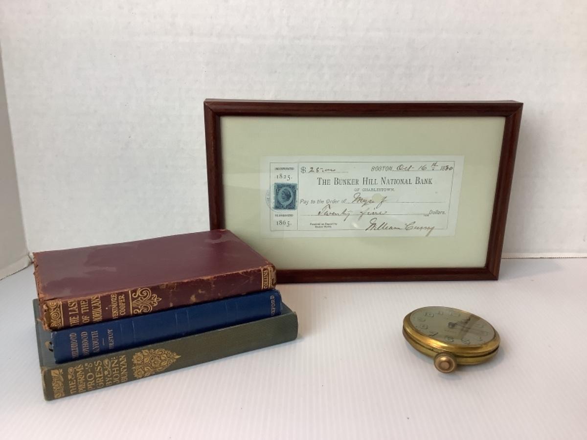 B804 Framed Bank Note and 8-Day Pocket Watch, Antique Books