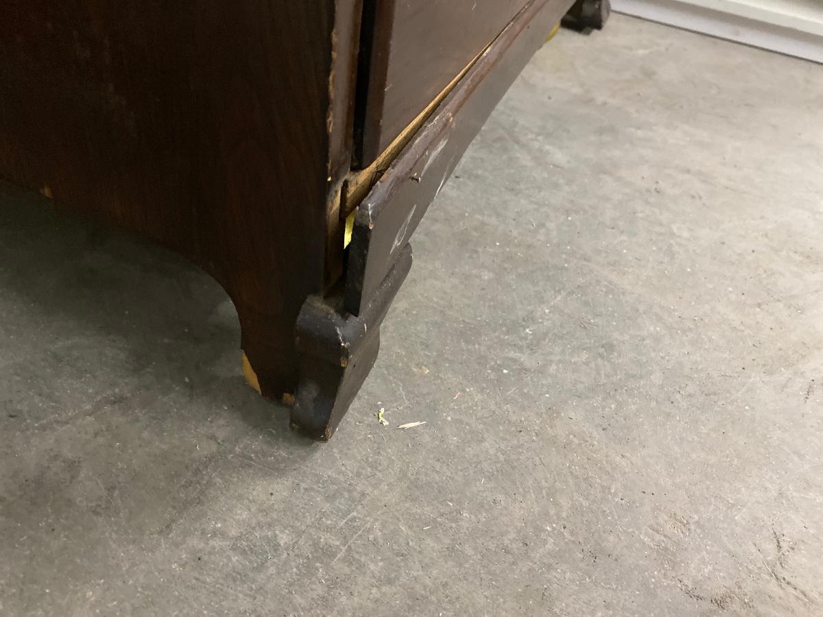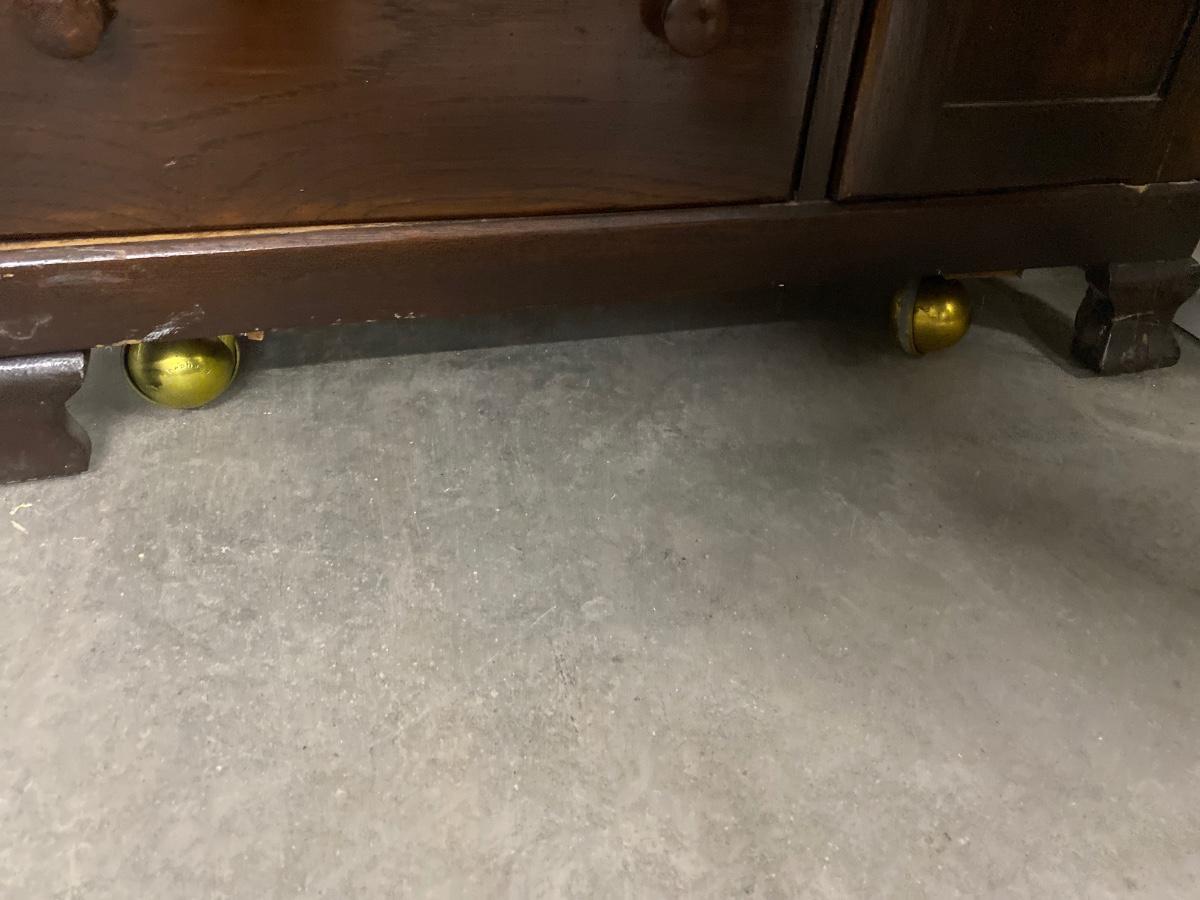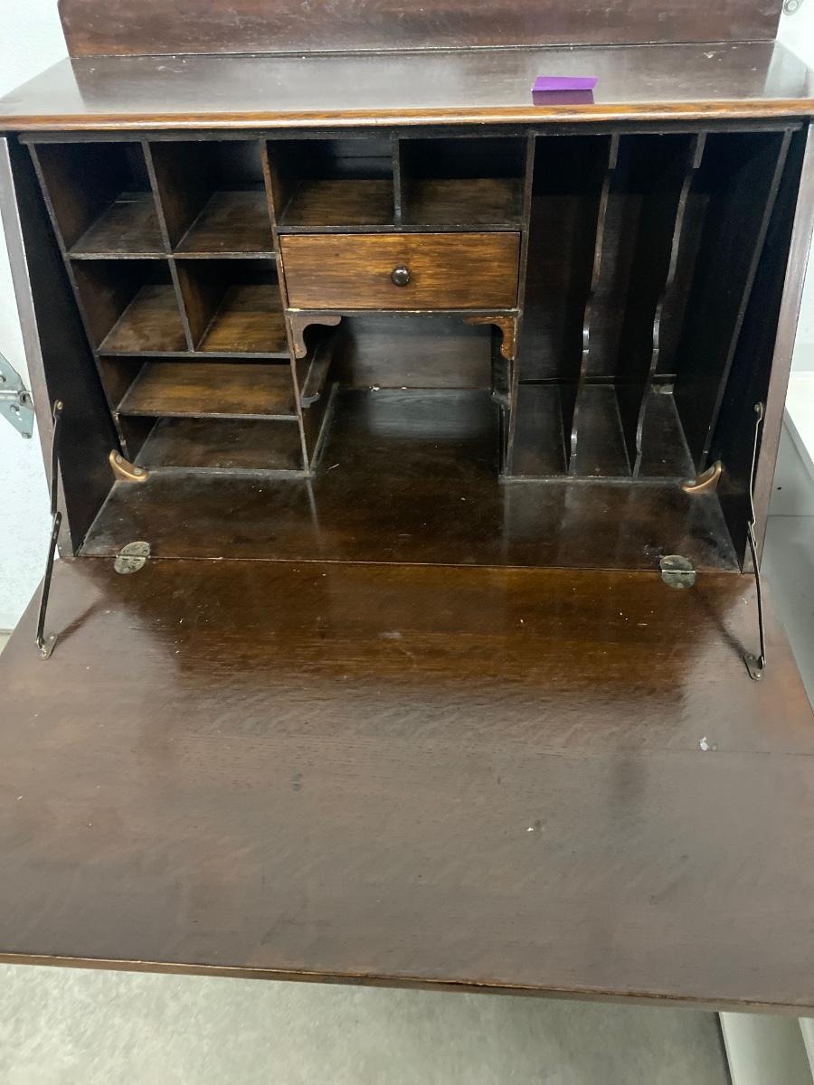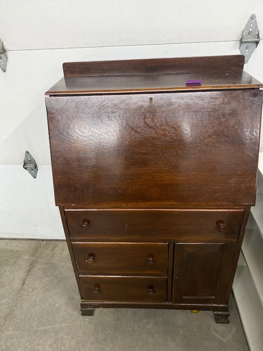 B9 secretary desk, wheels were added later. Bottom board needs to be tacked on. H 48”, W 29 1/2, D 14 3/4