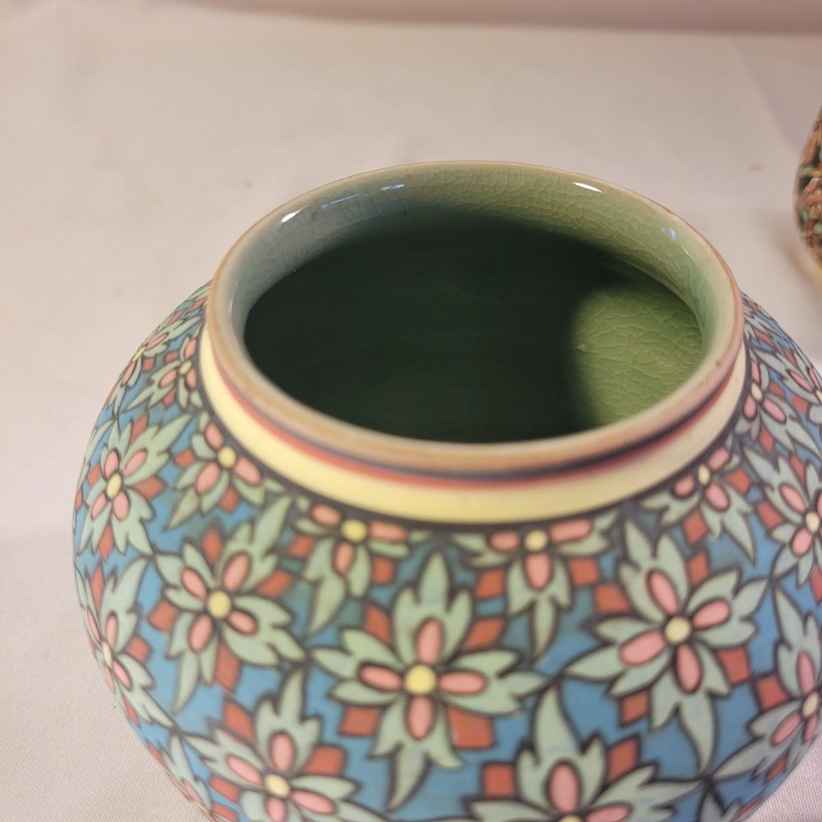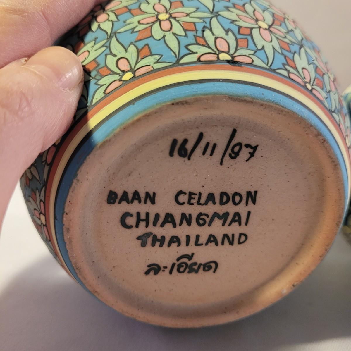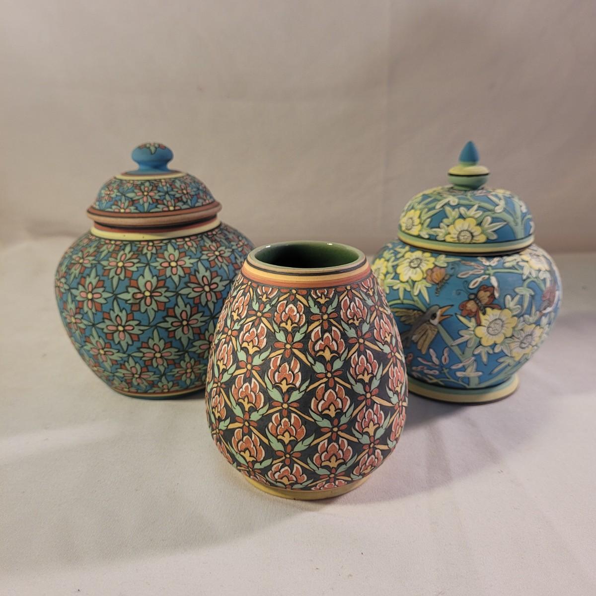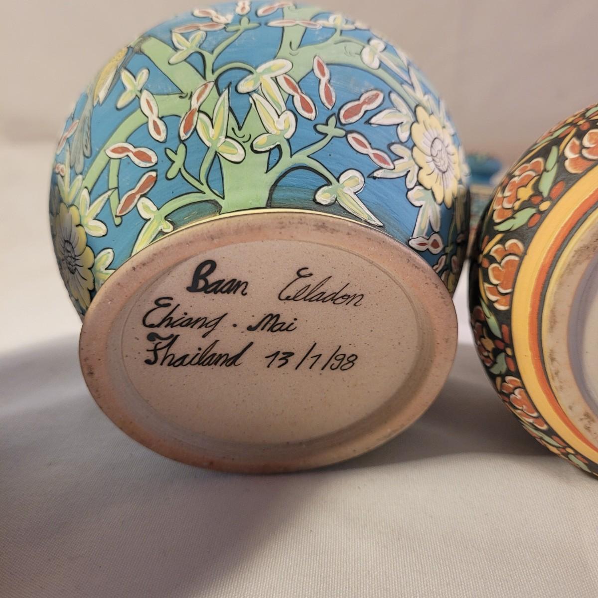 This collection of Baan Celedon jars and vase from Thailand are finely crafted with highly detailed etching and painting, and smoothly glazed interiors. Vase measures approximately 4”DIA x 4.5”H. Shipping available.