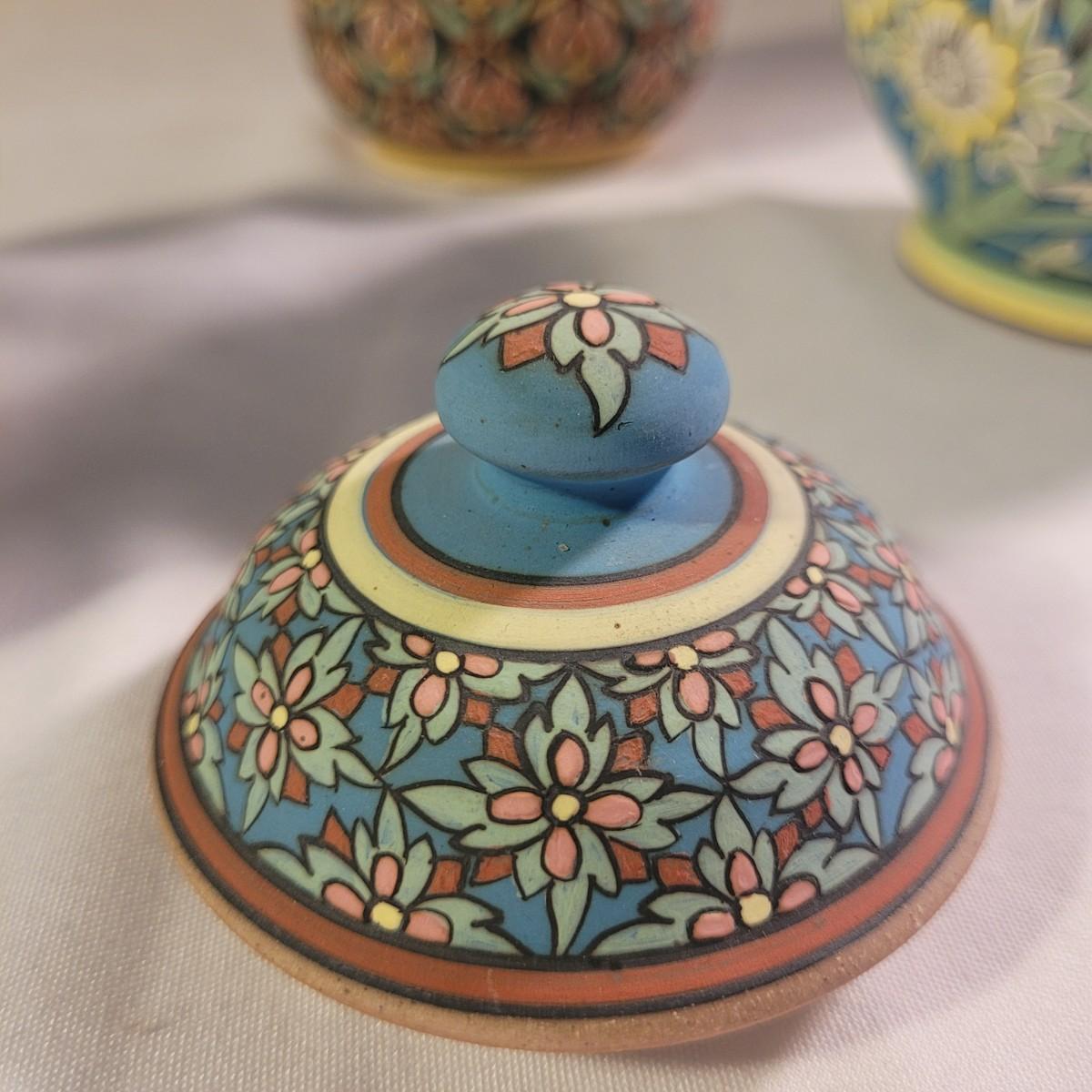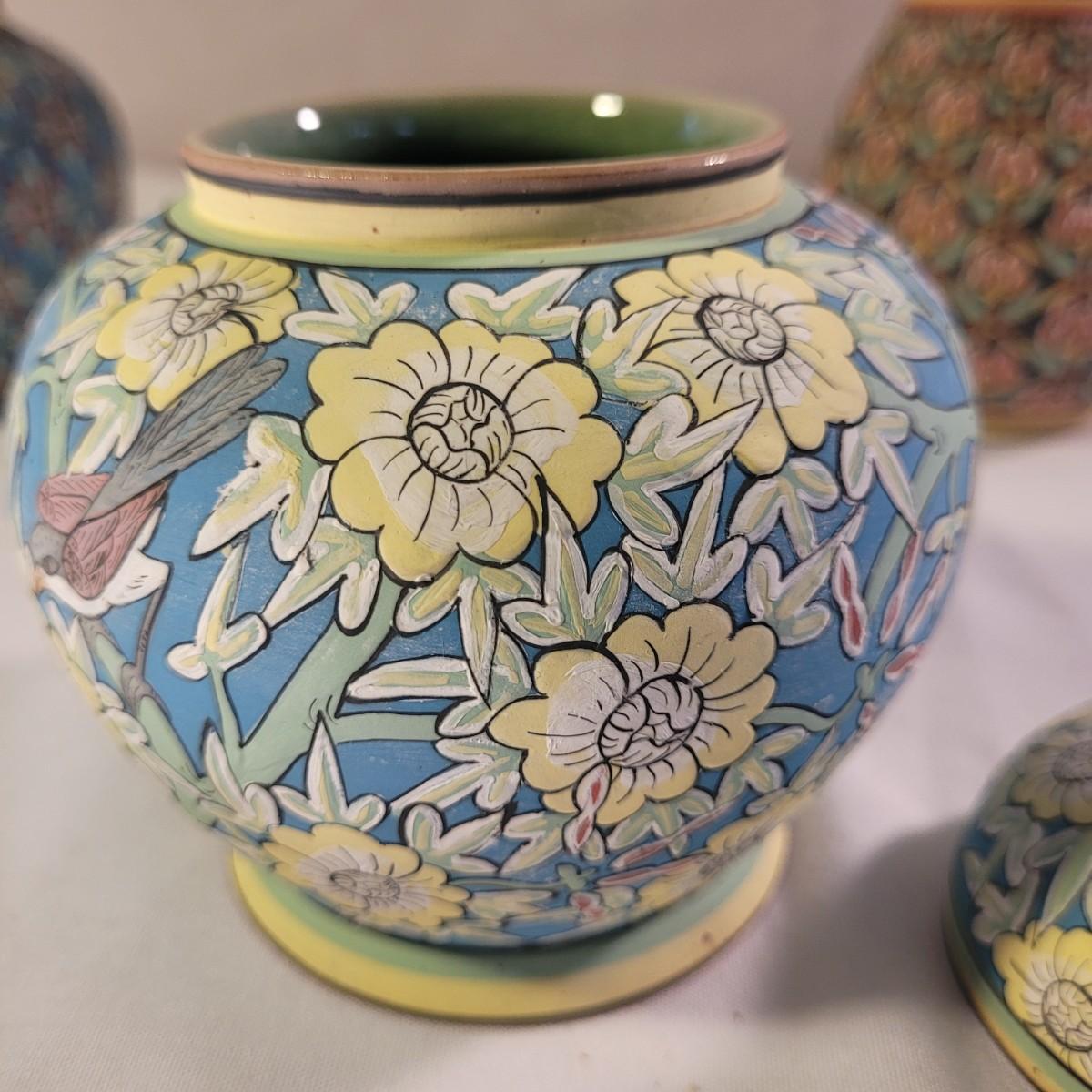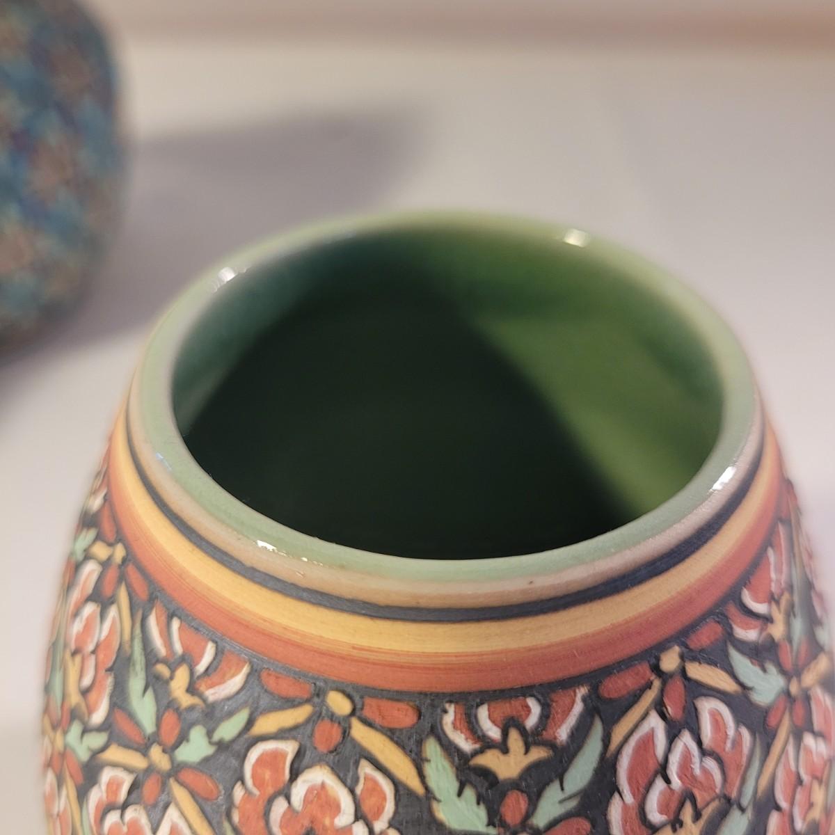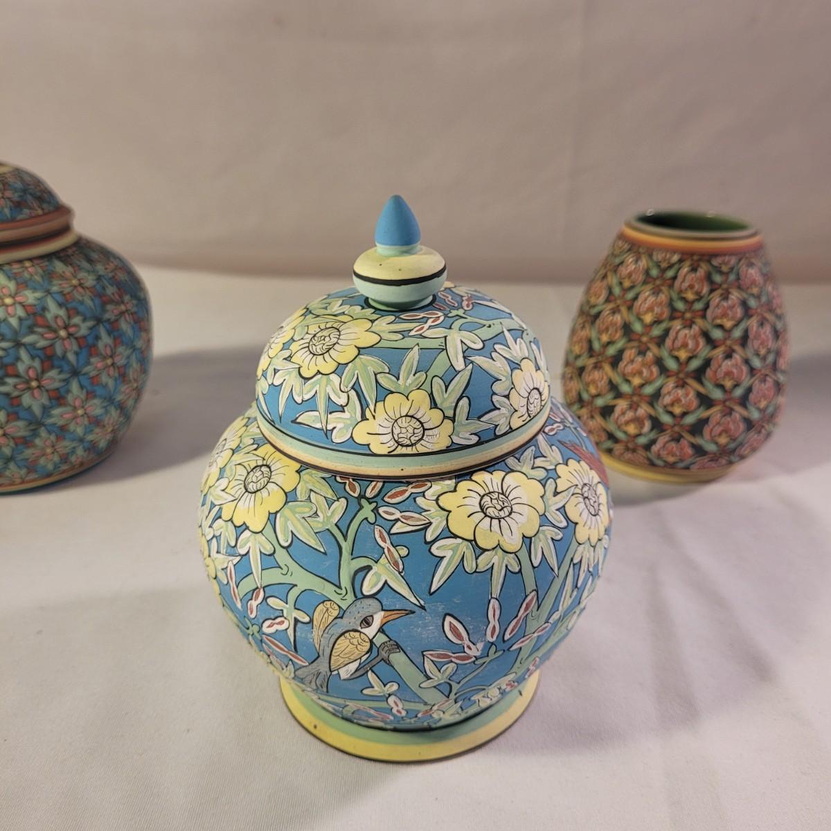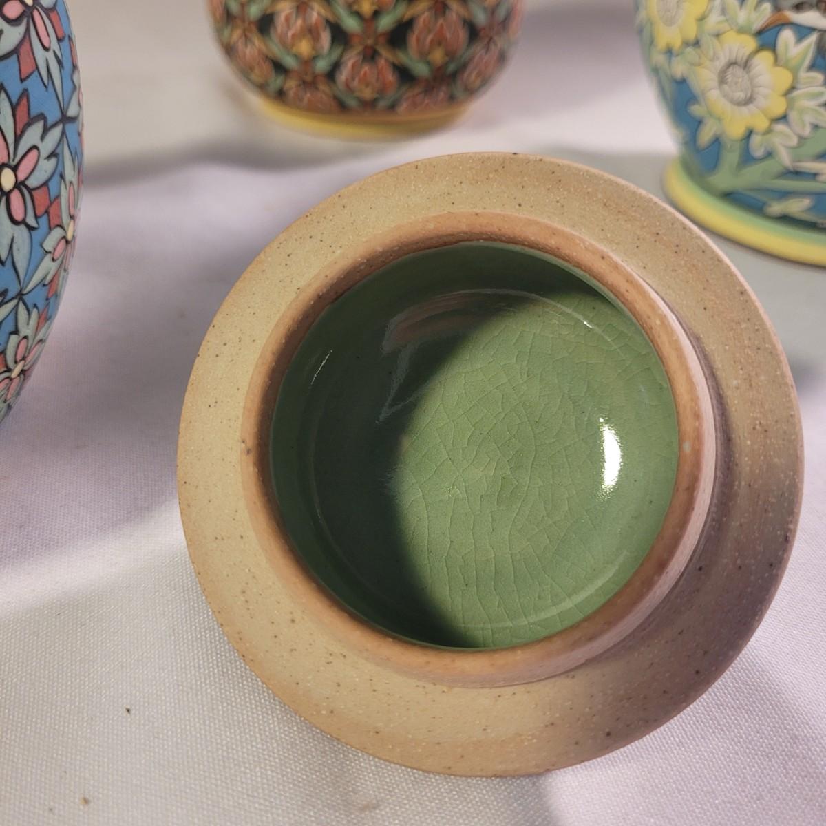 This collection of Baan Celedon jars and vase from Thailand are finely crafted with highly detailed etching and painting, and smoothly glazed interiors. Vase measures approximately 4”DIA x 4.5”H. Shipping available.