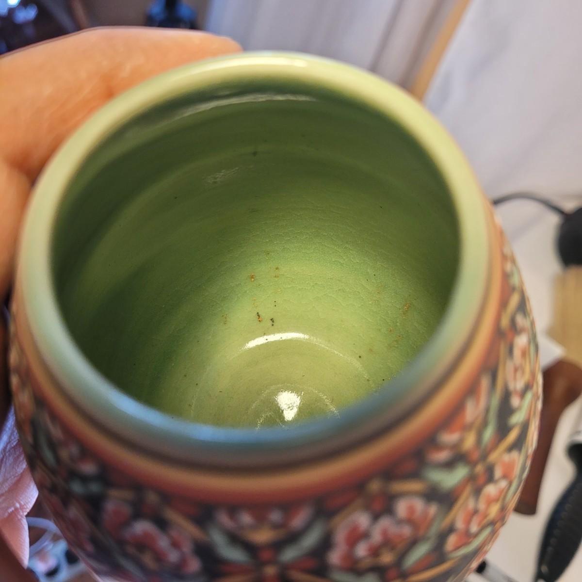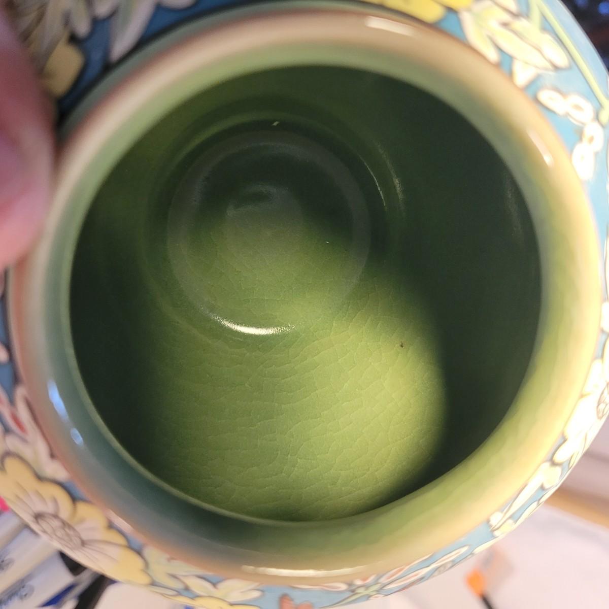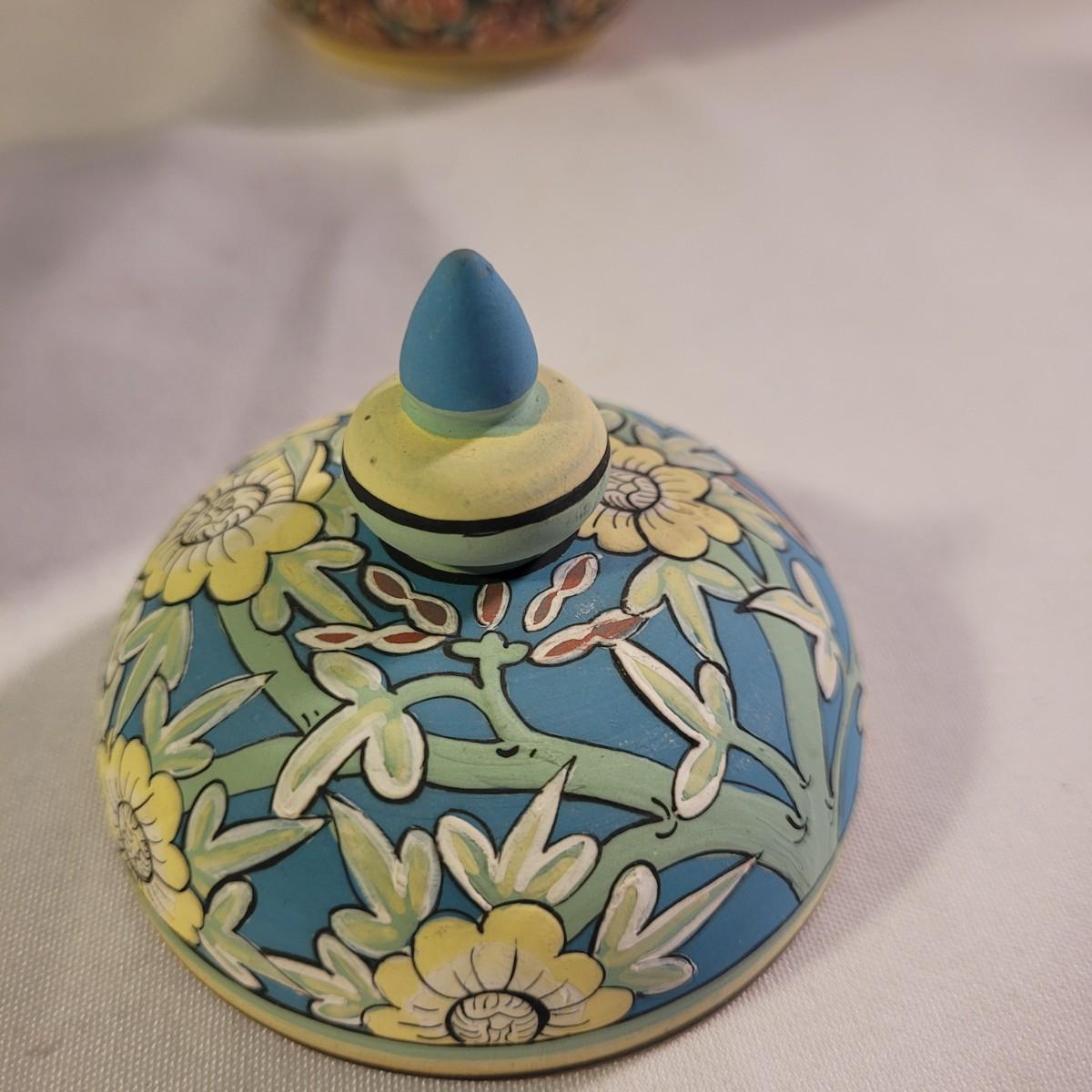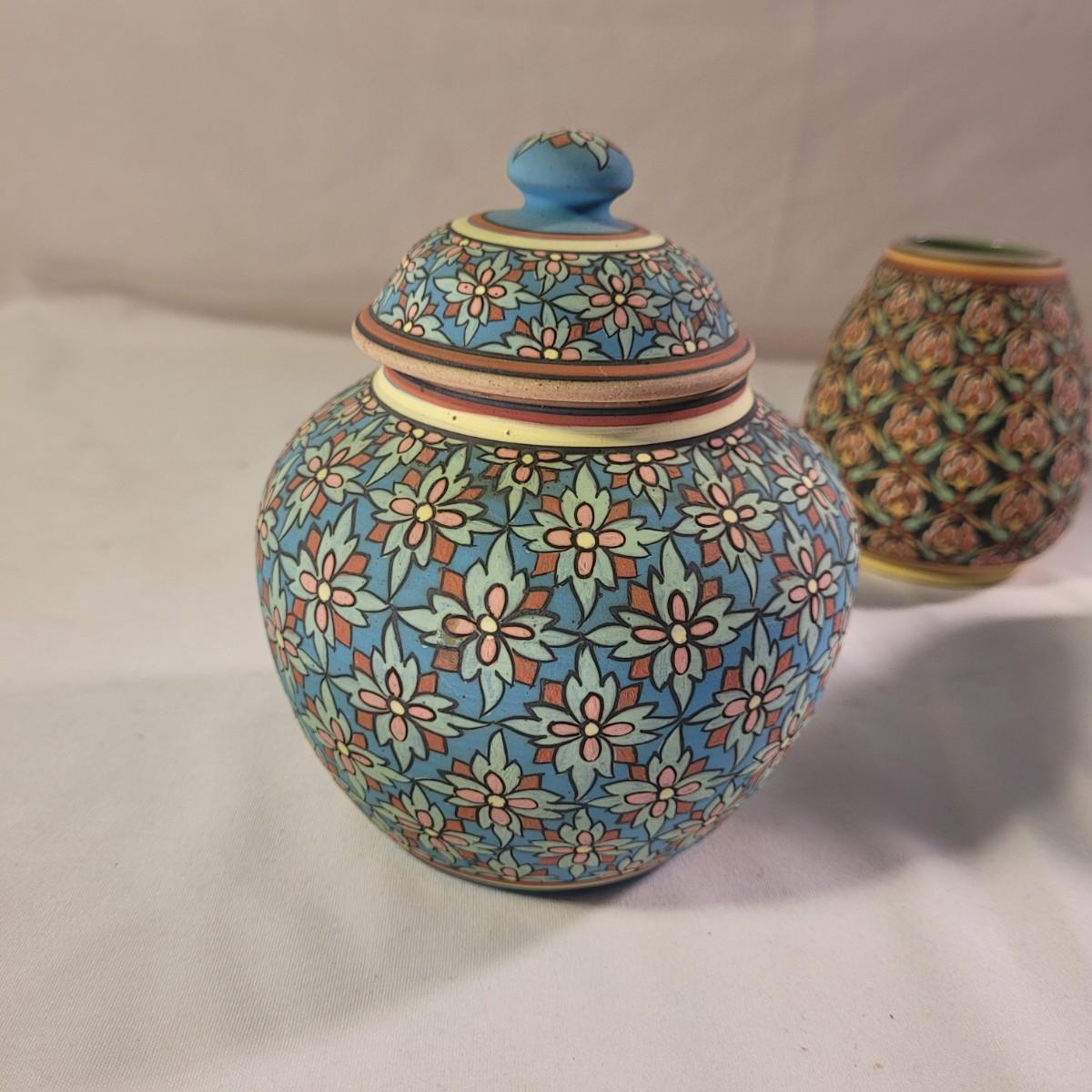 This collection of Baan Celedon jars and vase from Thailand are finely crafted with highly detailed etching and painting, and smoothly glazed interiors. Vase measures approximately 4”DIA x 4.5”H. Shipping available.