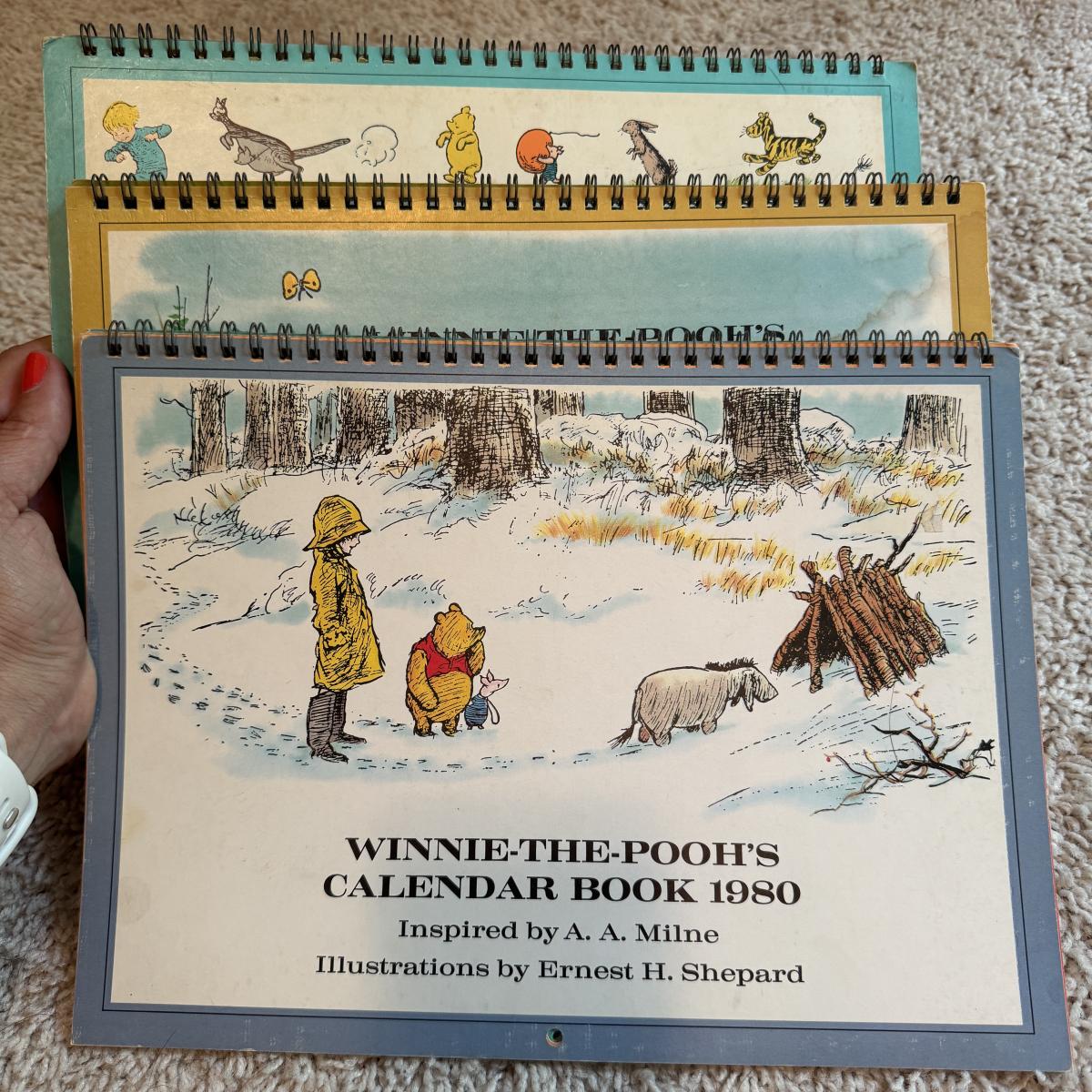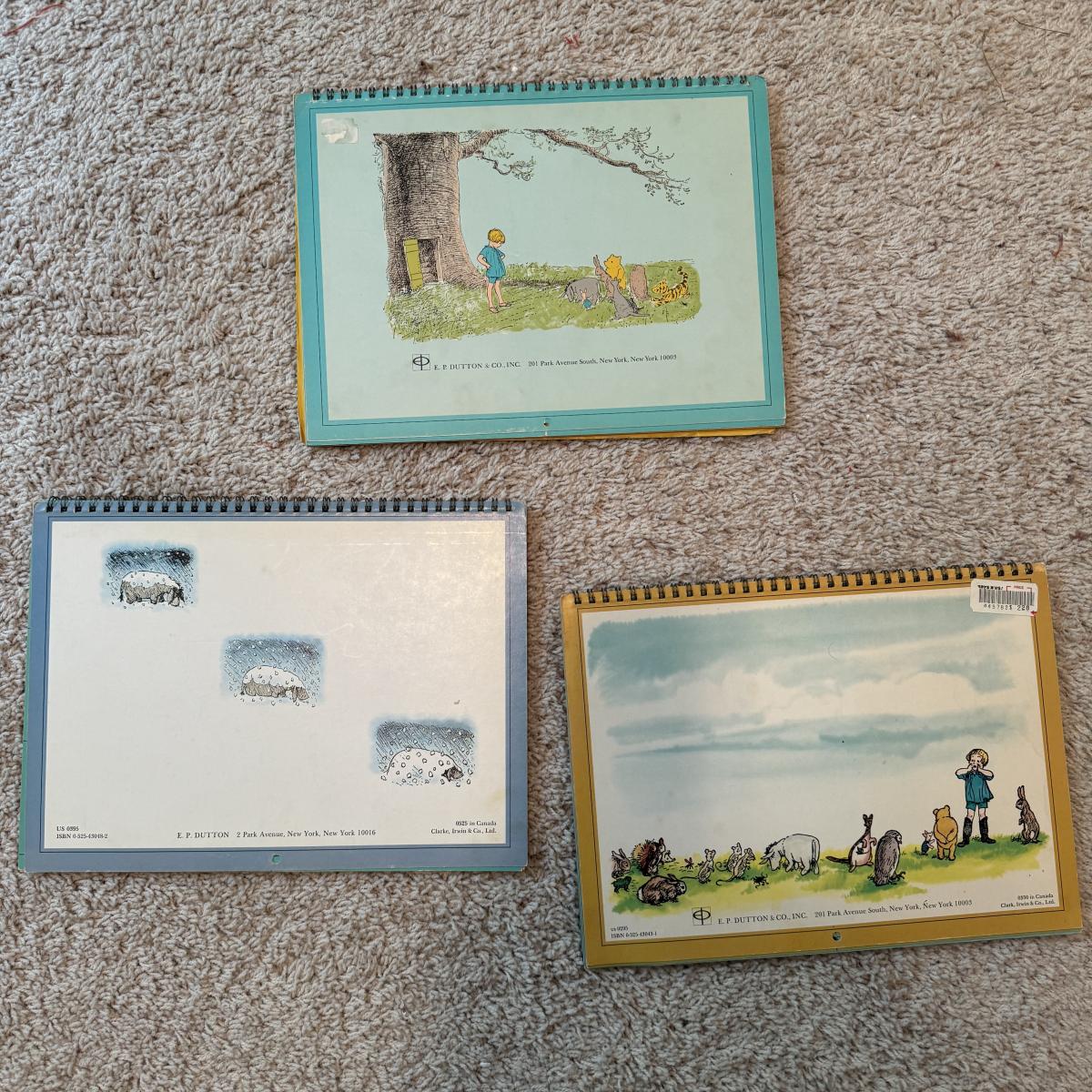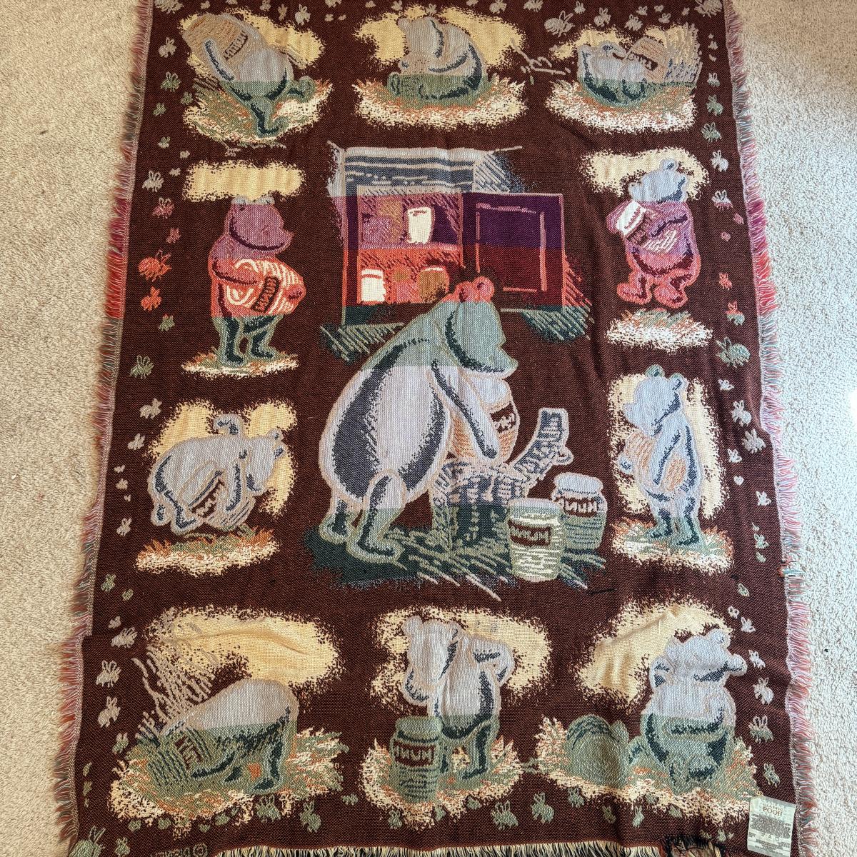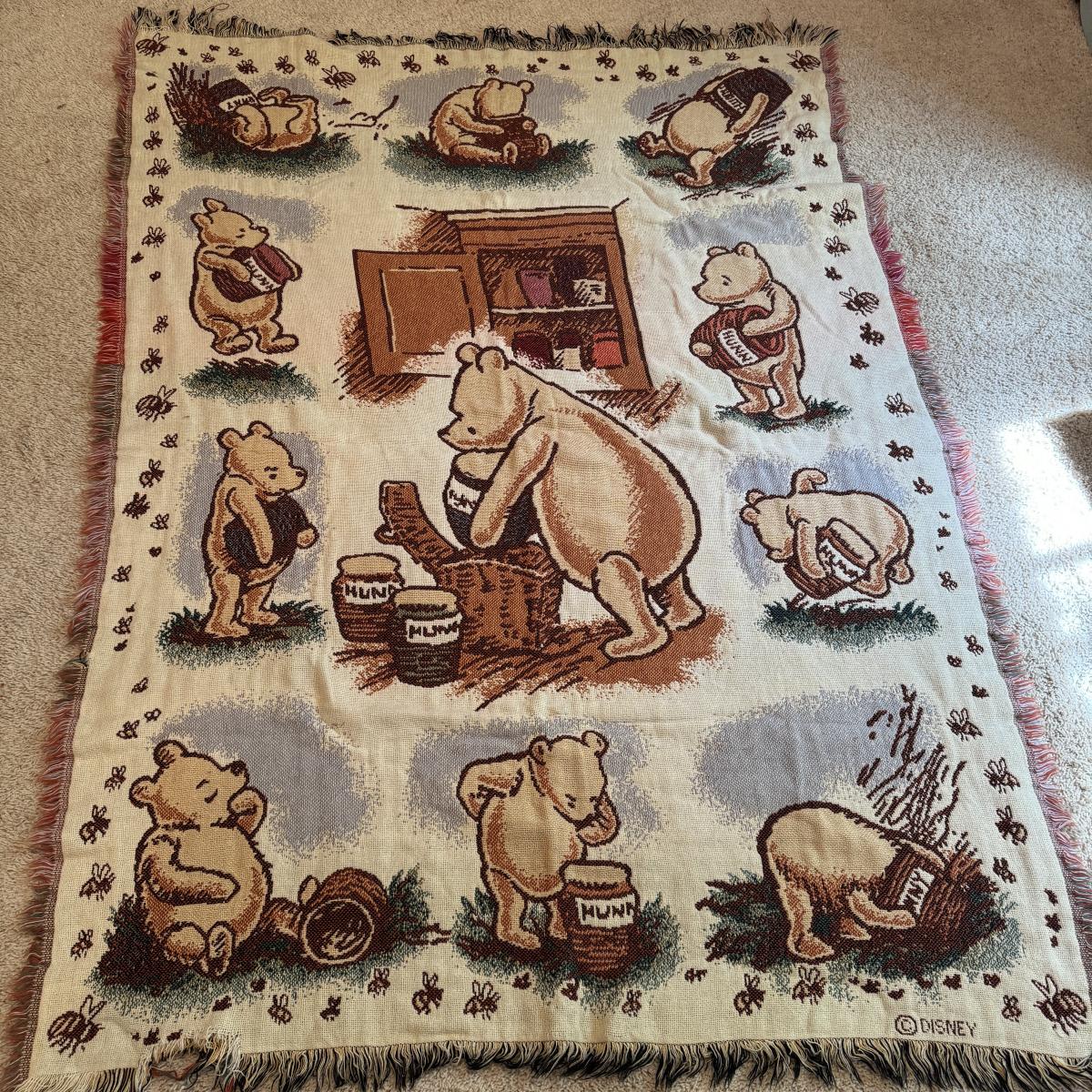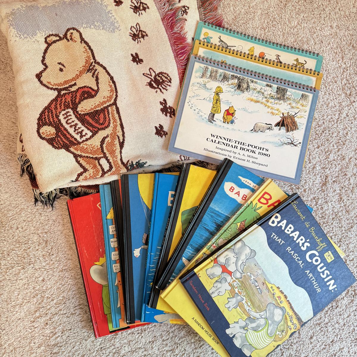 Lot includes ten hardcover books from the Babar series. Great condition. Also includes three spiral bound Winnie- The-Pooh calenders from 1973, 1976, and 1980. There are a few discolored areas but there doesn’t appear to be anything written in any of the calendars. The 1973 one has one page that has started to detach. See photo. Lot also includes a woven blanket with scenes of Winnie-The-Pooh. It’s a little larger than 3’ by 5’. Shipping available