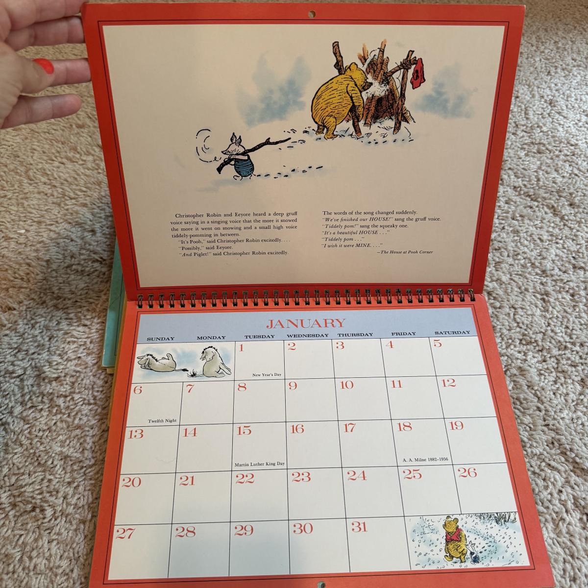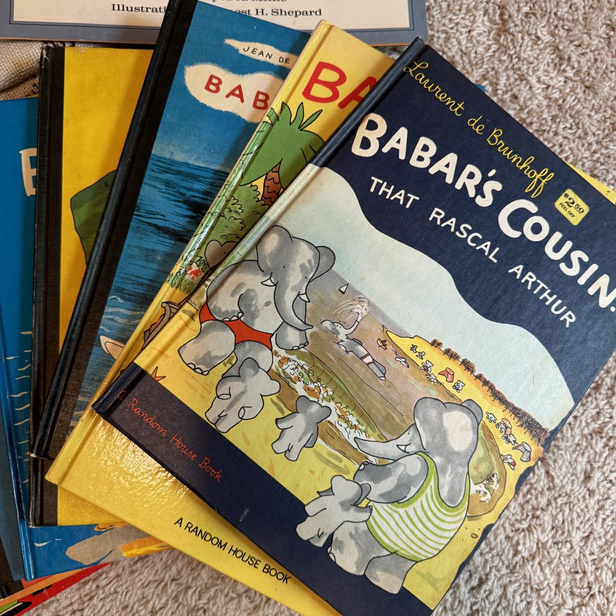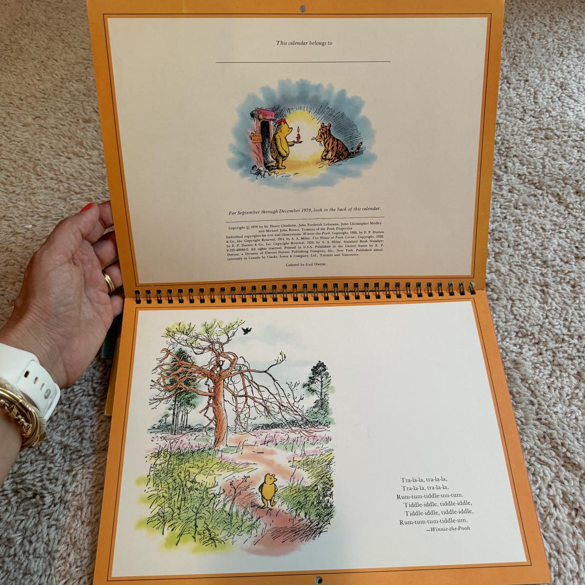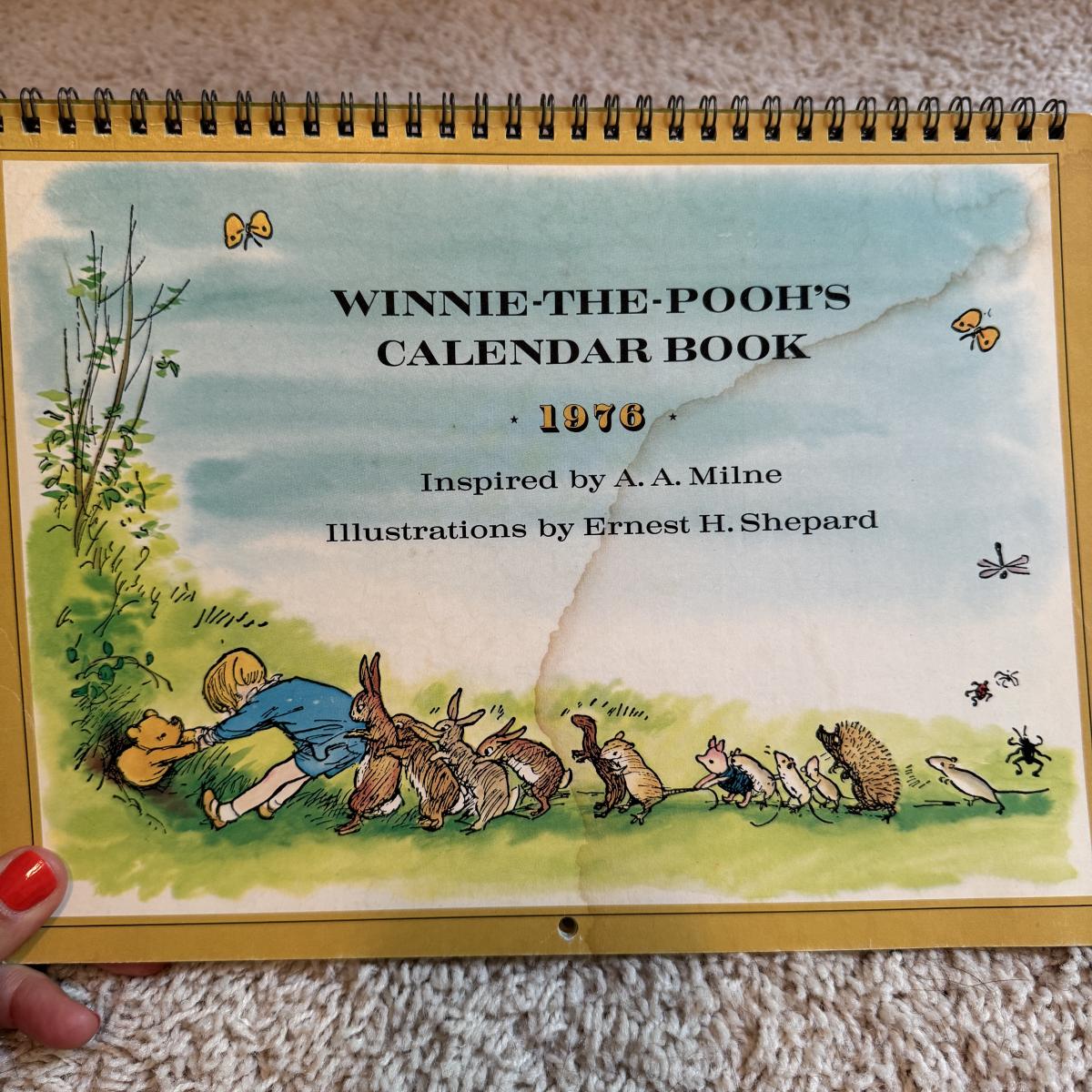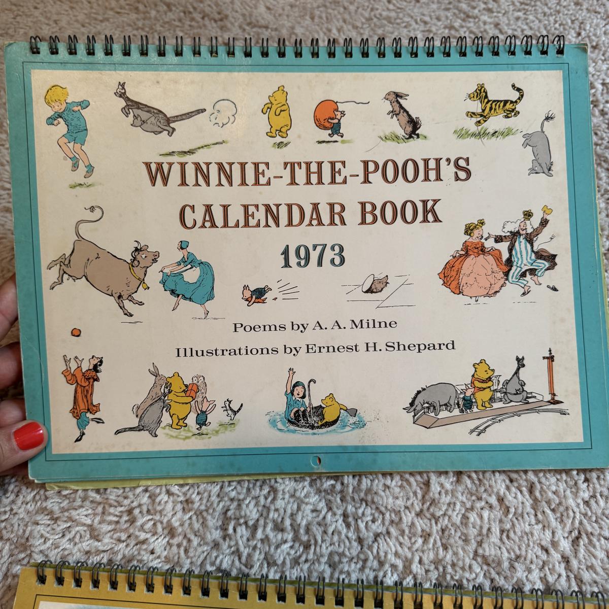Lot includes ten hardcover books from the Babar series. Great condition. Also includes three spiral bound Winnie- The-Pooh calenders from 1973, 1976, and 1980. There are a few discolored areas but there doesn’t appear to be anything written in any of the calendars. The 1973 one has one page that has started to detach. See photo. Lot also includes a woven blanket with scenes of Winnie-The-Pooh. It’s a little larger than 3’ by 5’. Shipping available