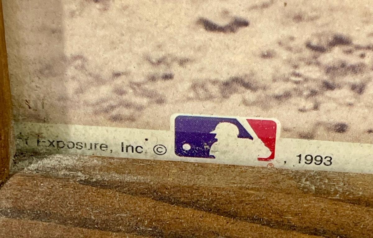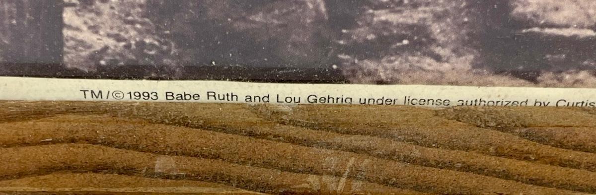 Babe Ruth and Lou Gehrig during their tour in 1927-28 playing exhibition baseball games with the "Bustin' Babes" and the "Larrupin' Lous". Officially licensed and authorized through MLB in 1993. Carries signatures from both players, but this photo is a modern reproduction. Trade marks and licensing info visible along bottom edge of photo.