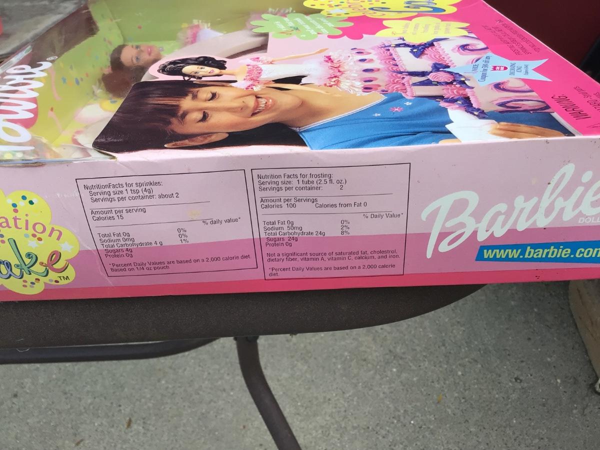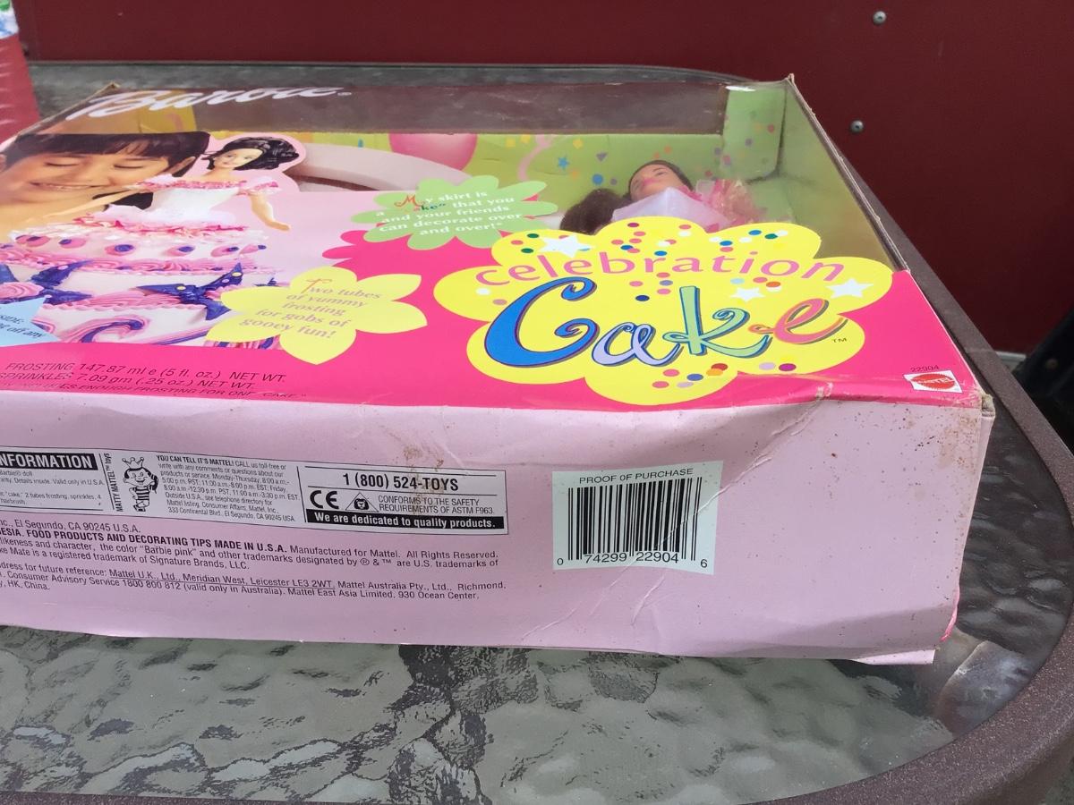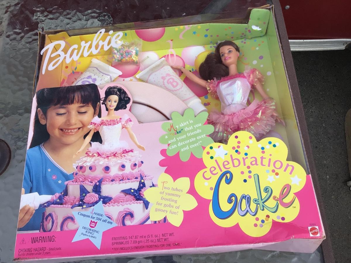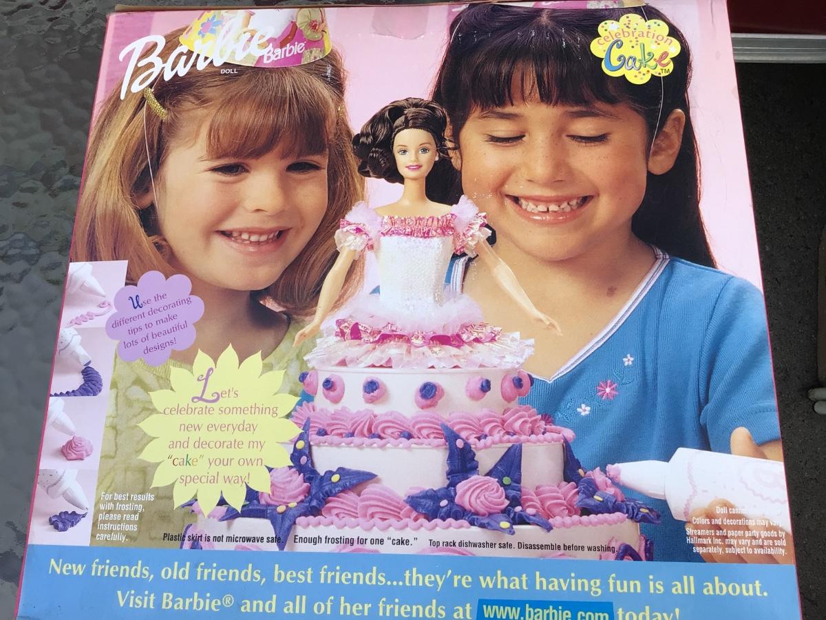 Barbie celebration of cake, has everything to bake and decorate a cak, including a Barbie. The box was open, but it has never been take out of the box. The box does have some damage.