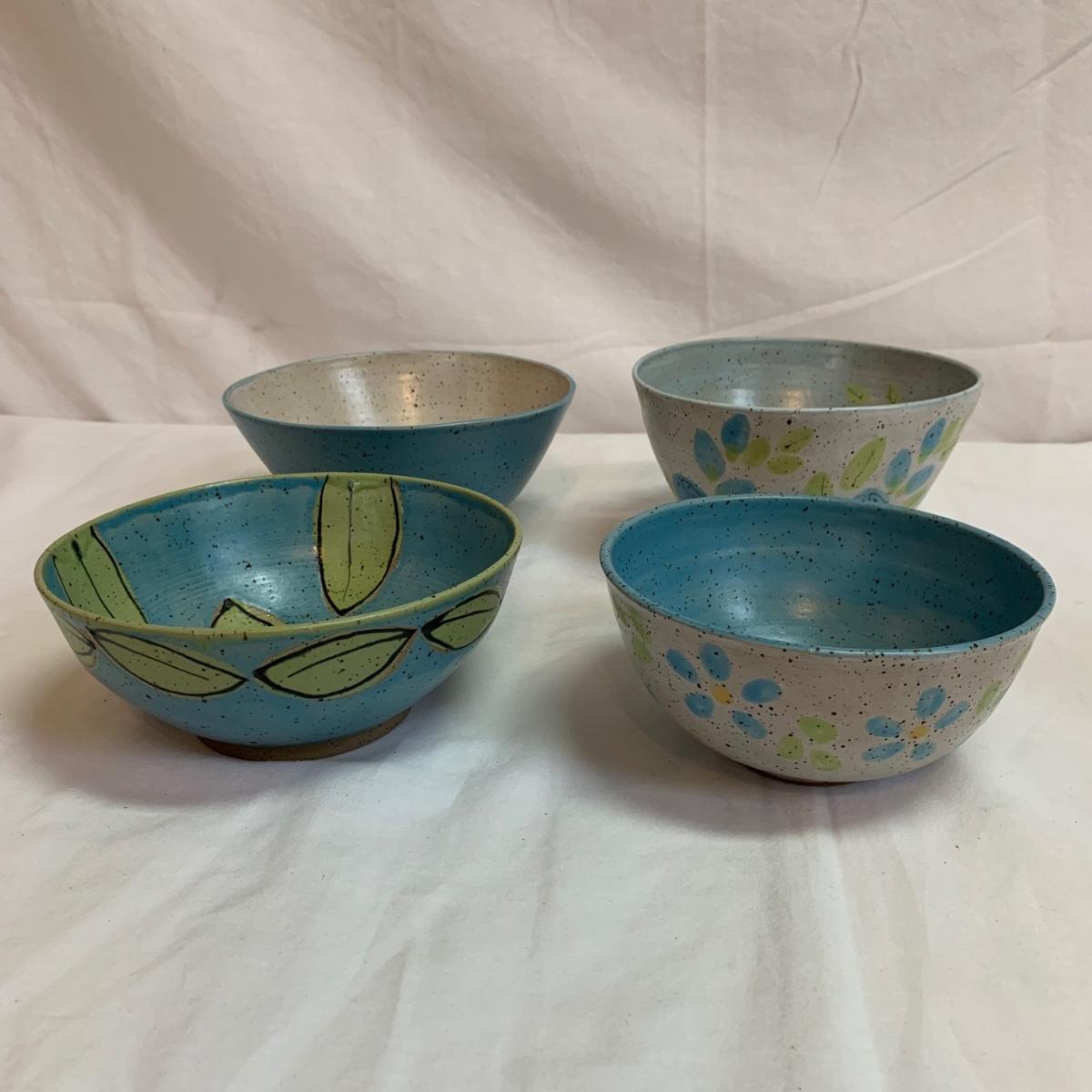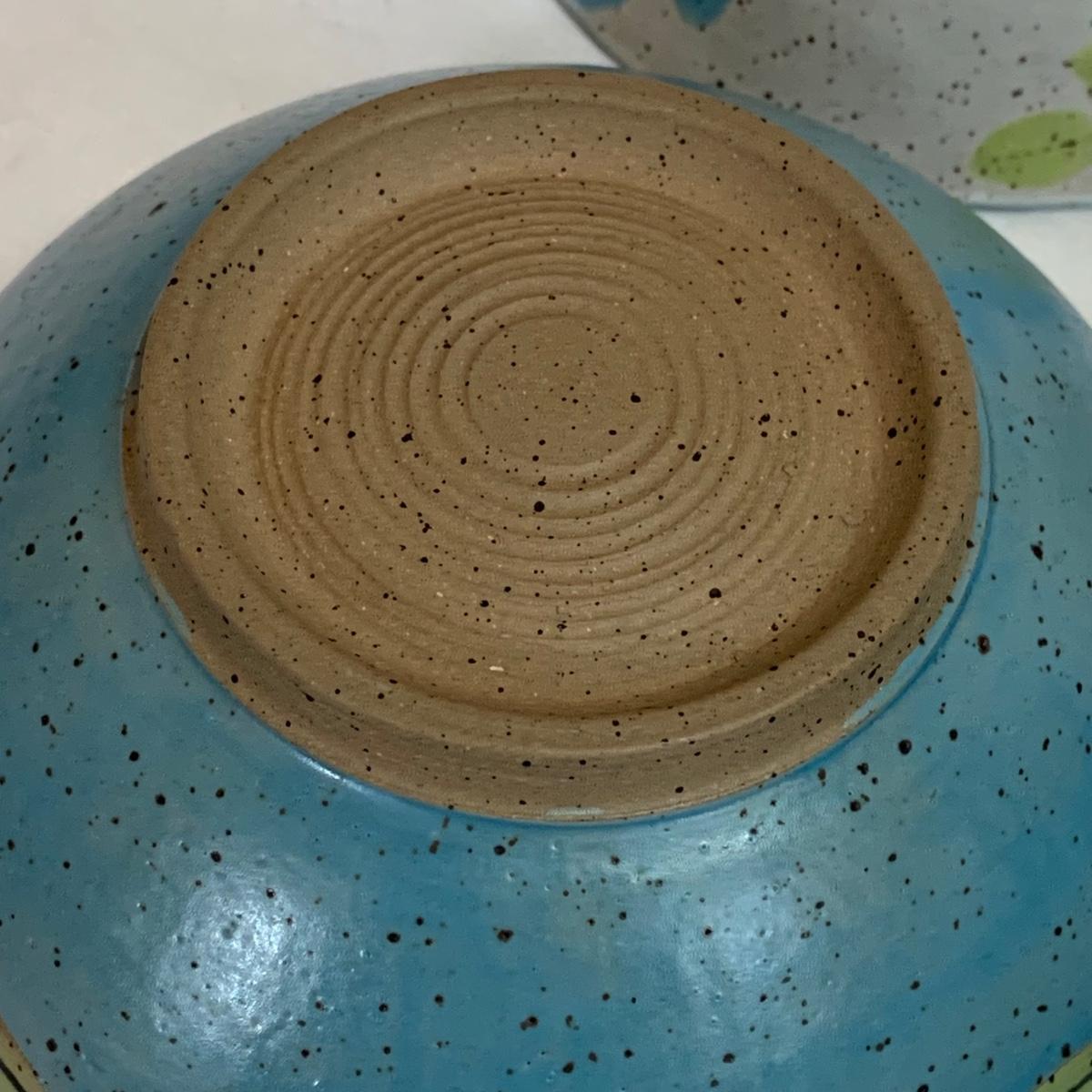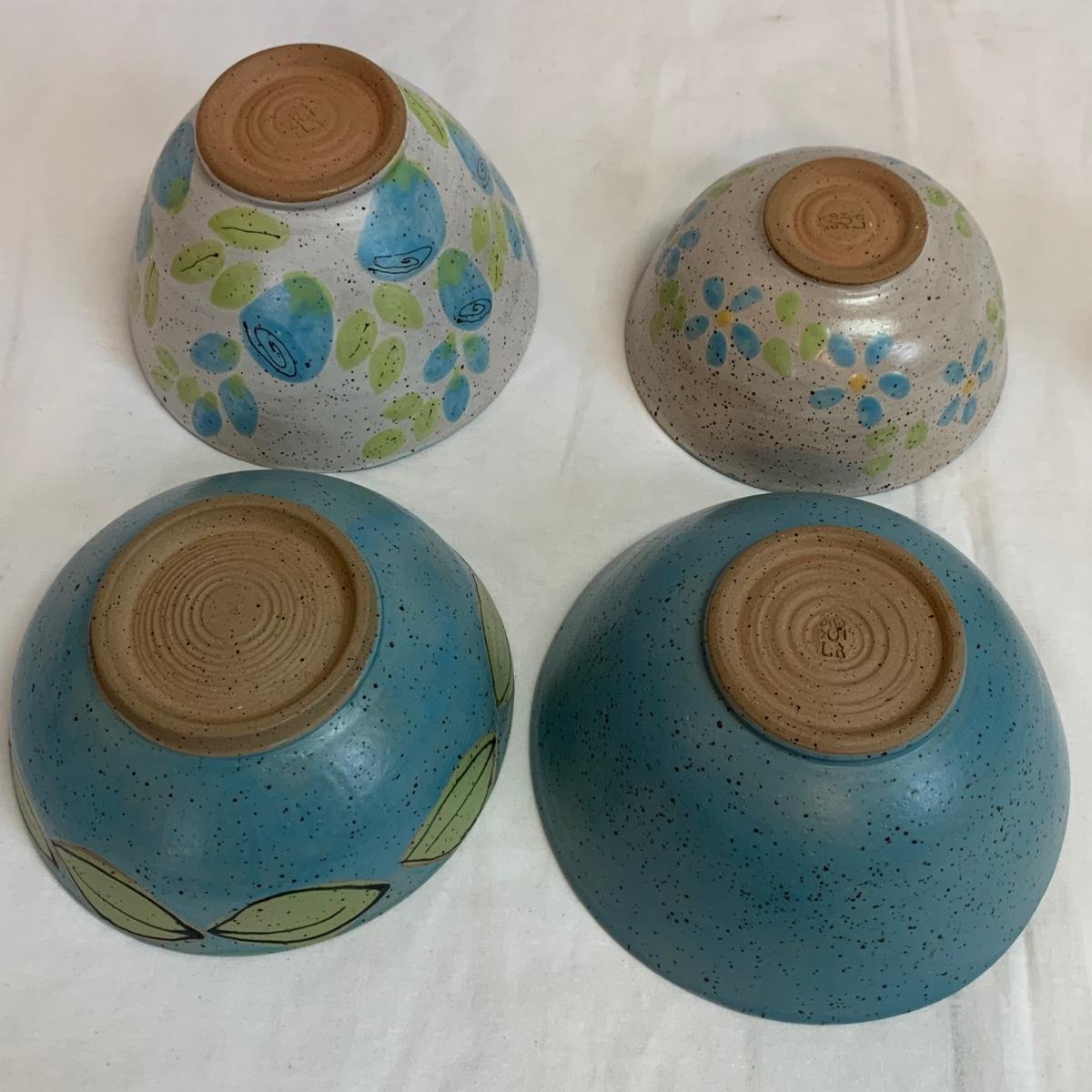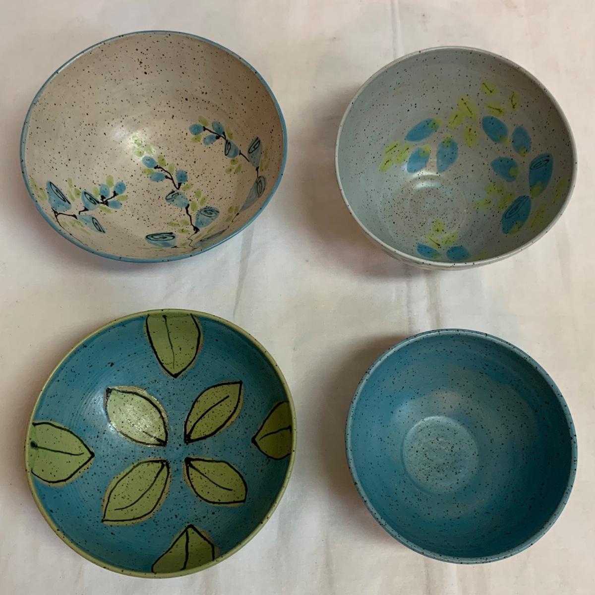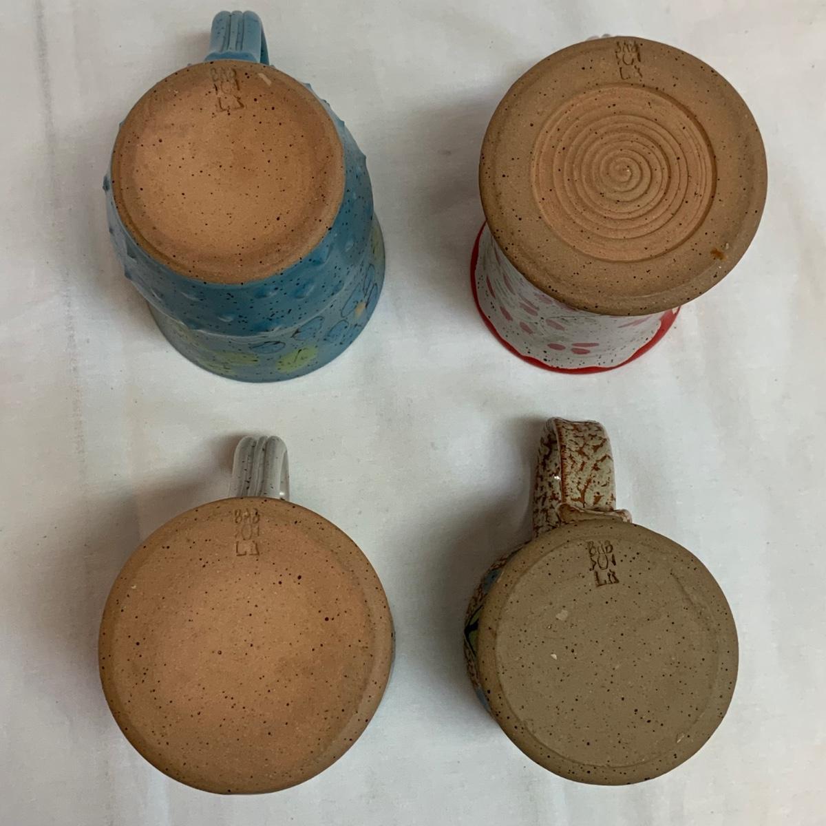 A collection of four mugs and four bowls, all ceramic, speckled clay. They are all but one piece, stamped ‘Babula’. For reference, the blue bowl with leaves is 7.5”D x 3”H. This bowl doesn’t have the Babula stamp, but appears to be from the same maker. Please see photos for inventory and details.