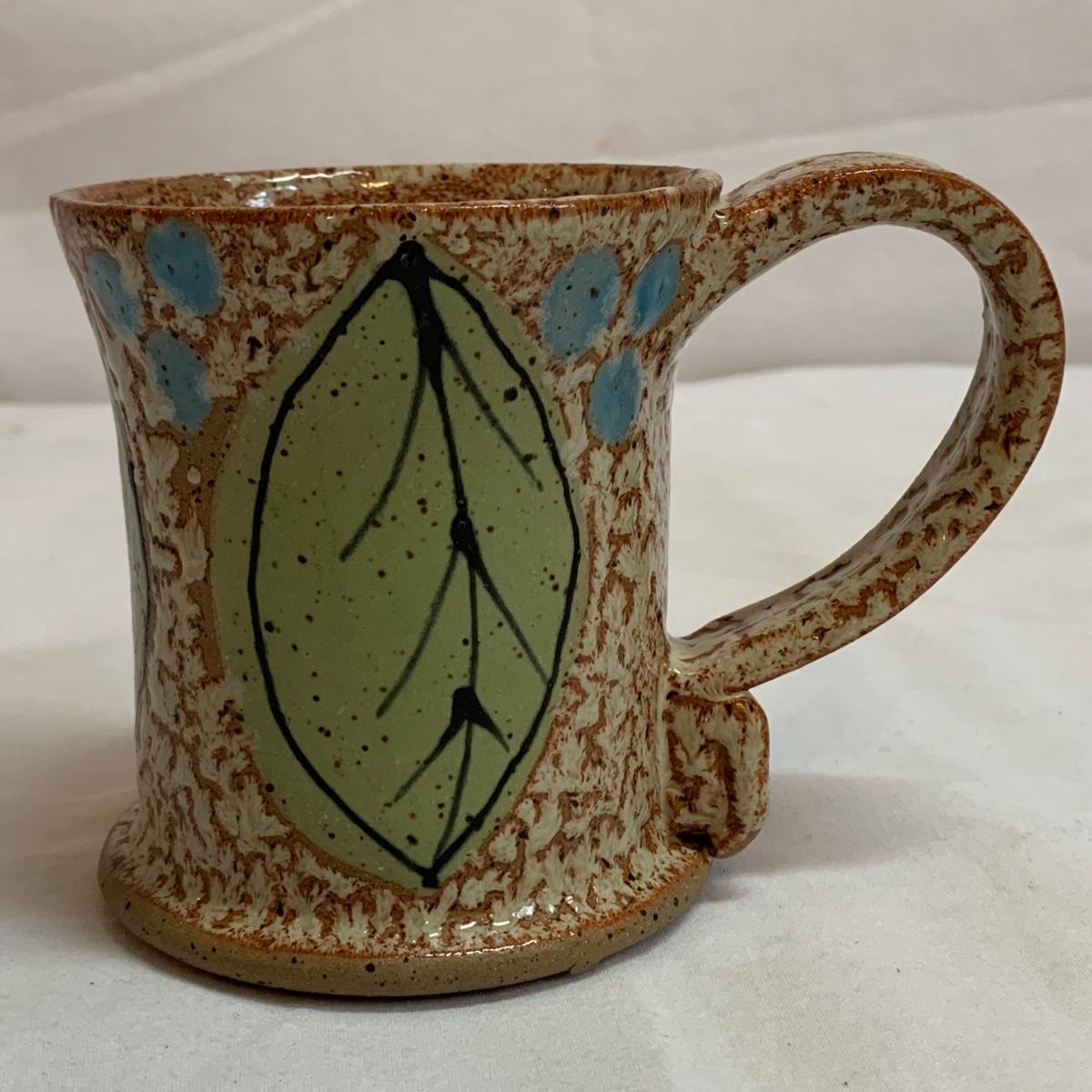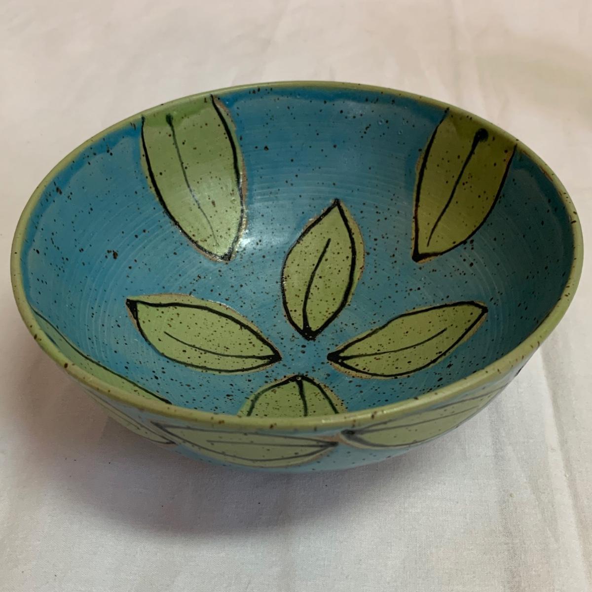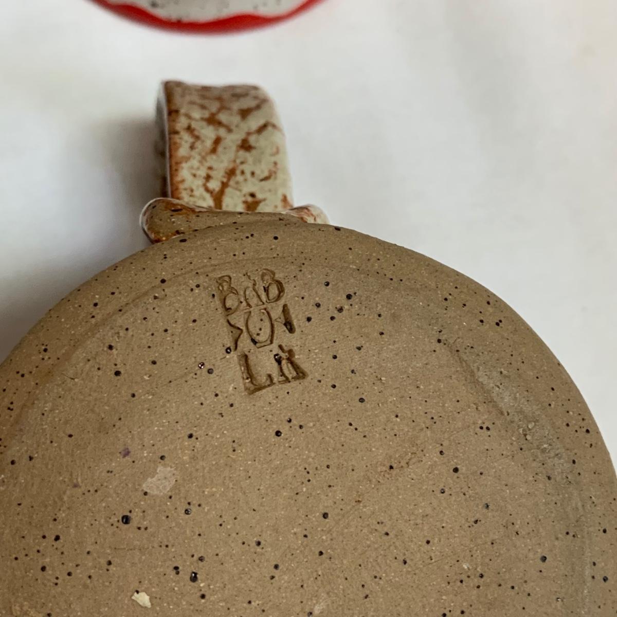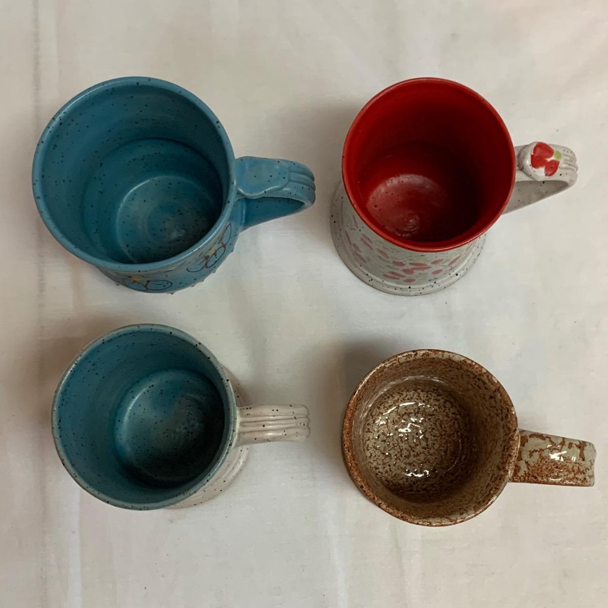 A collection of four mugs and four bowls, all ceramic, speckled clay. They are all but one piece, stamped ‘Babula’. For reference, the blue bowl with leaves is 7.5”D x 3”H. This bowl doesn’t have the Babula stamp, but appears to be from the same maker. Please see photos for inventory and details.