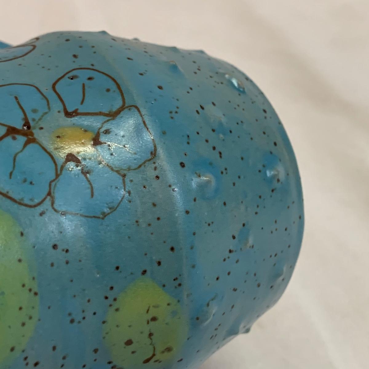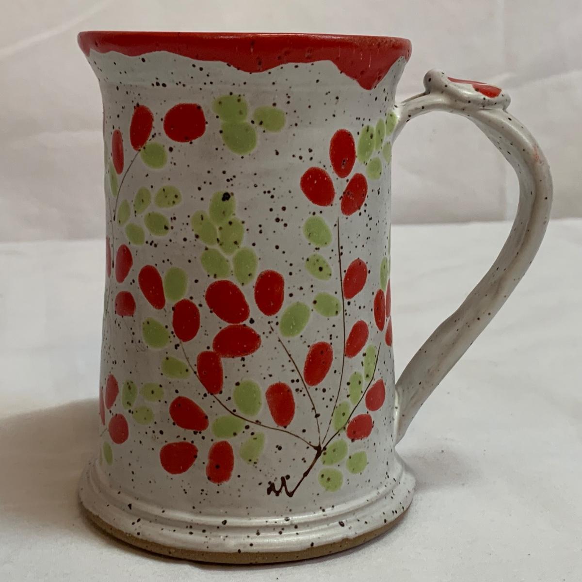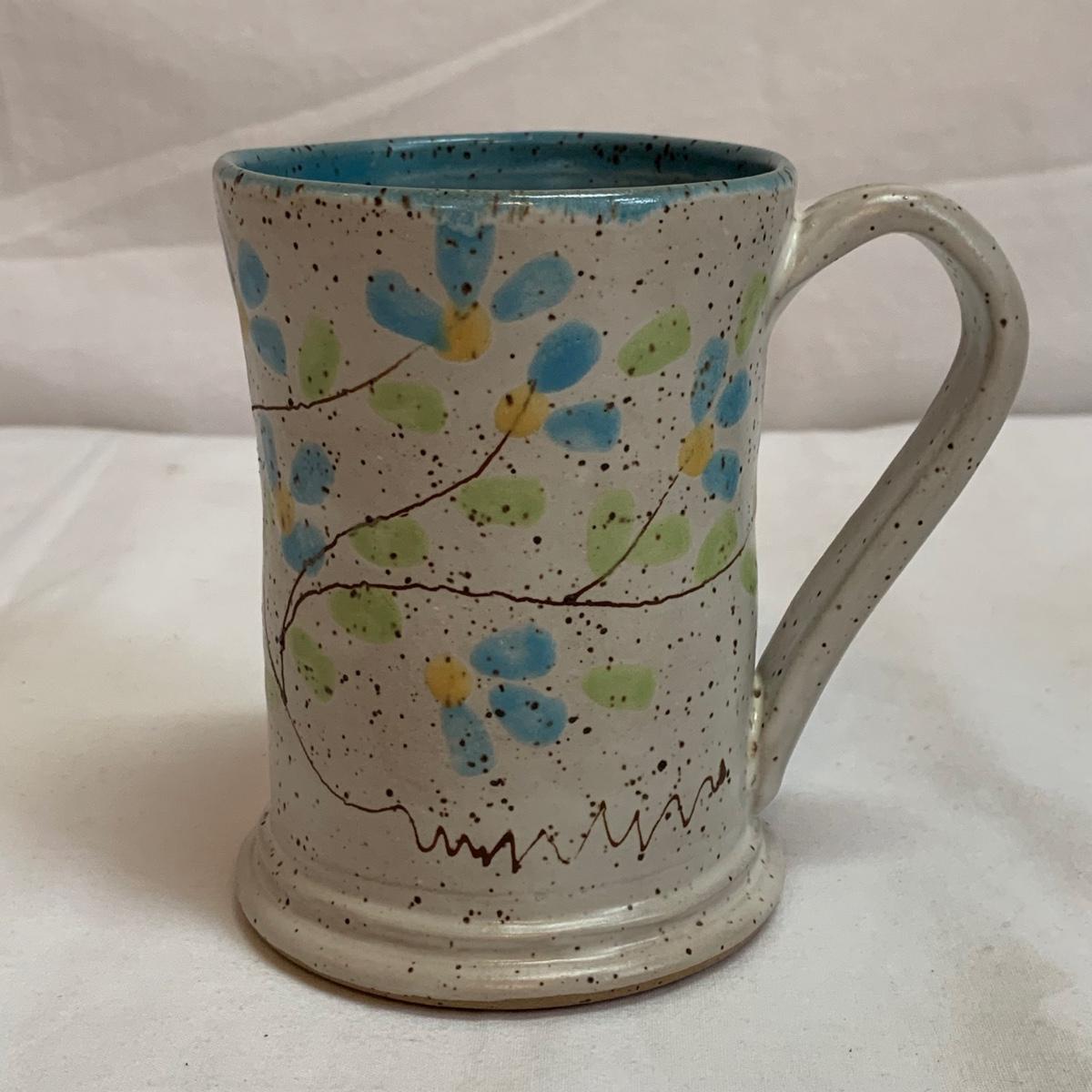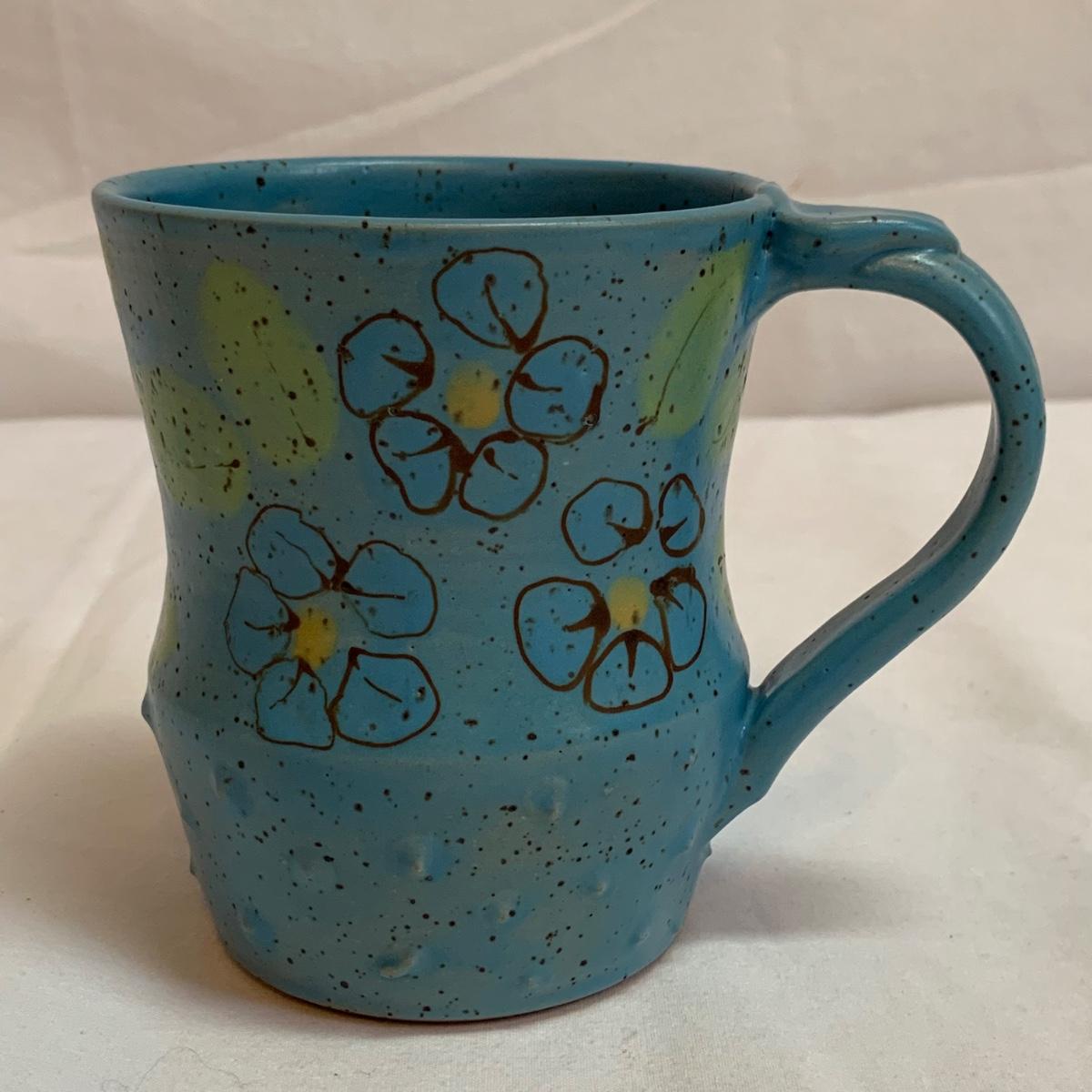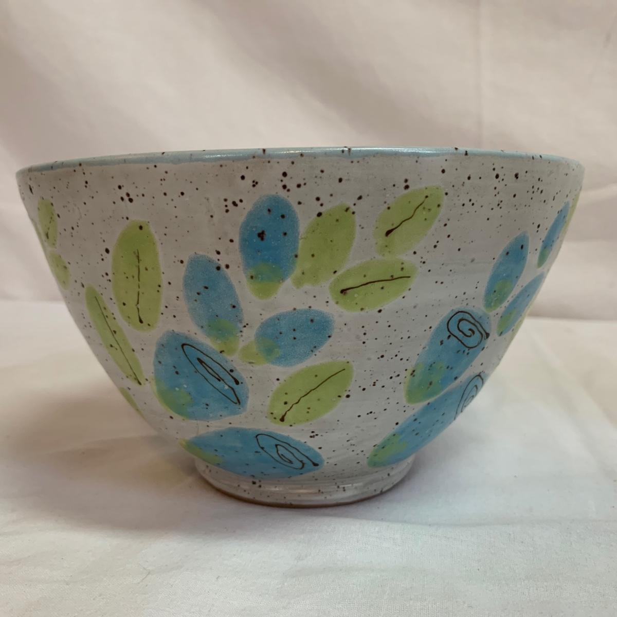 A collection of four mugs and four bowls, all ceramic, speckled clay. They are all but one piece, stamped ‘Babula’. For reference, the blue bowl with leaves is 7.5”D x 3”H. This bowl doesn’t have the Babula stamp, but appears to be from the same maker. Please see photos for inventory and details.