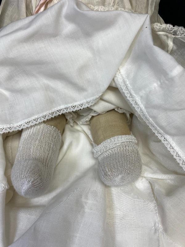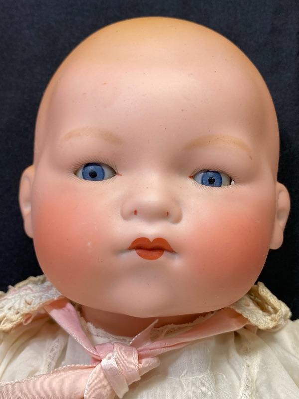 Vintage soft body baby doll. Bisque head, cloth body and plastic/celluloid hands. Blue sleep eyes. Head is marked AM Germany, the numbers below are hard to see but I believe it is 341. Doll has a cryer box in it, but does not work. About 17" length.
