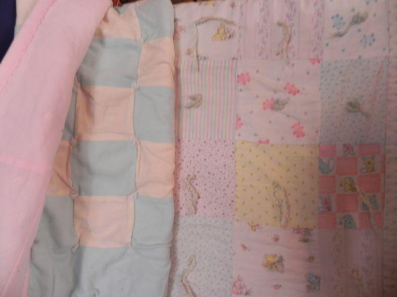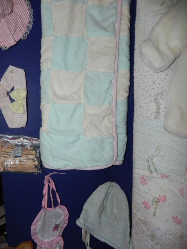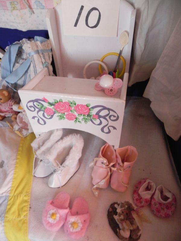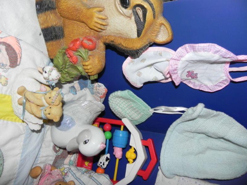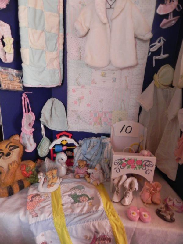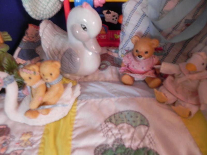 HAND SEWN BABY BLANKET/QUILT, WOOD CHAIR MADE BY THE AMISH, COLLECTABLE FIGURINES,