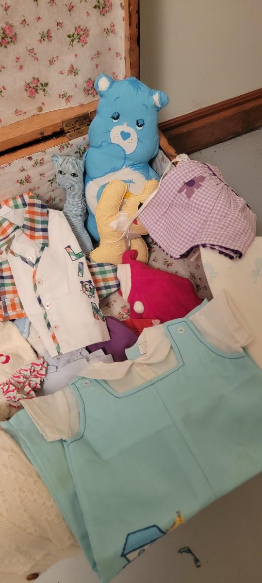 28" x 20" x 13" trunk Suze. Adorable selection of baby clothes included with storage piece.