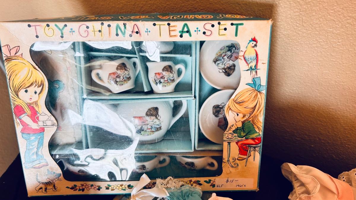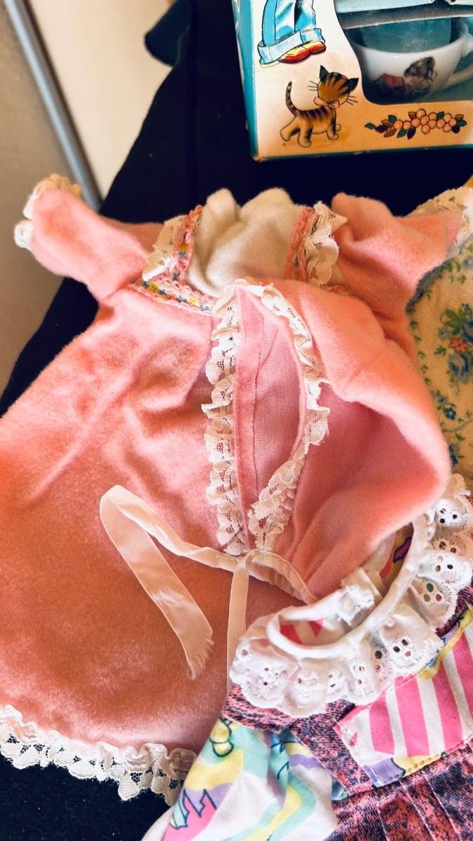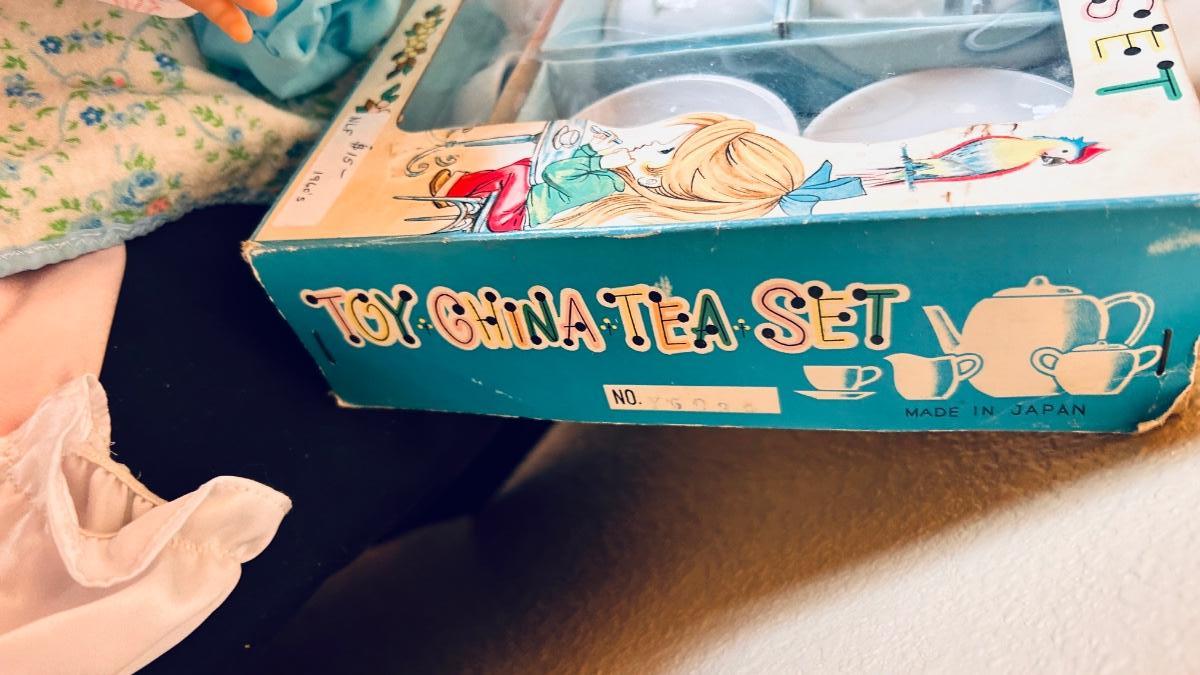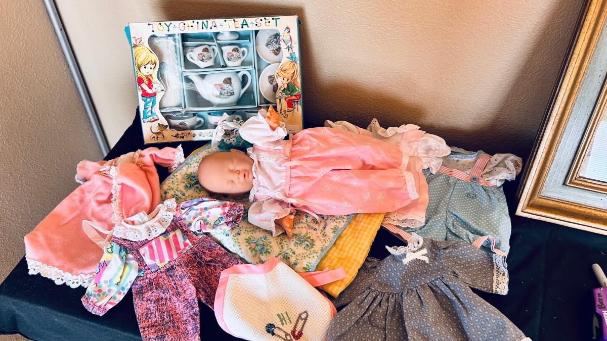 BABY DOLL, CLOTHES AND A PLAY TEA SET